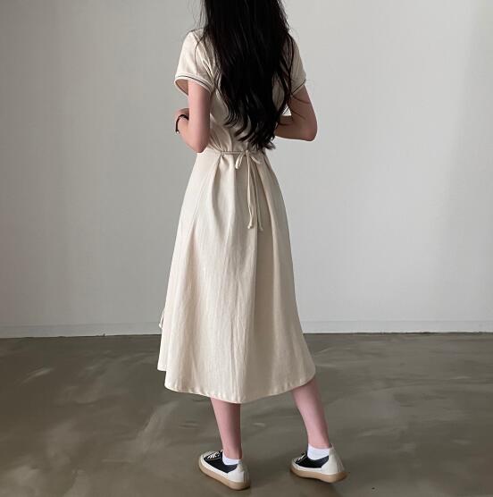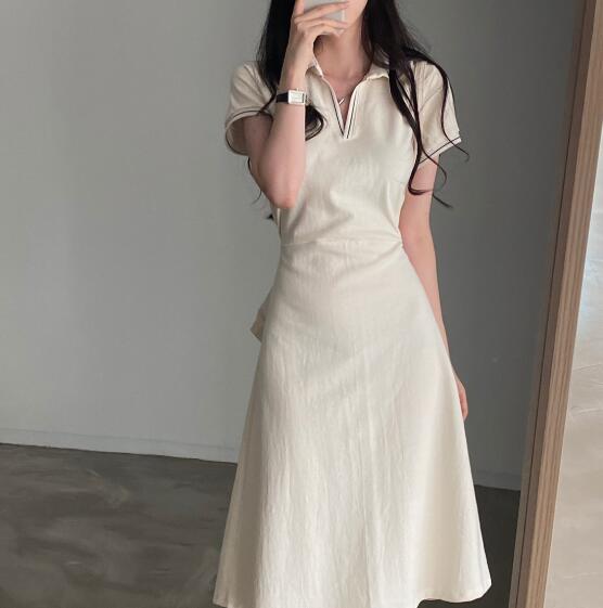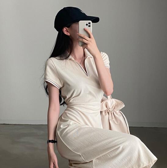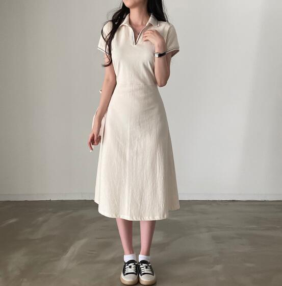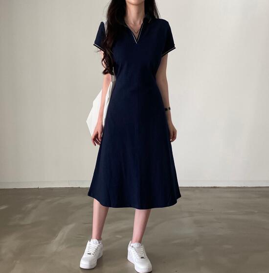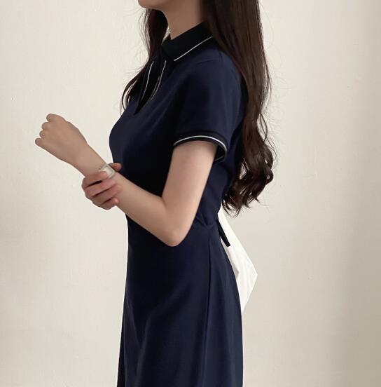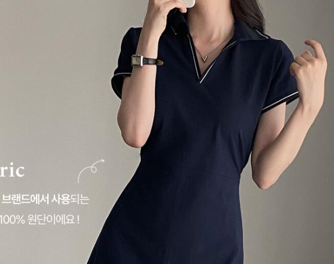 上品なブイネックデザインが魅力的な半袖ポロシャツワンピースです。