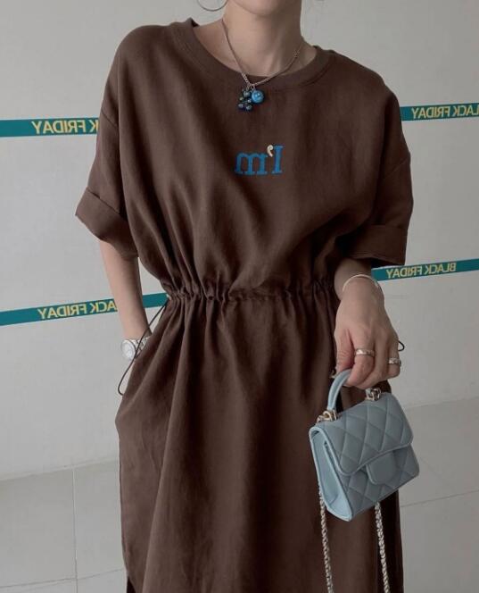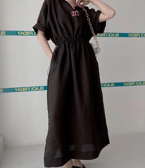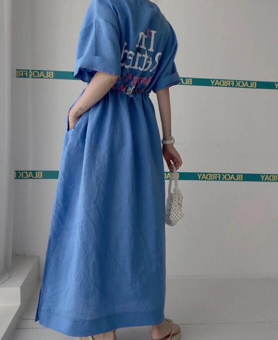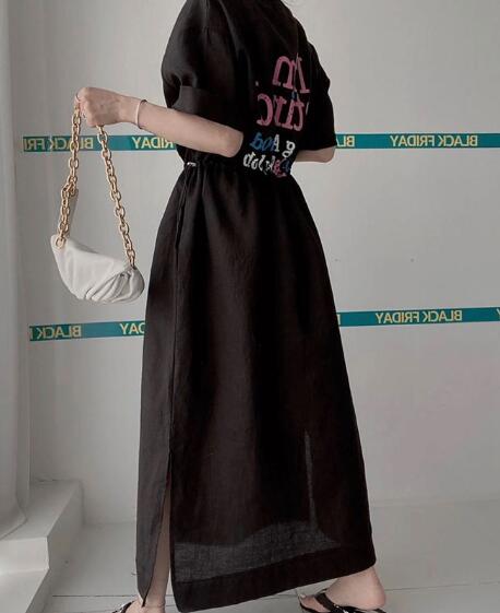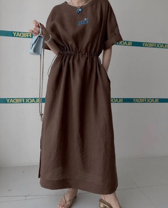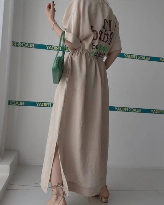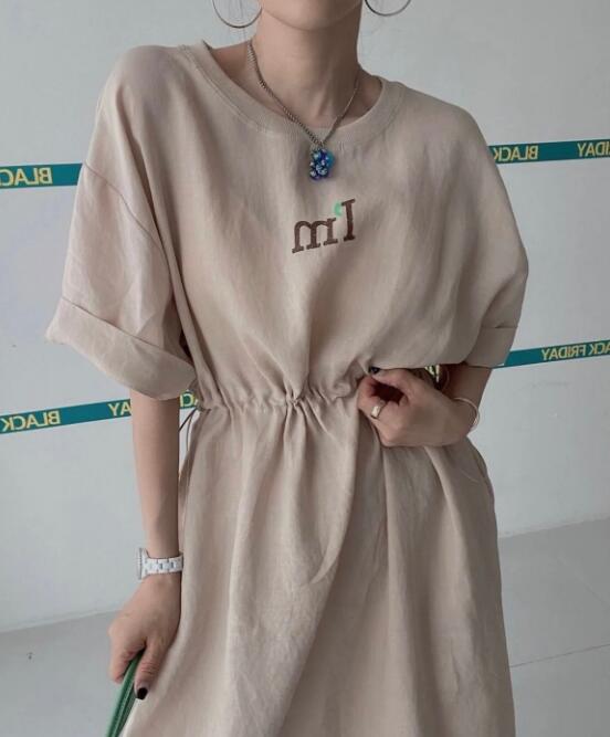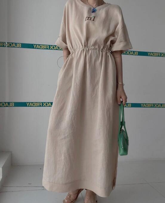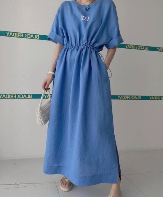 半袖でゆったりとした着心地のロングワンピースは、ウエスト部分のドローストリングで美しいシルエットを演出。