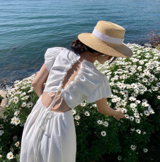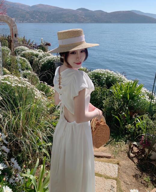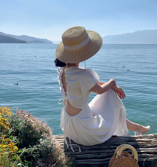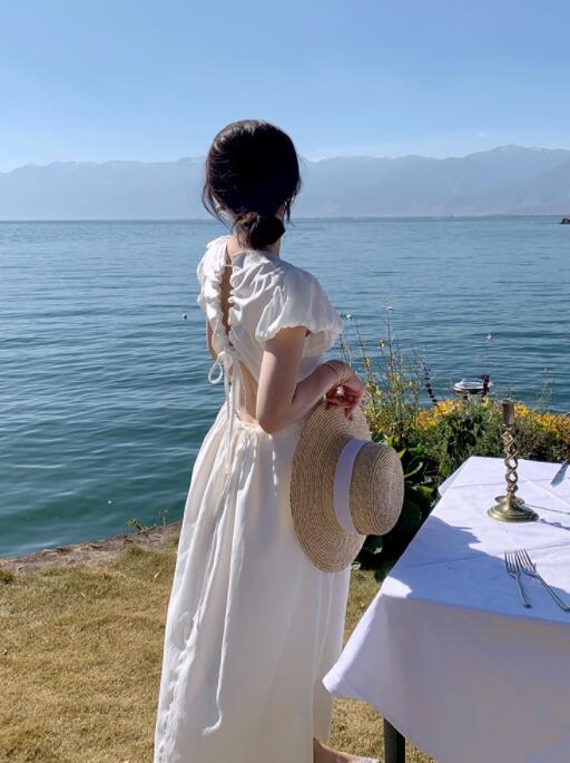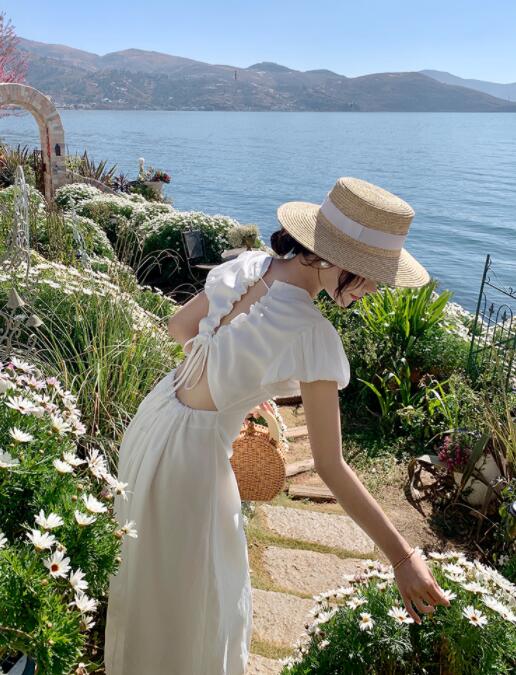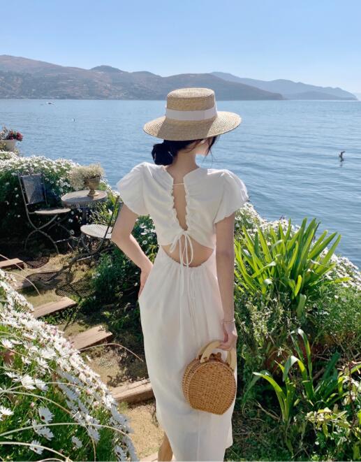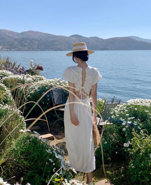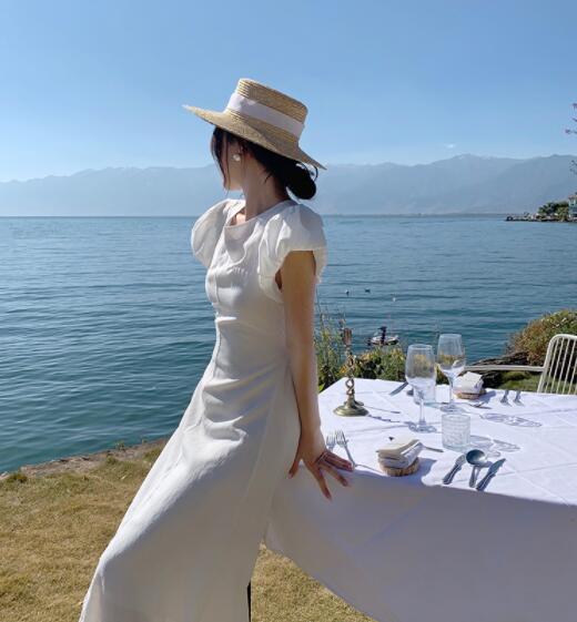 優雅なフリル袖が特徴的なロングワンピースです。背出しデザインで涼しく、夏の通勤や旅行にぴったり。