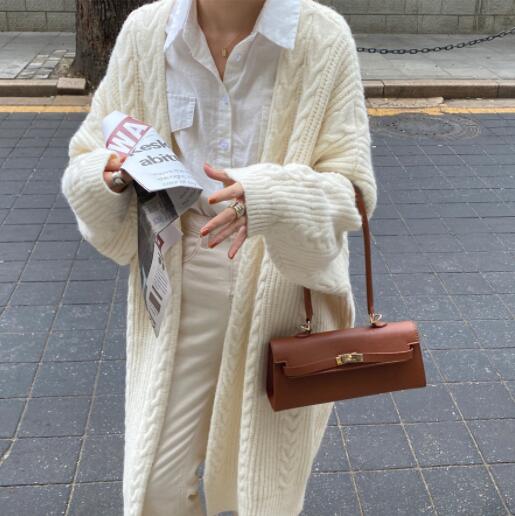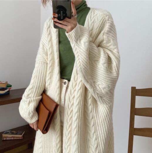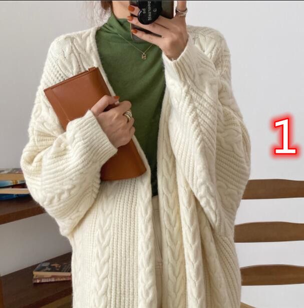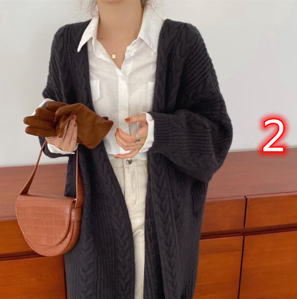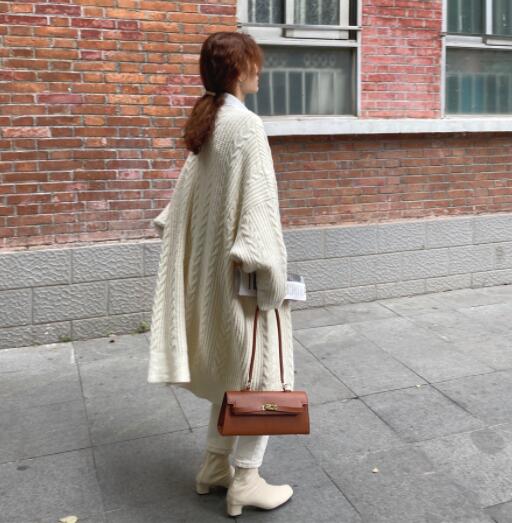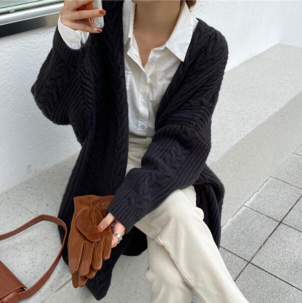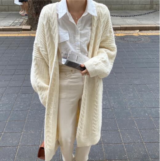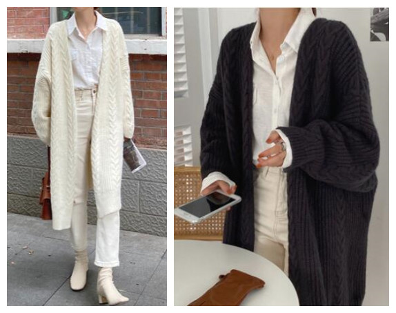 上品な編み柄が美しいニット羽織りは、ロングワンピースとの相性も抜群です。