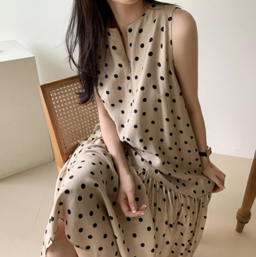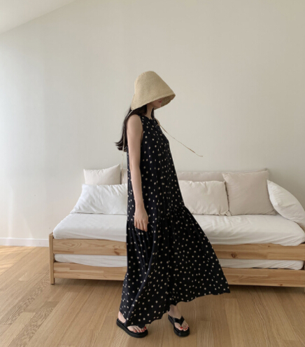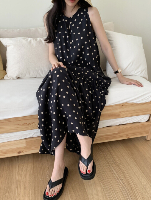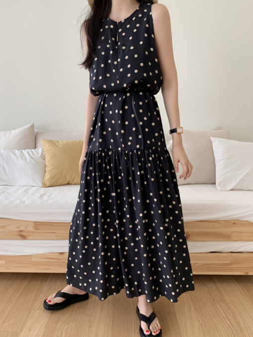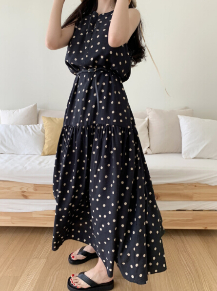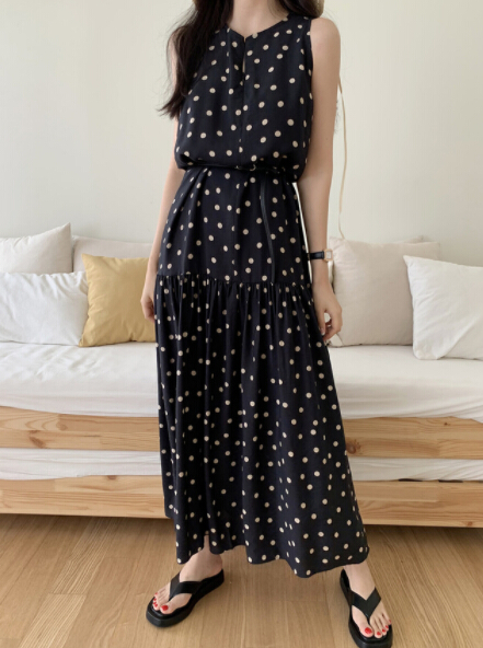 可愛いドット柄が魅力的な夏にぴったりのノースリーブワンピースです。