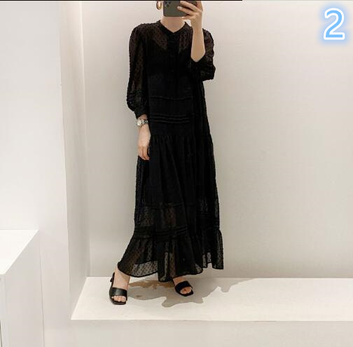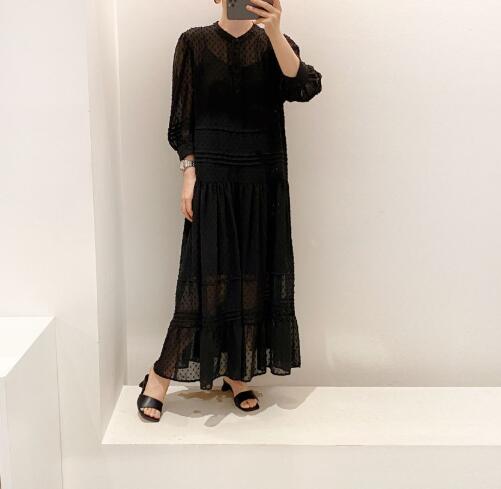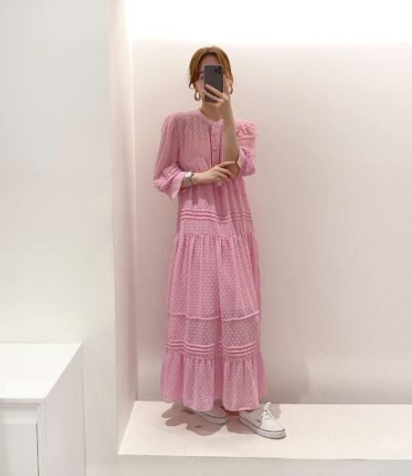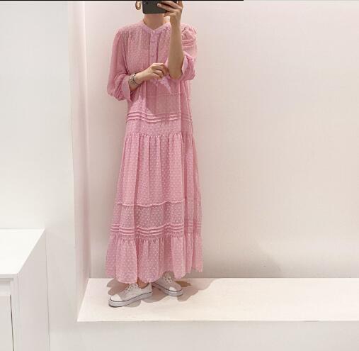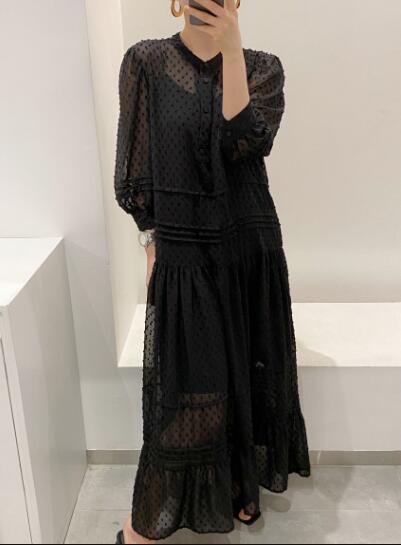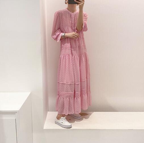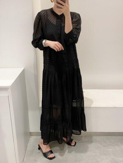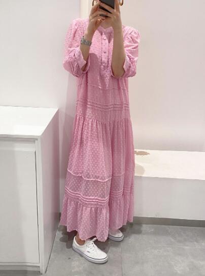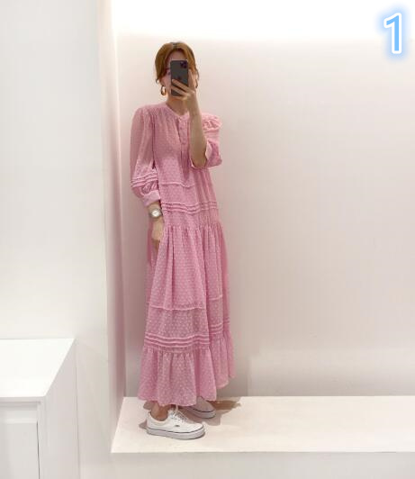 上品なドット柄が魅力的なマキシ丈のロングワンピースです。