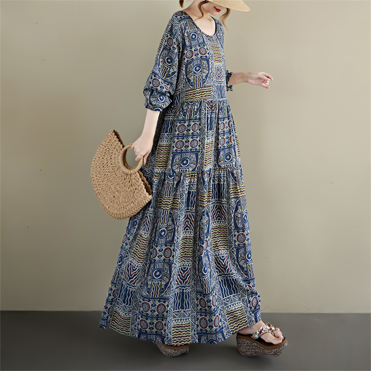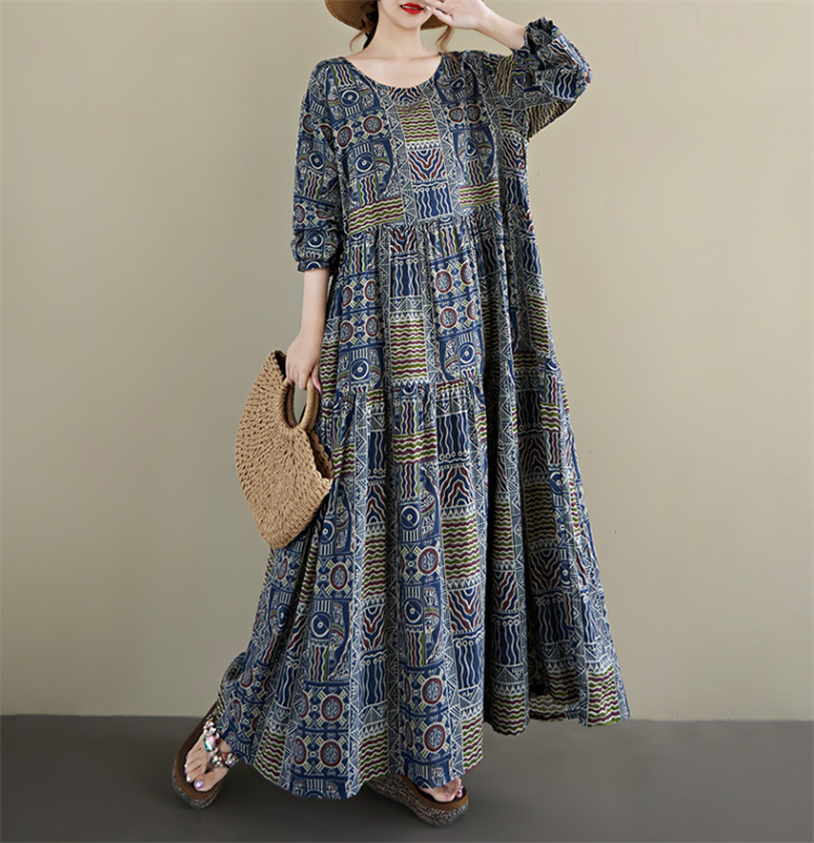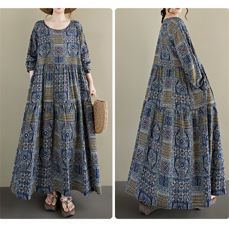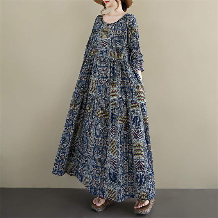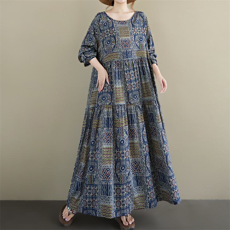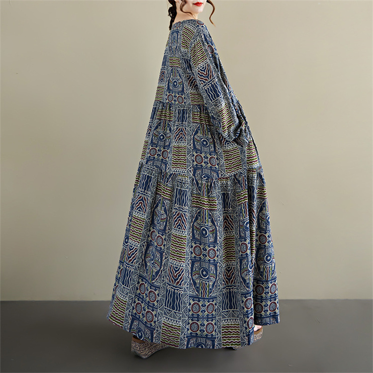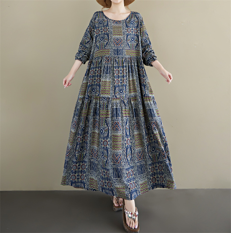 2025年秋の新作、幾何学模様が美しい丸首長袖のロングワンピース。