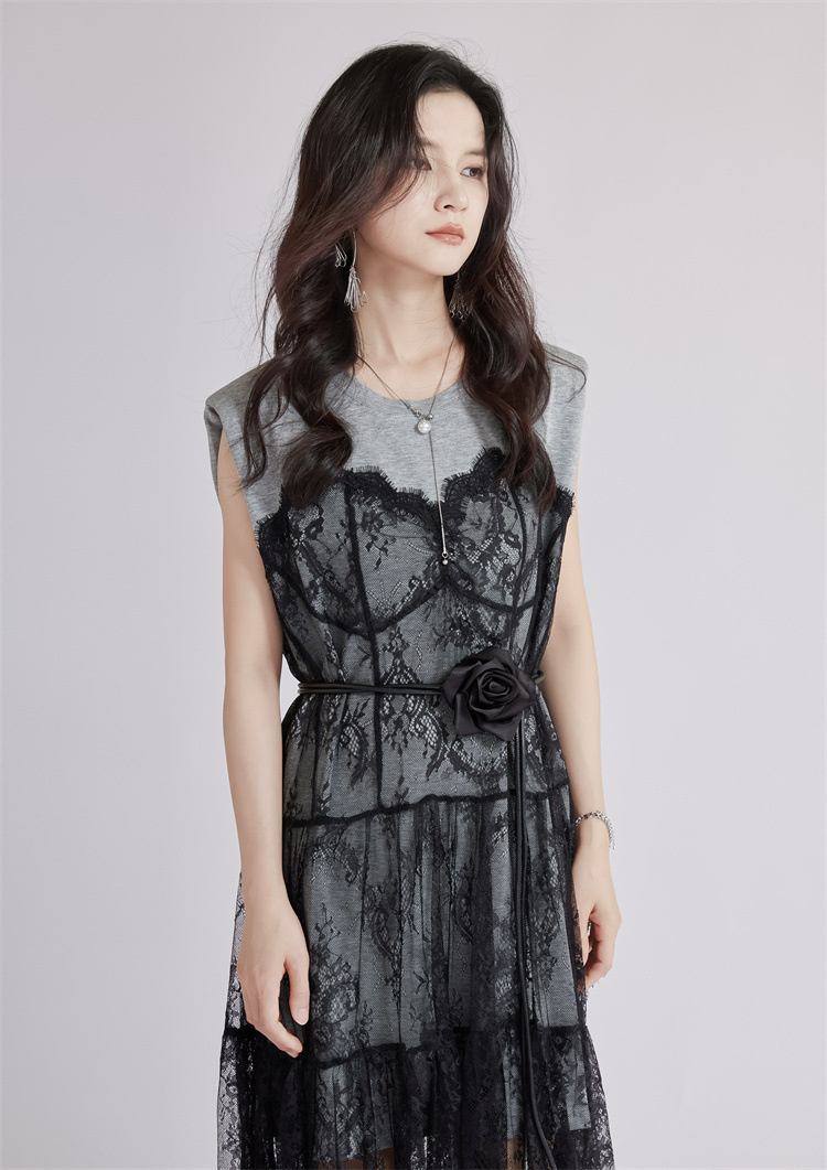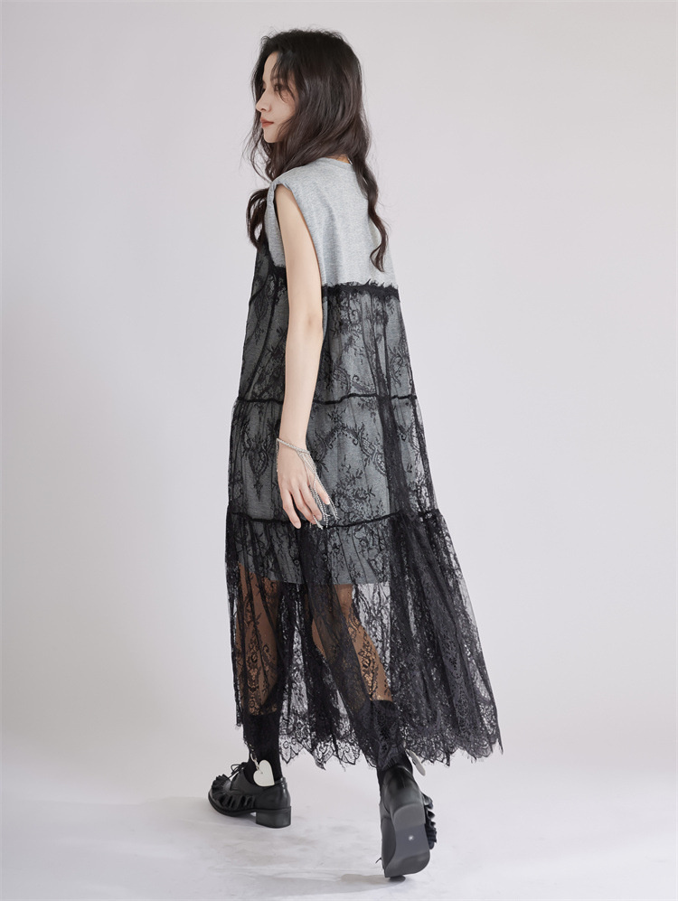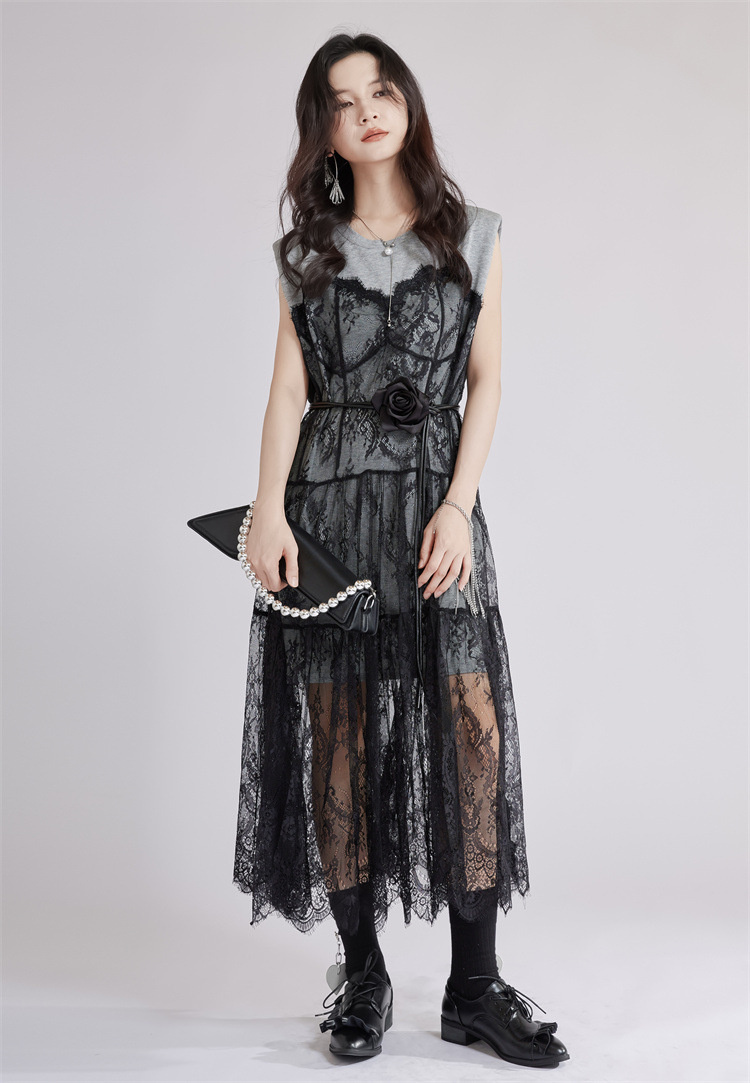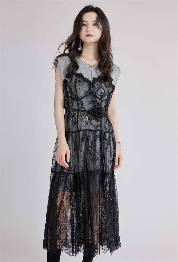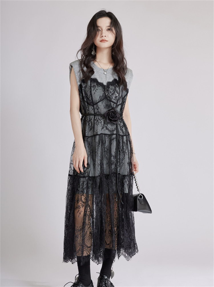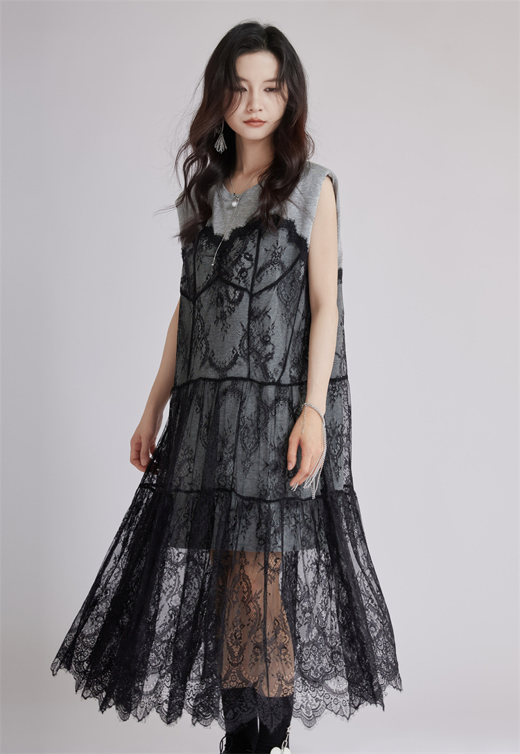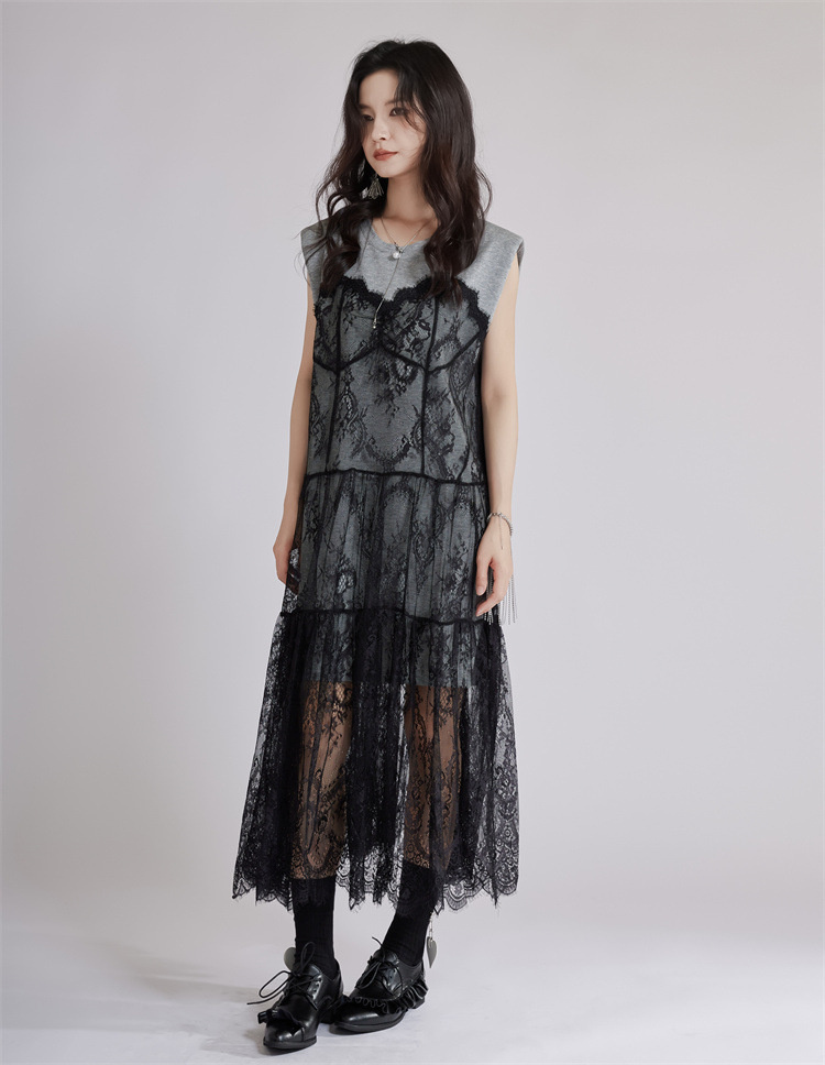 エレガントなレース素材のキャミ重ね着風ロングワンピースです。