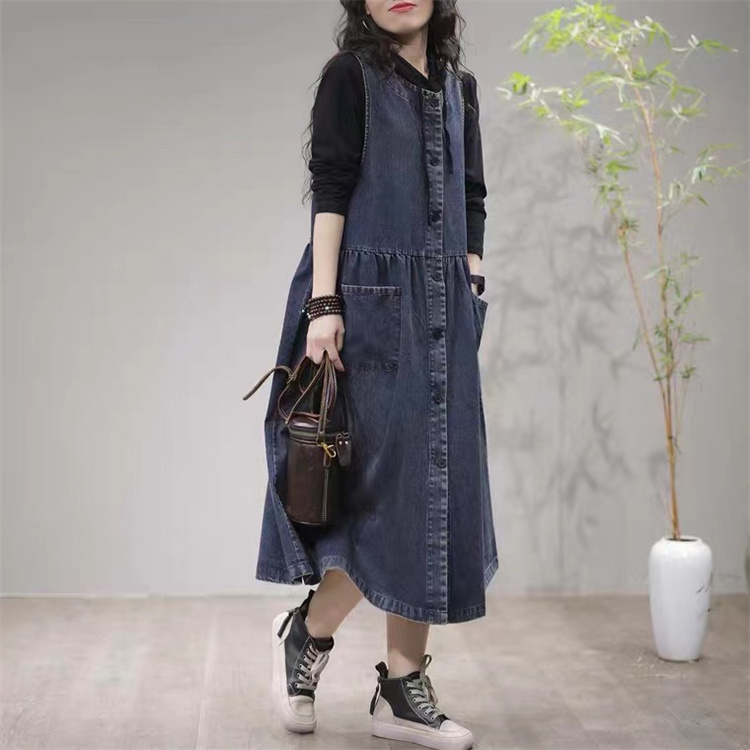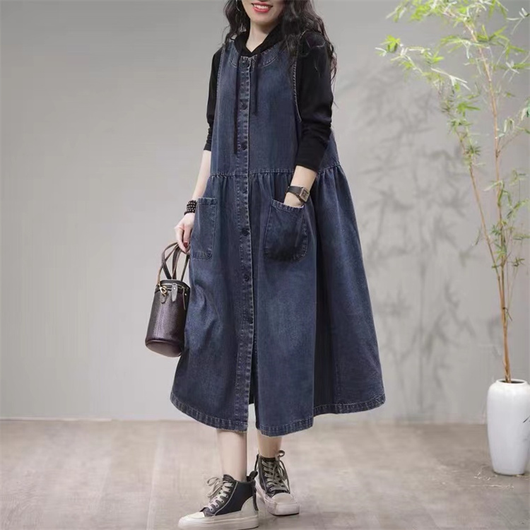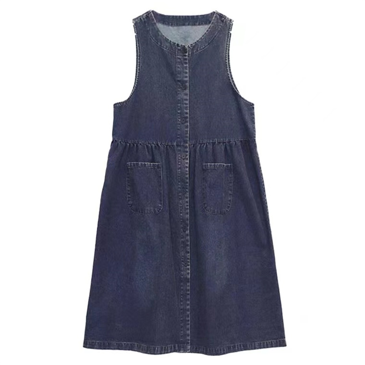 カジュアルなジャンパースカートデザインで、前開きボタンと両サイドポケットが機能的。