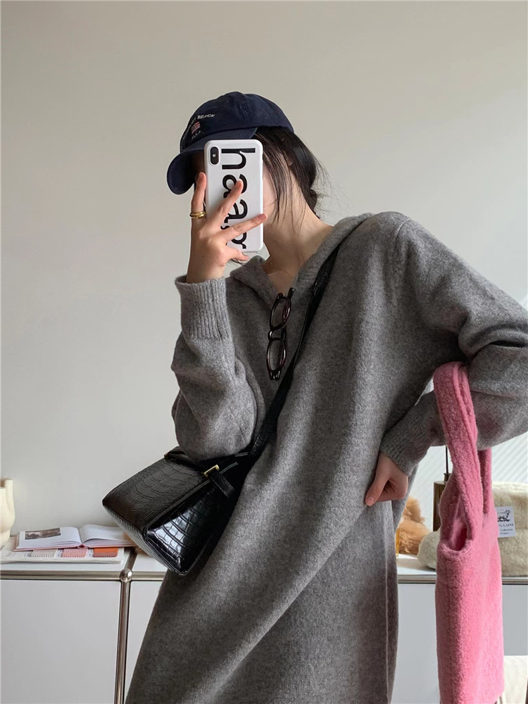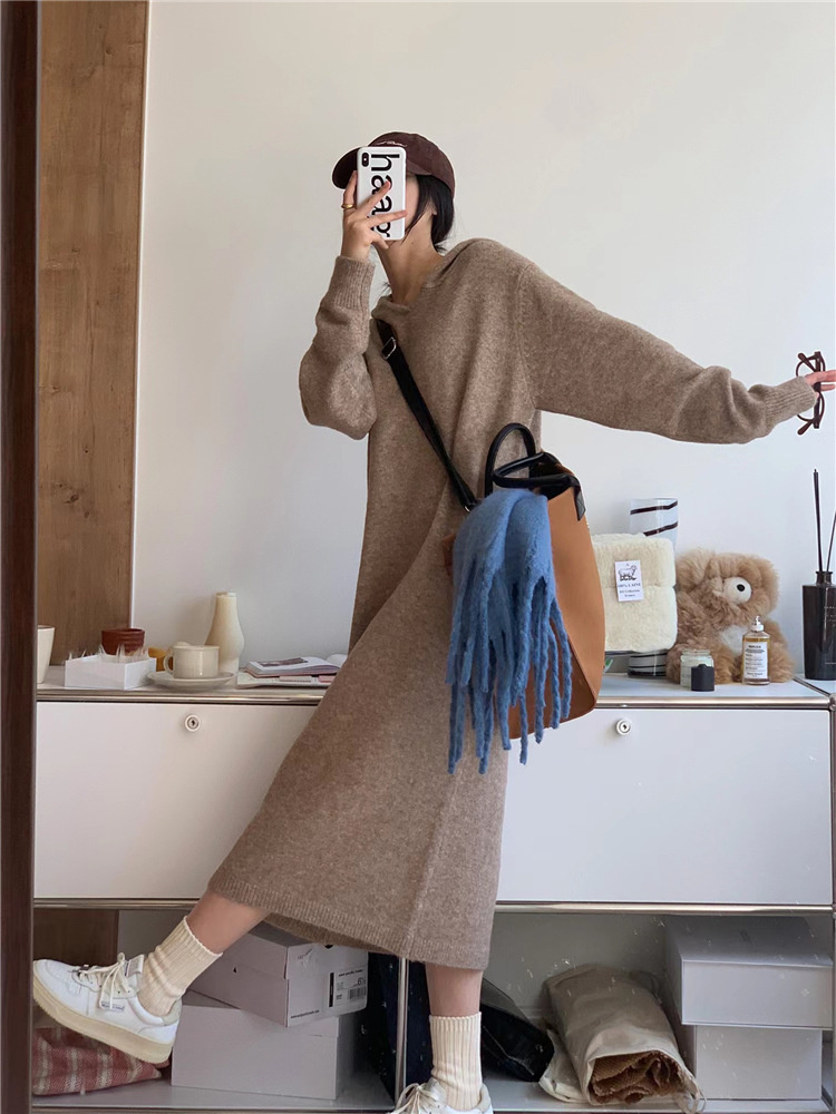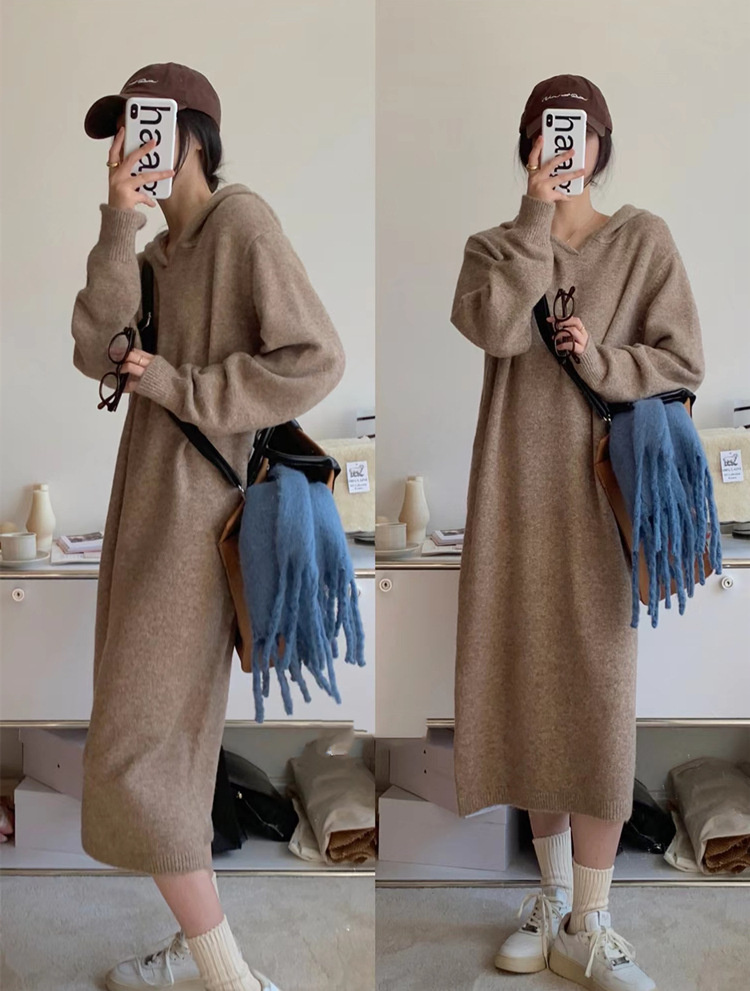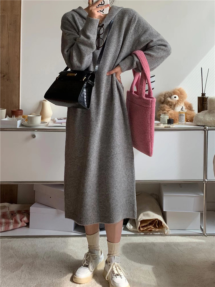 リラックススタイルを楽しめるフード付きニットのロングワンピースです。