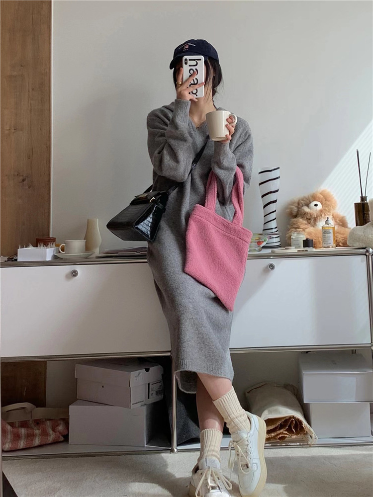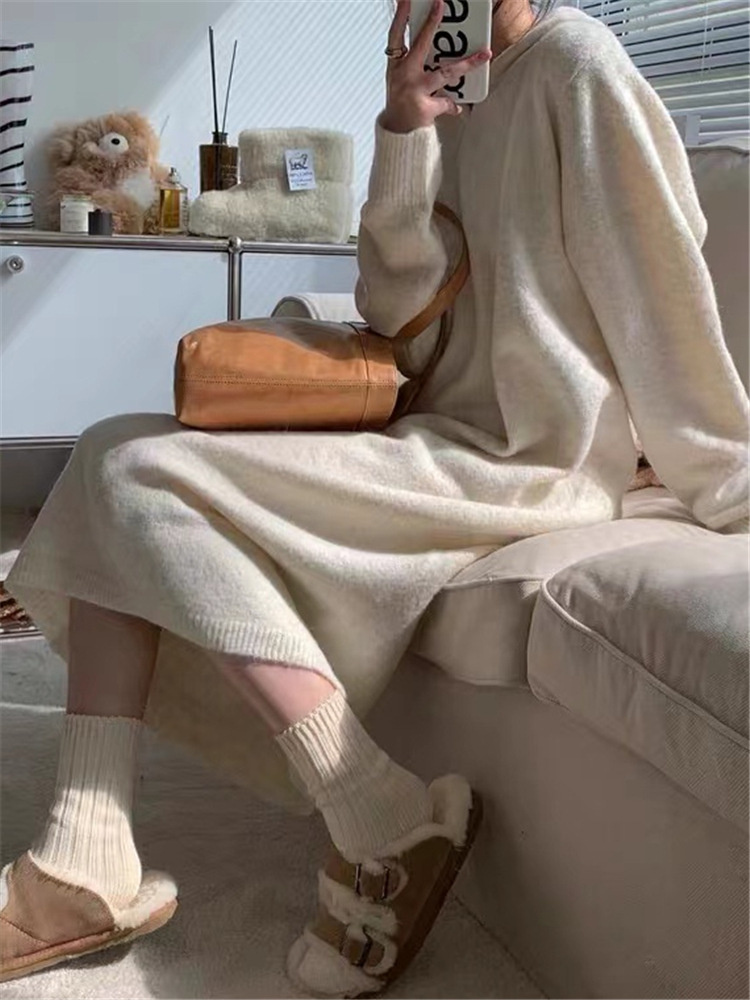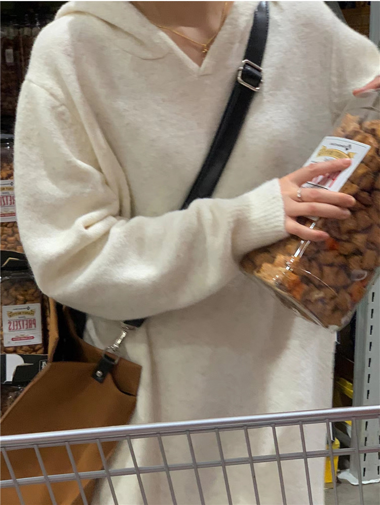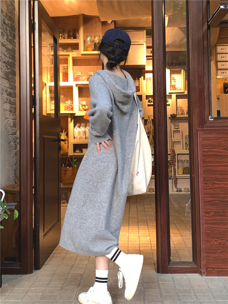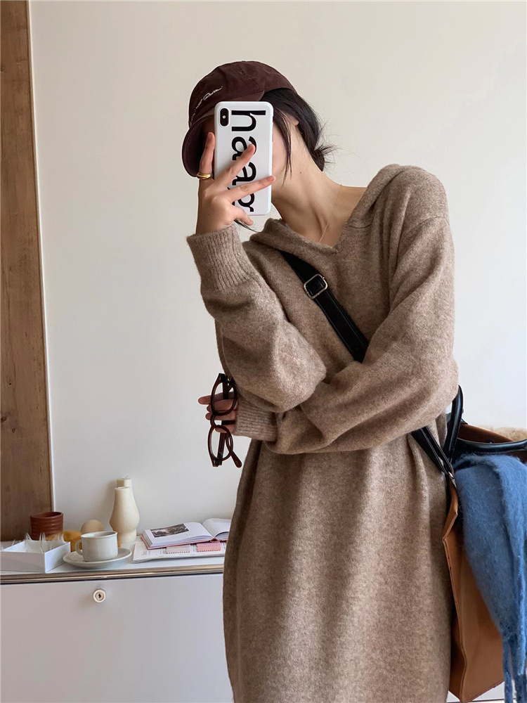リラックススタイルを楽しめるフード付きニットのロングワンピースです。