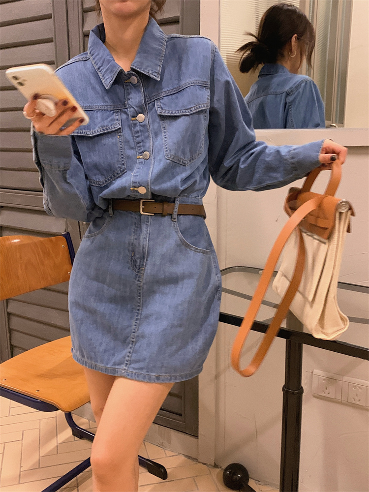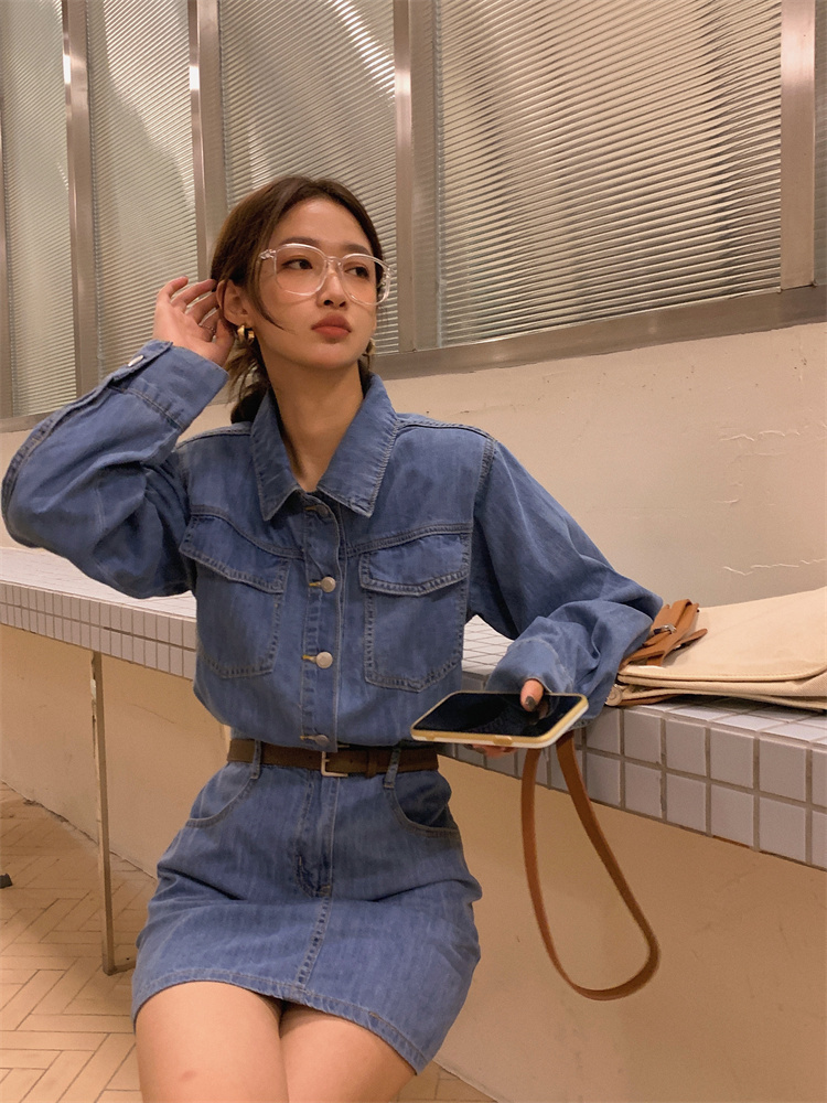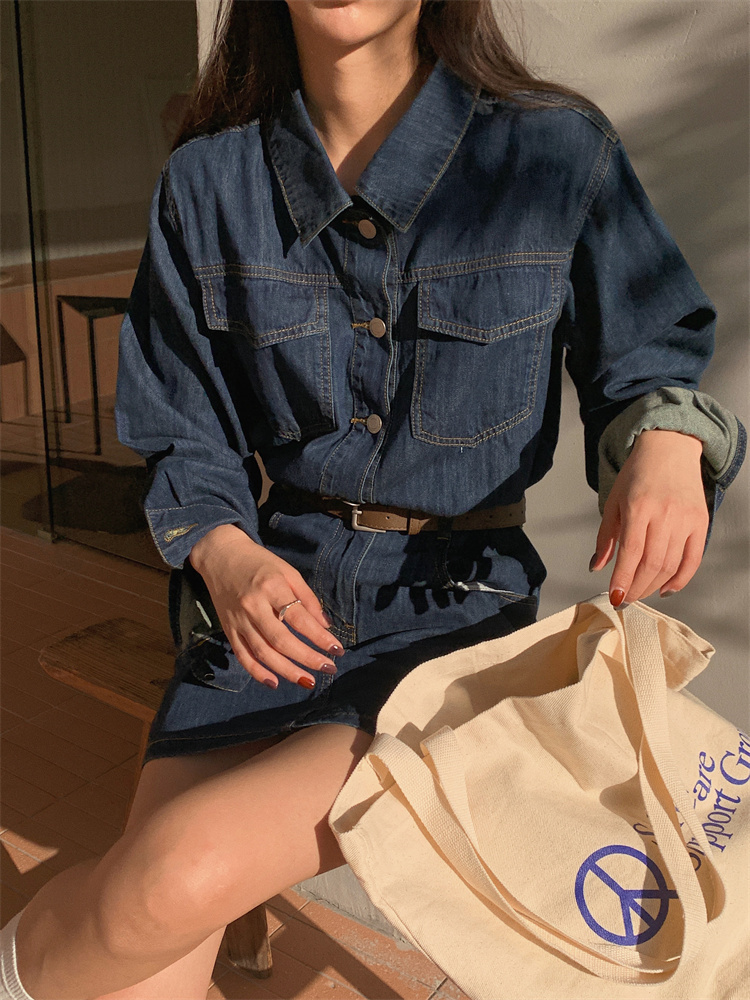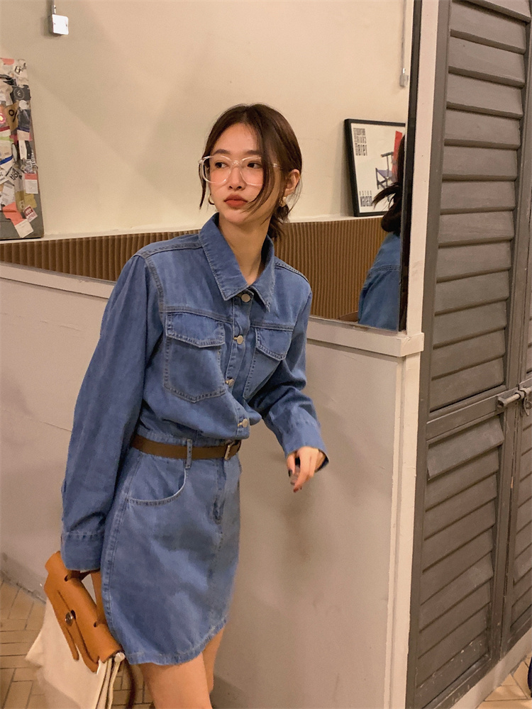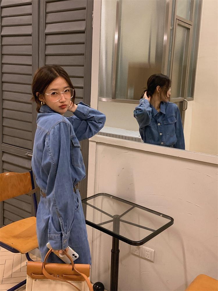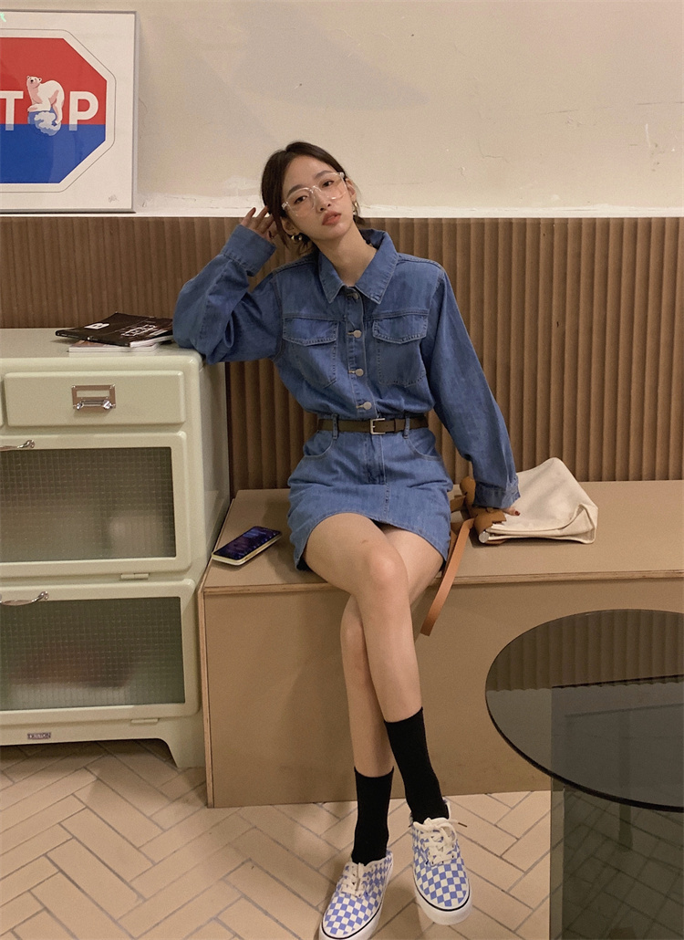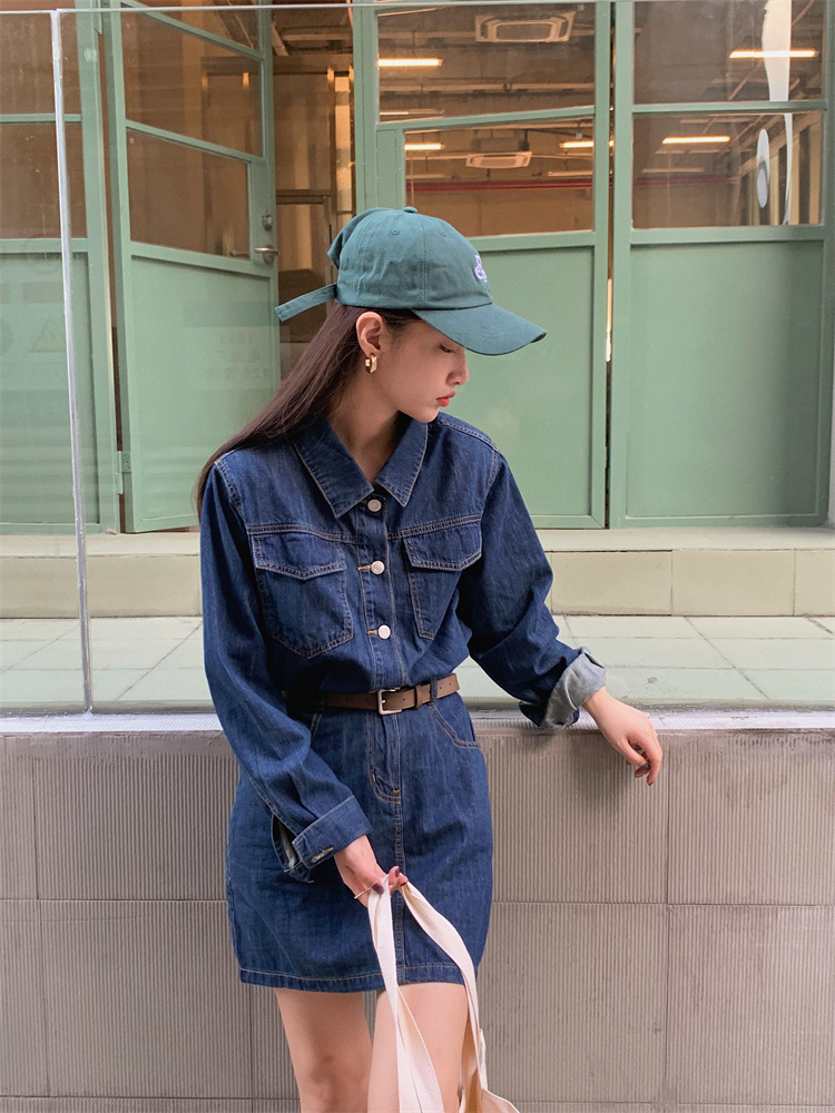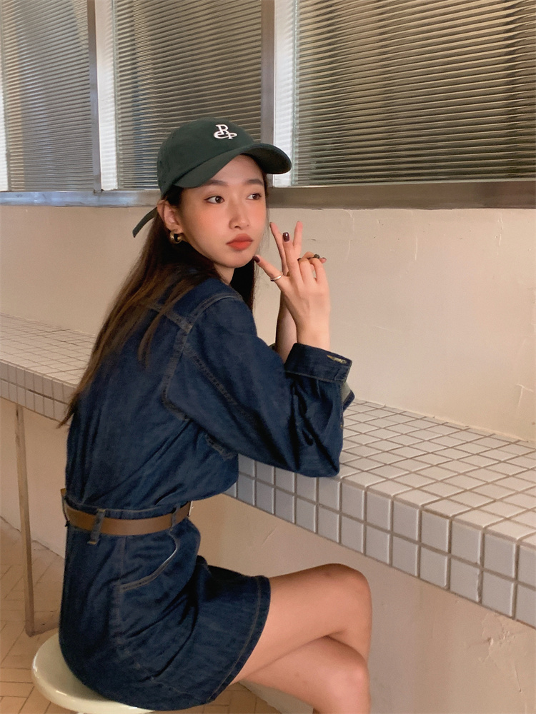 カジュアルなデニム素材の長袖ワンピースで、レトロなカレッジ風デザインが魅力的。