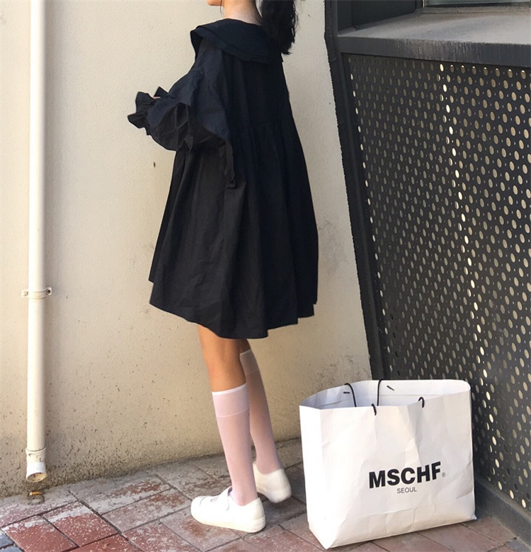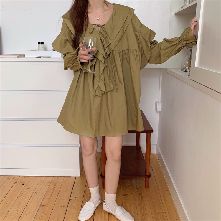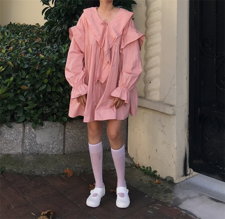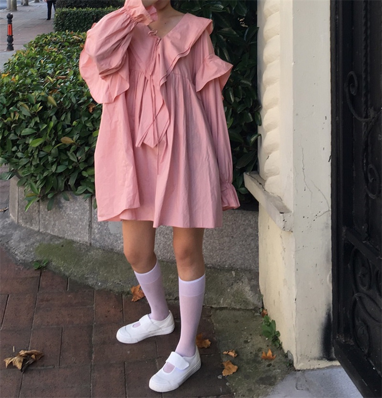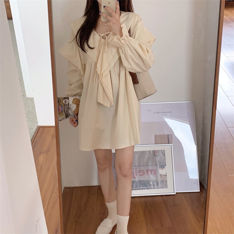 遊び心溢れるフリル襟とリボンデザインが魅力的な長袖ワンピース。