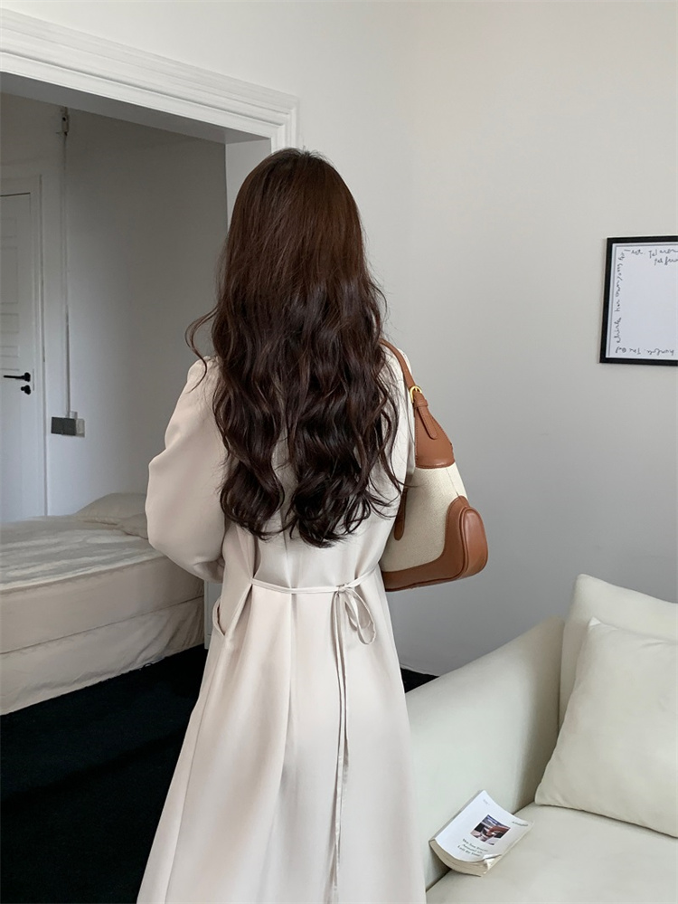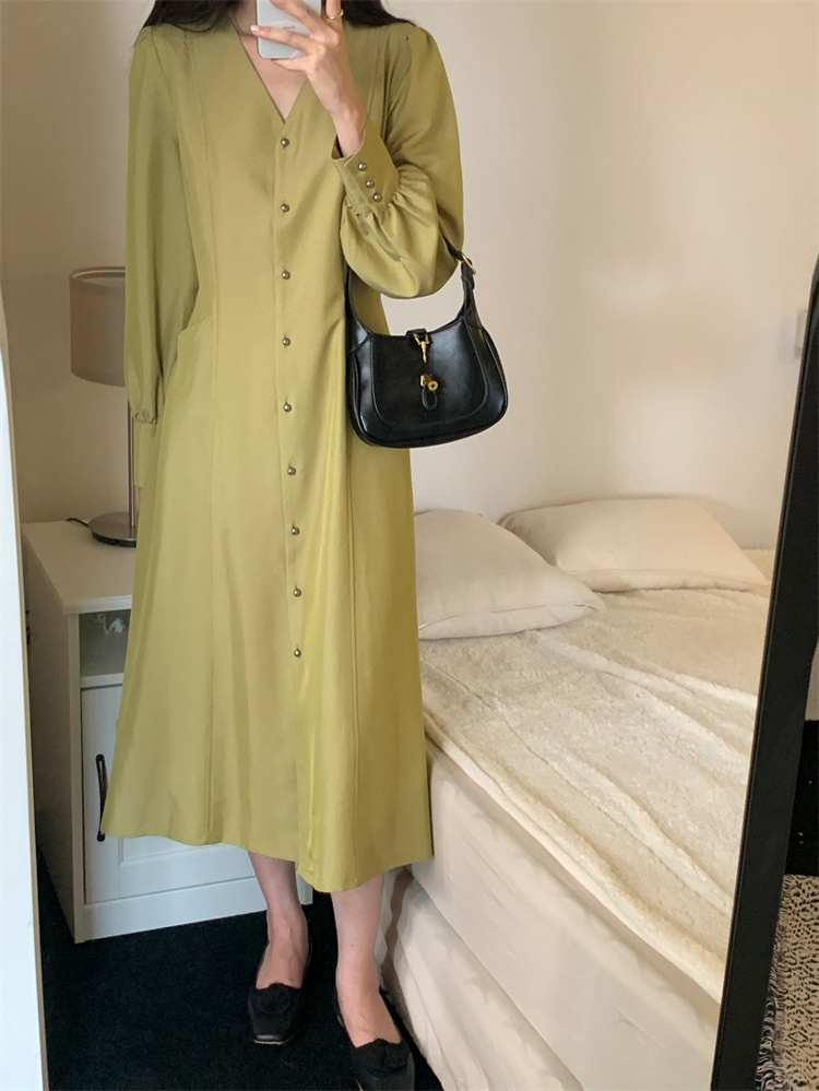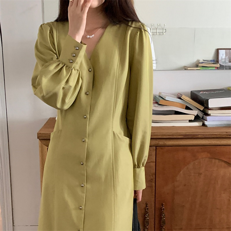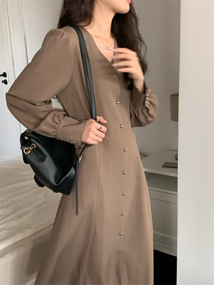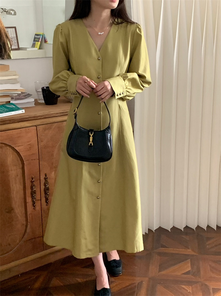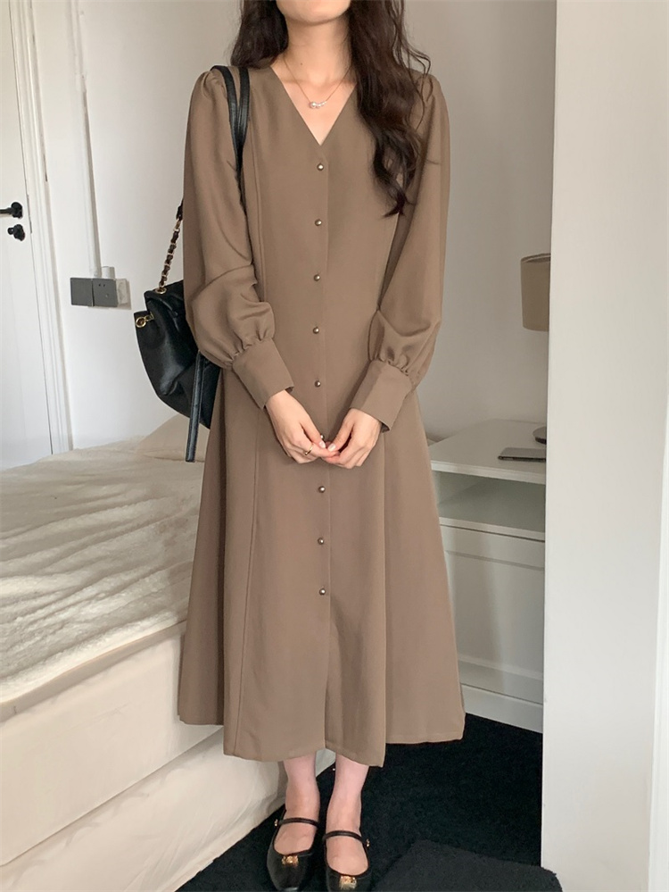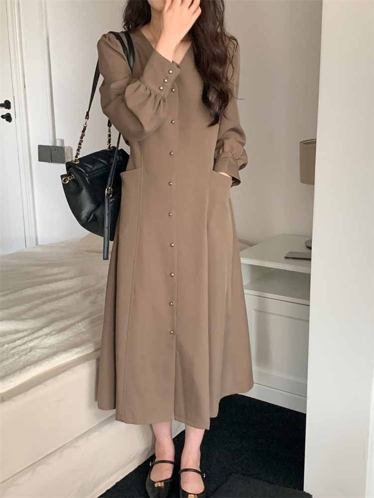 深首デザインが上品な印象を与えるシャツ風ロングワンピースです。