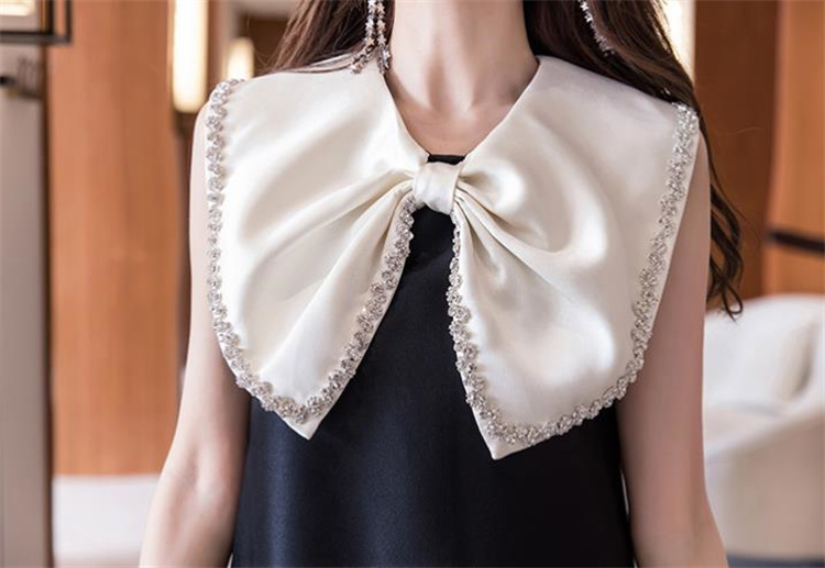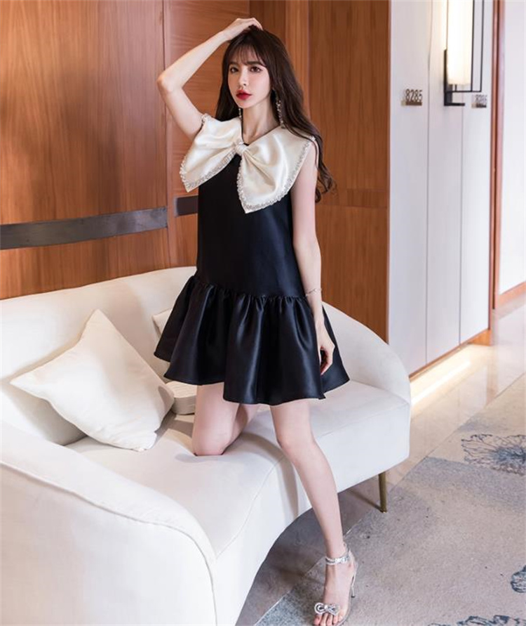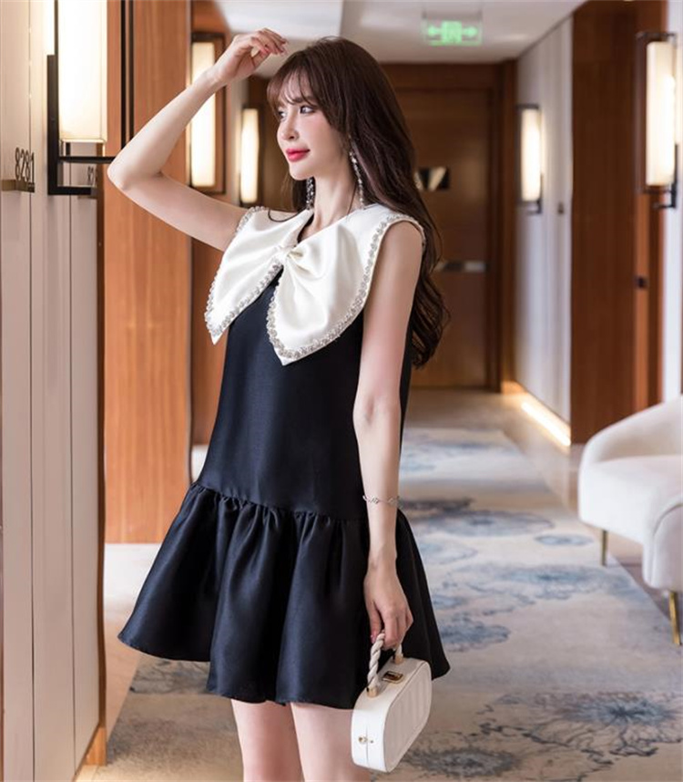 人形のような大きな蝶結び襟とフリルが可愛らしい袖なしワンピース。