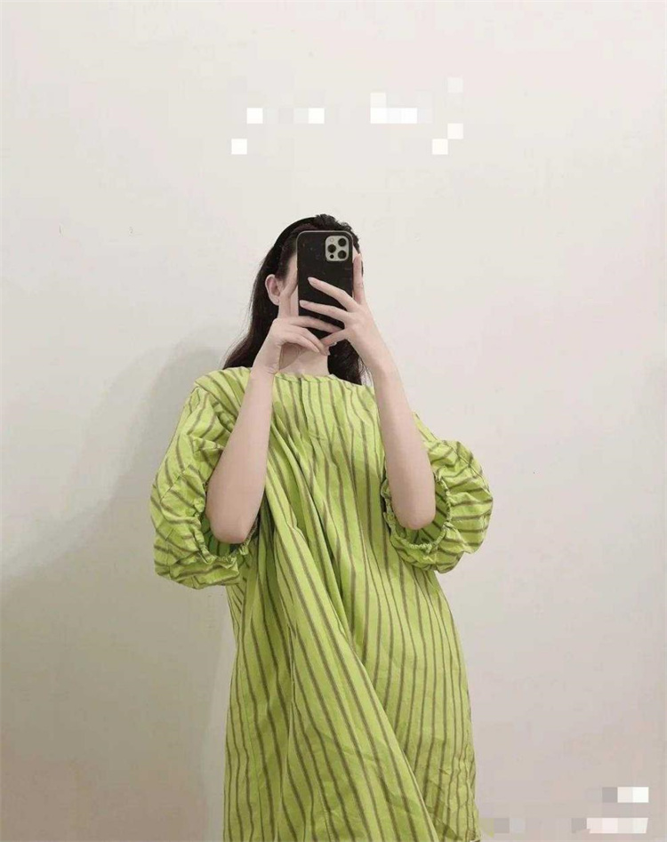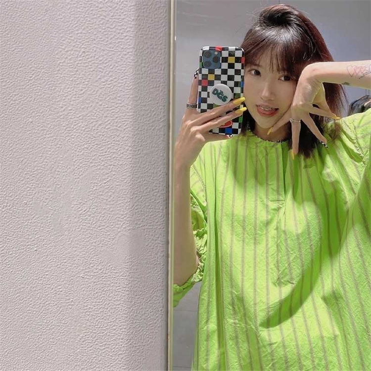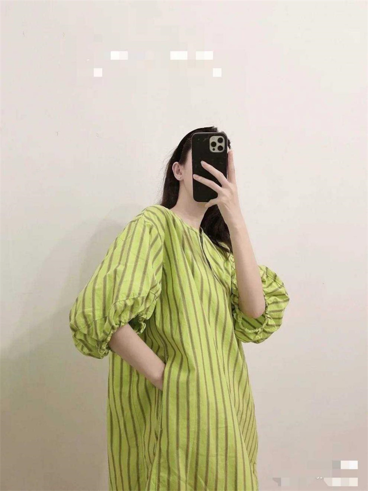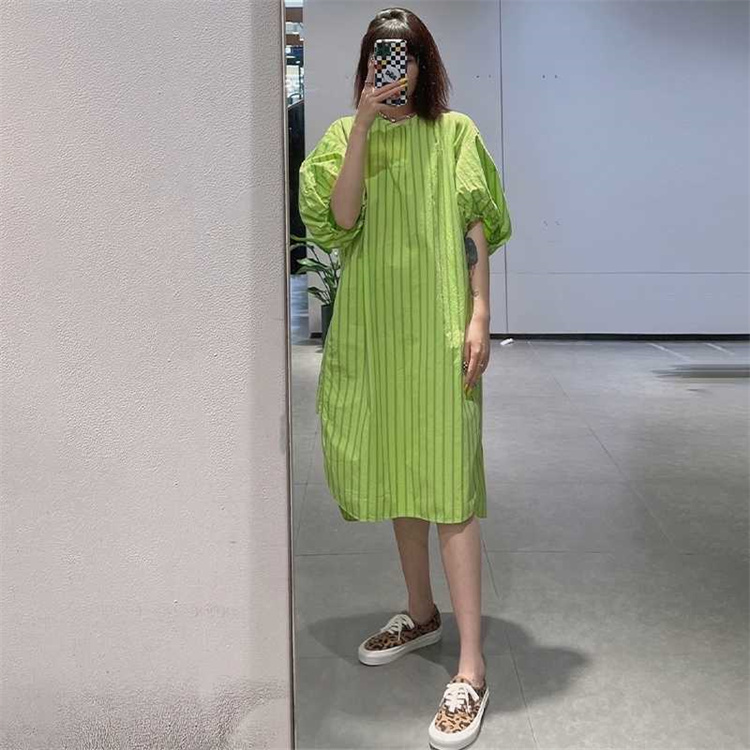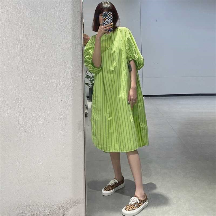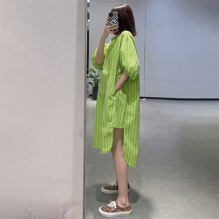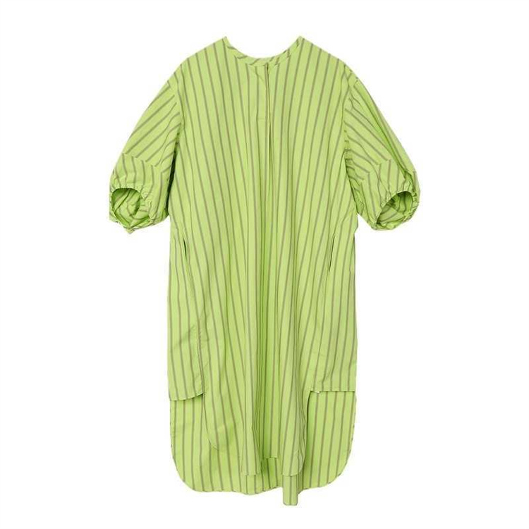 上品で爽やかなライムグリーンのストライプシャツワンピースです。
