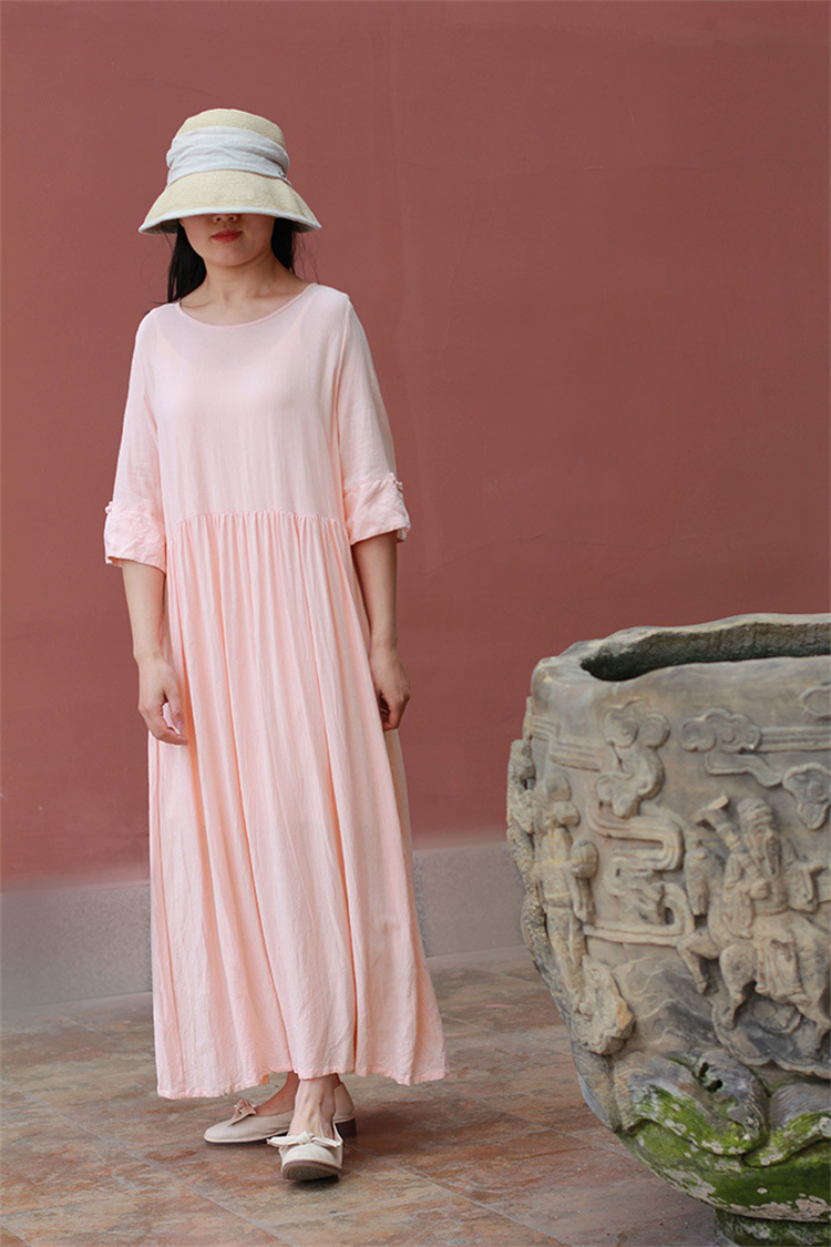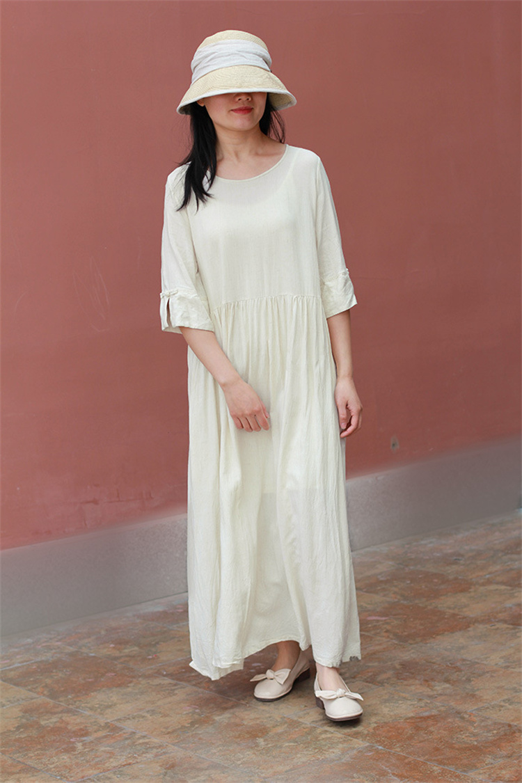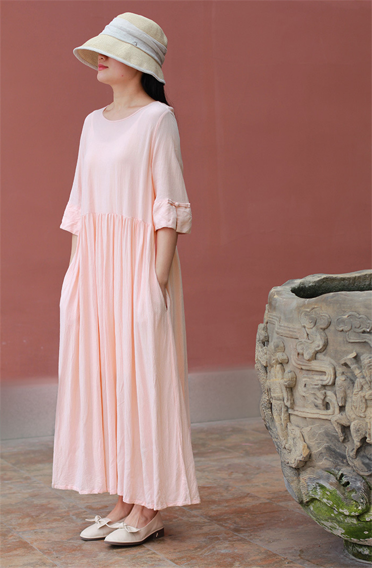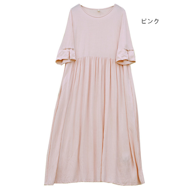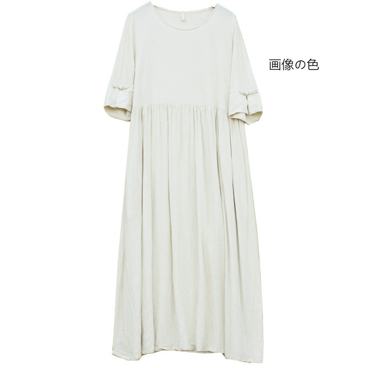 綿とポリエステル混紡素材の五分袖マキシワンピース。