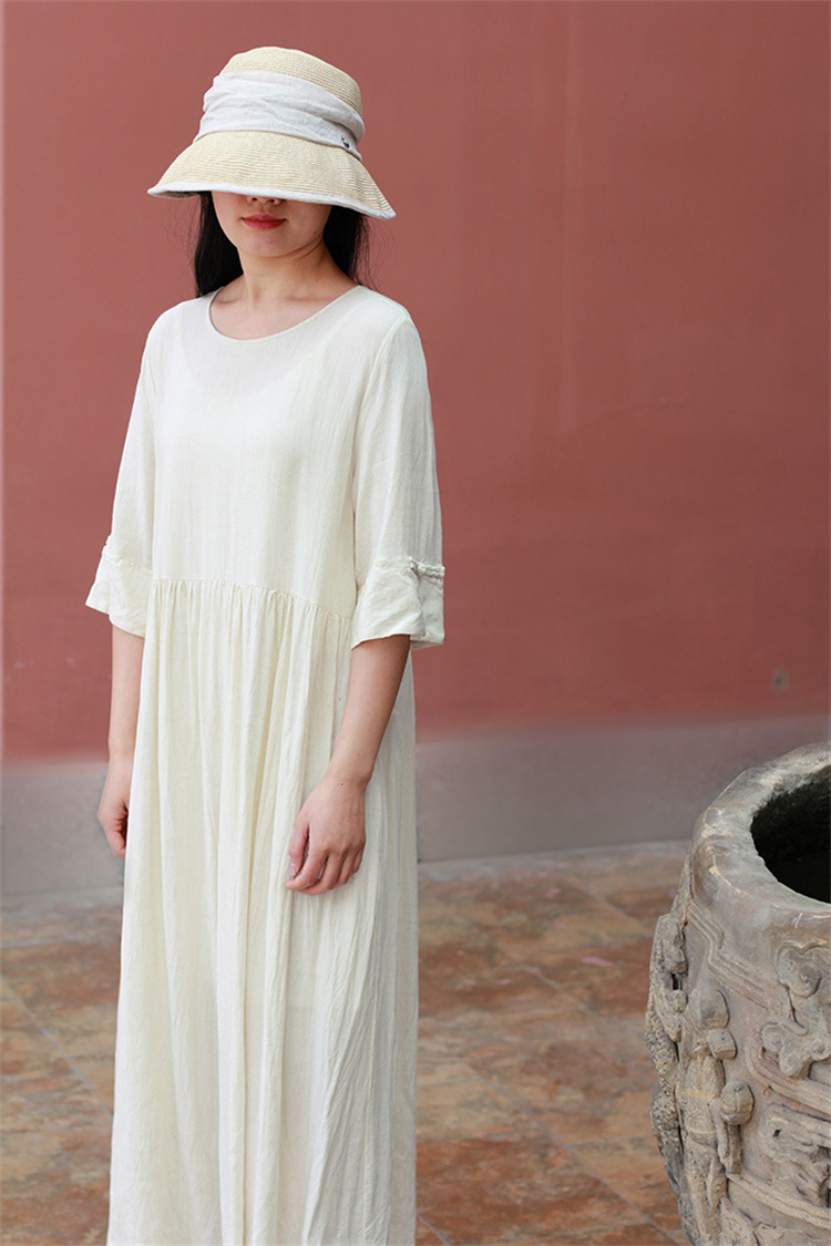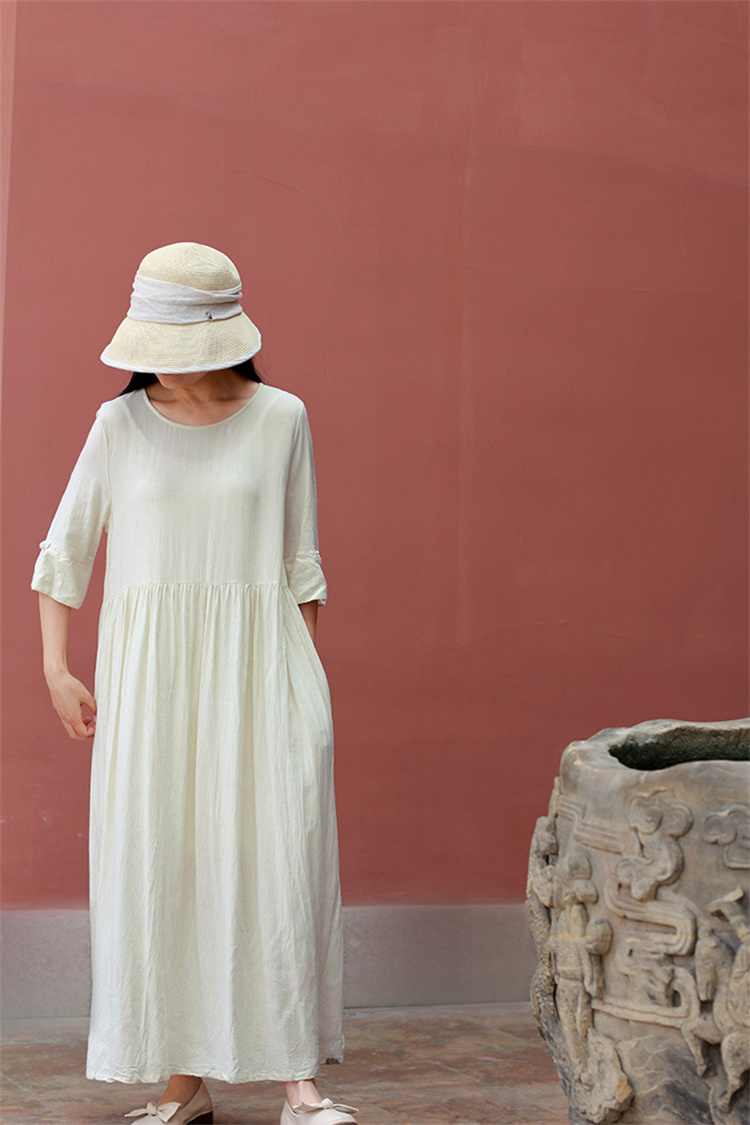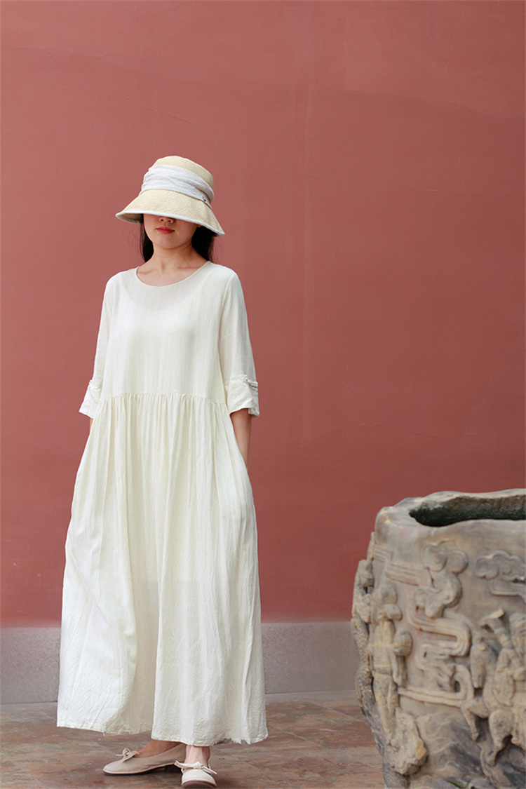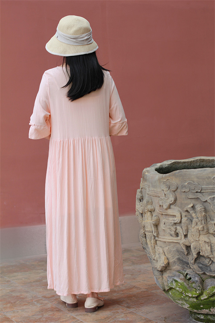 綿とポリエステル混紡素材の五分袖マキシワンピース。