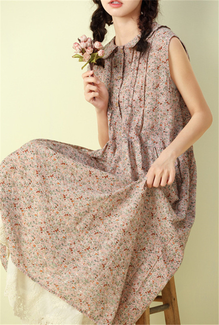 可愛らしい人形襟とプリーツが女性らしさを演出し、小花柄が上品な印象を与えます。