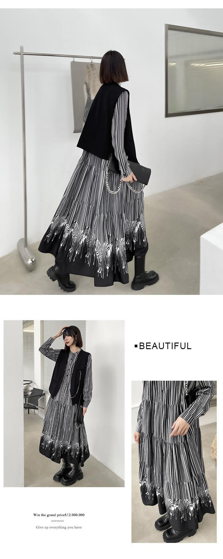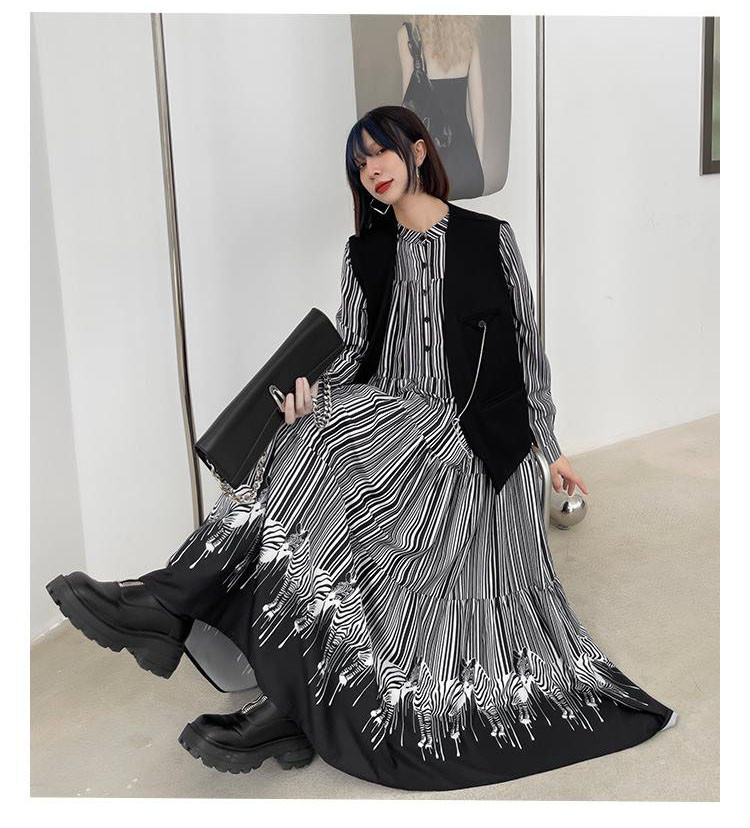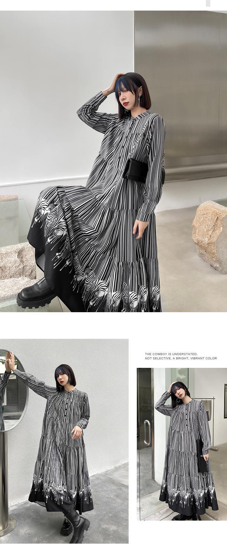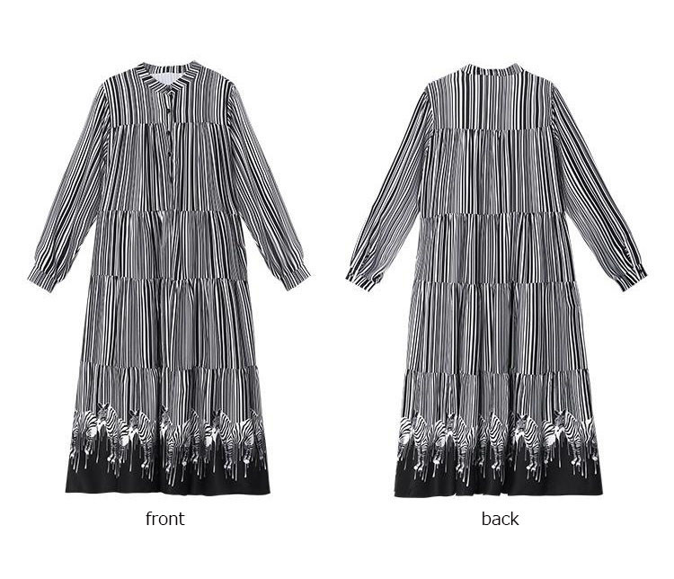 縦縞模様と裾の配色切り替えが印象的なデザインで、一枚で上品な着こなしが完成。
