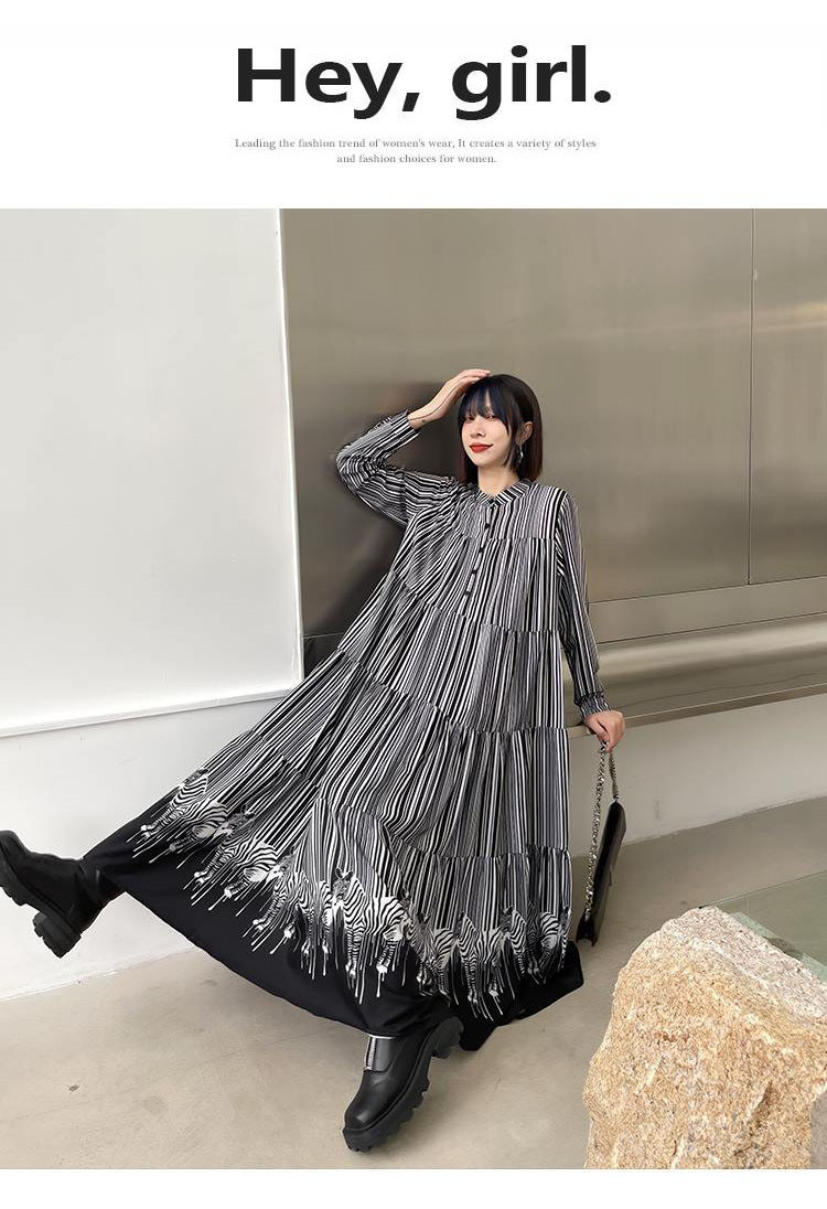 カジュアルからきれいめまで幅広く活躍するシャツ型のロングワンピース。 縦縞模様と裾の配色切り替えが印象的なデザインで、一枚で上品な着こなしが完成。 素材:ポリエステル・綿混合 カラー:黒×白の配色