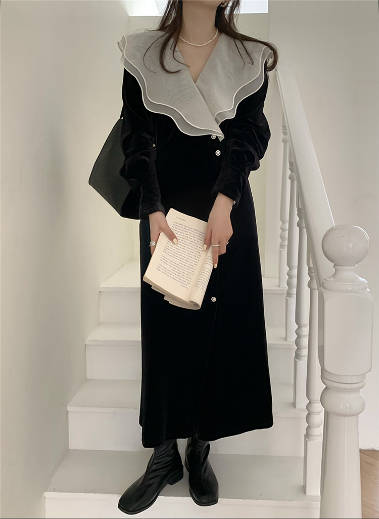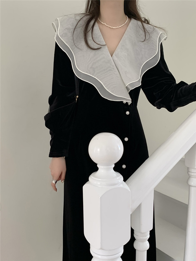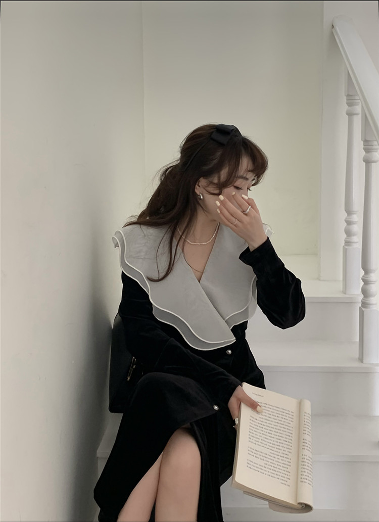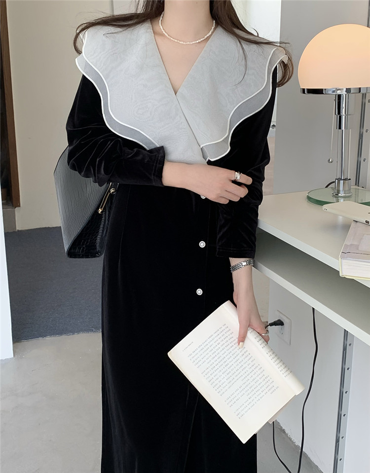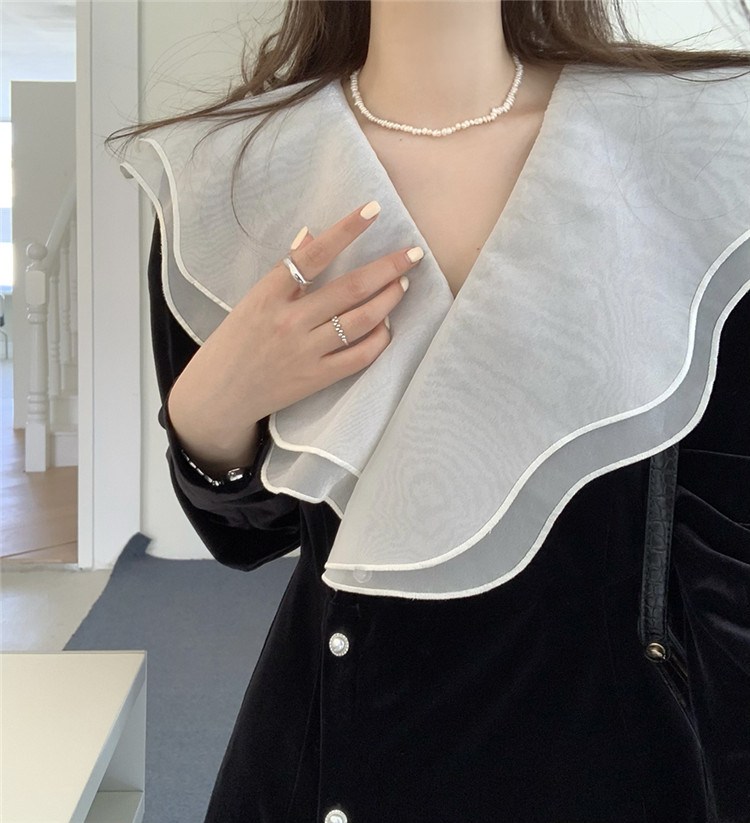 大きなフリル襟が個性的で、レトロな雰囲気を演出します。