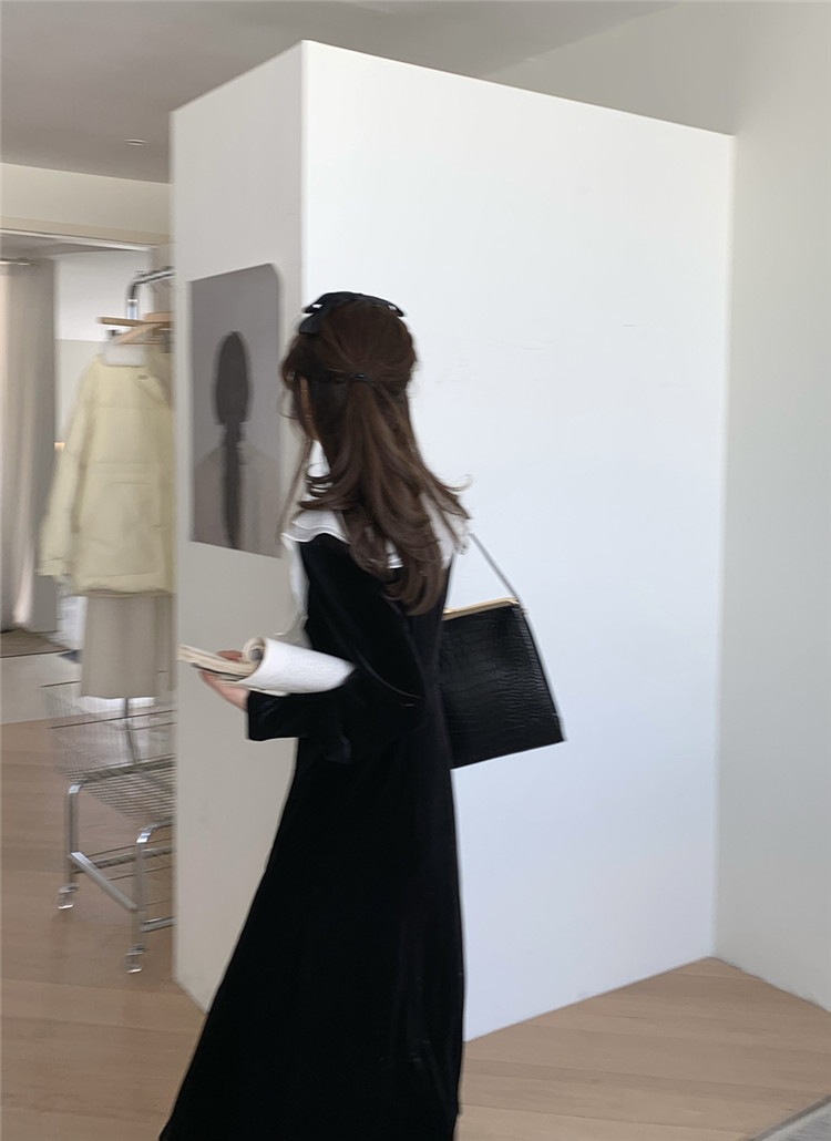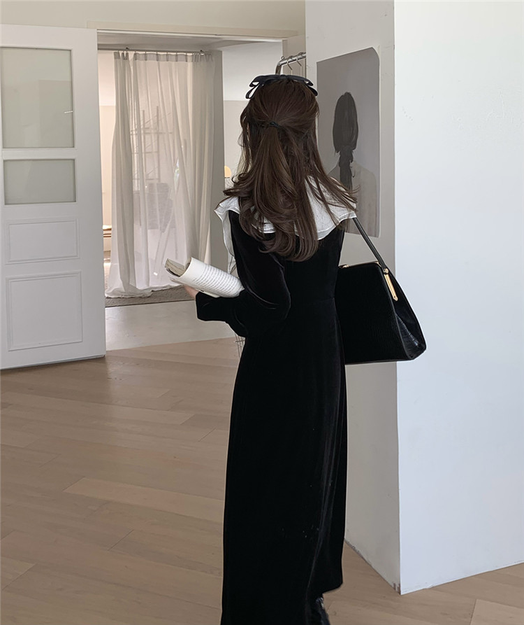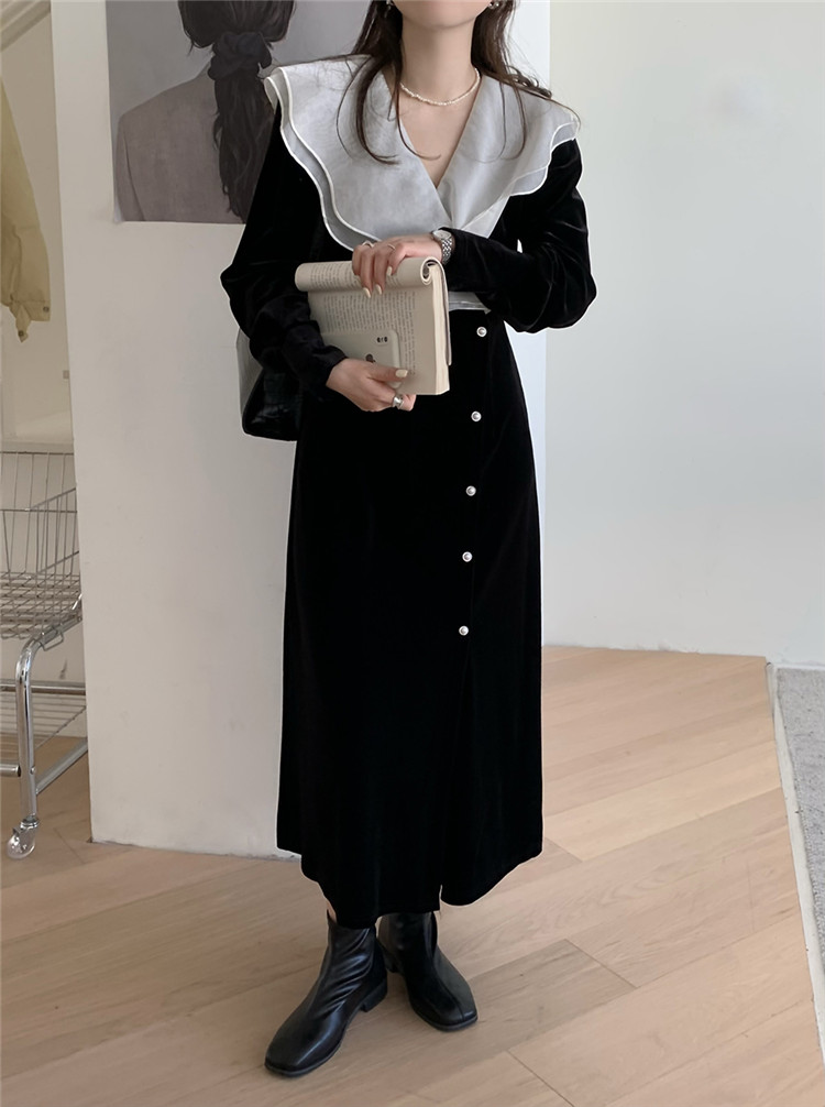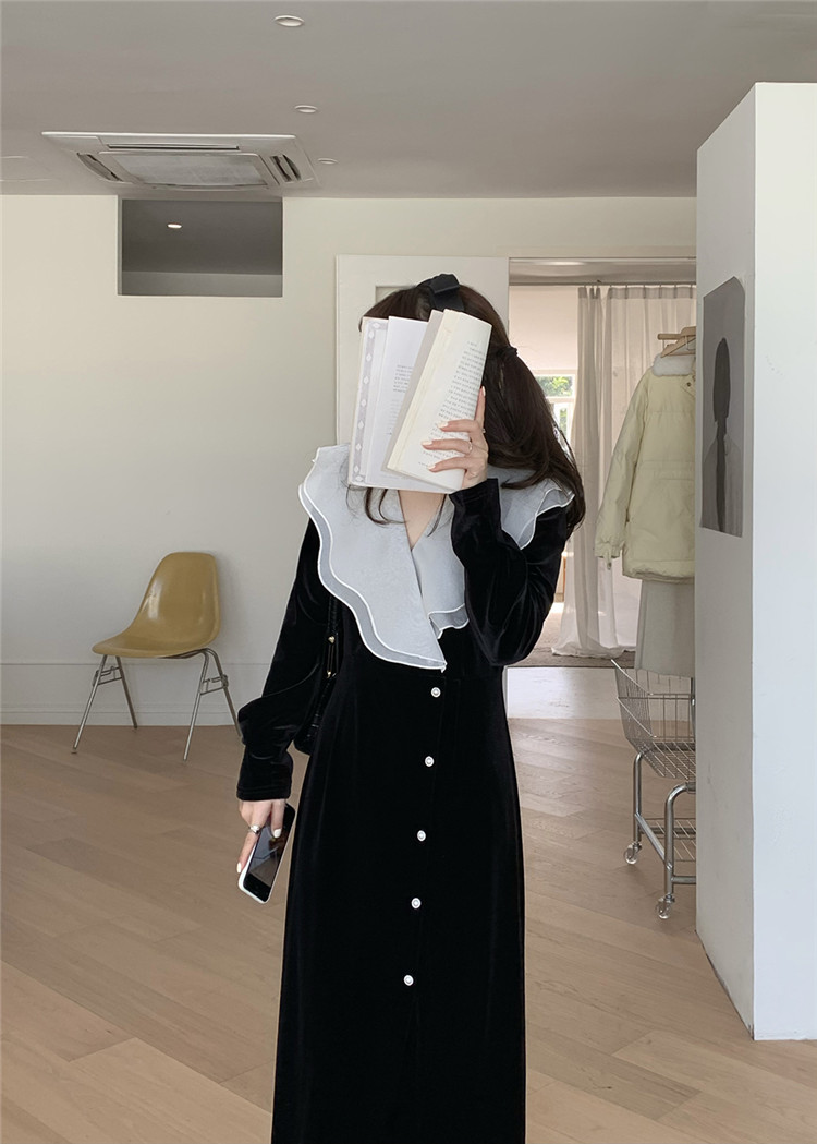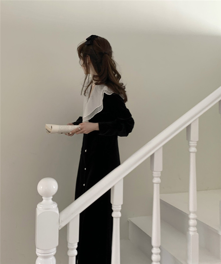 大きなフリル襟が個性的で、レトロな雰囲気を演出します。