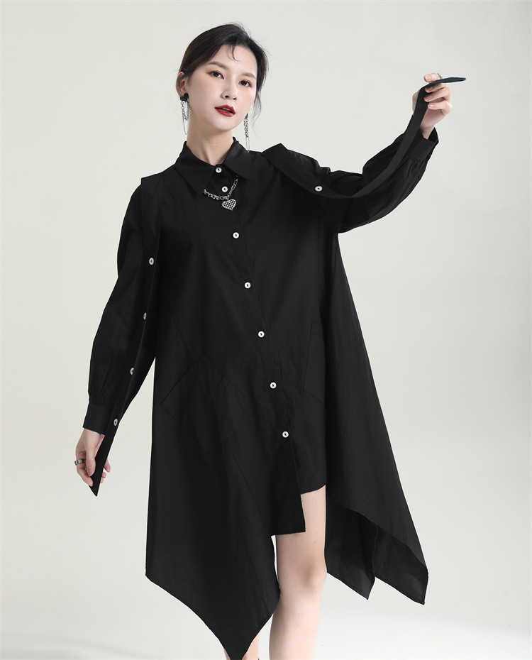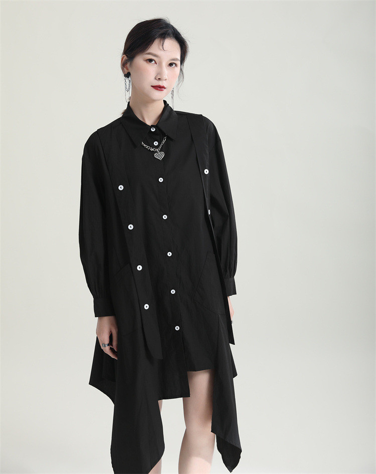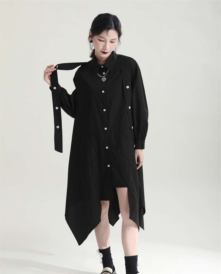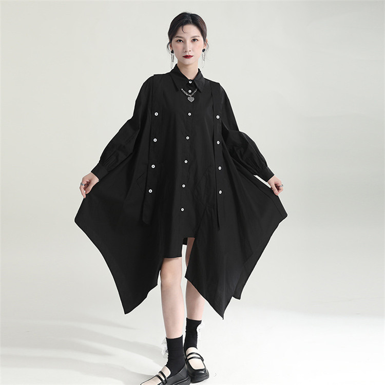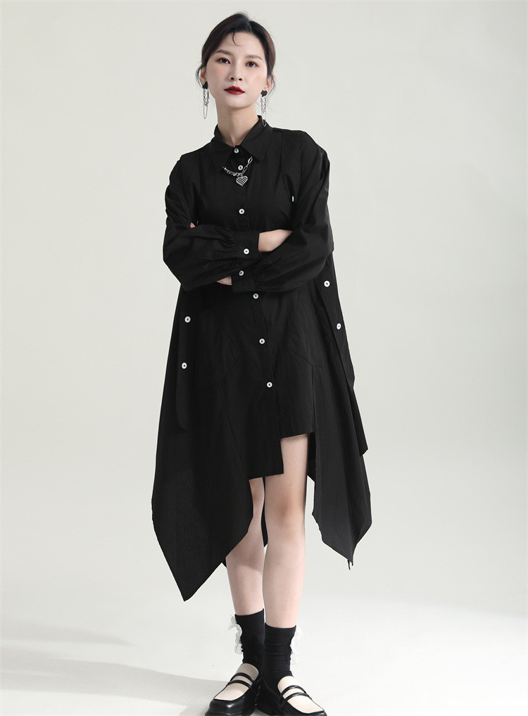 洗練されたシンプルなデザインが魅力的なロングワンピースです。 不規則な裾のフレアシルエットが個性的でおしゃれな印象を演出します。 素材:ポリエステル・綿混合 カラー:ブラック 上品な長袖デザインで、一枚でスタイリッシュに決まります。