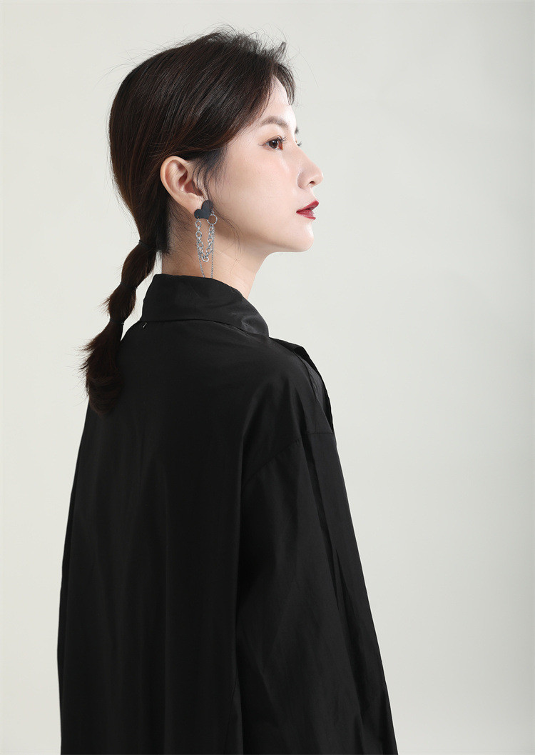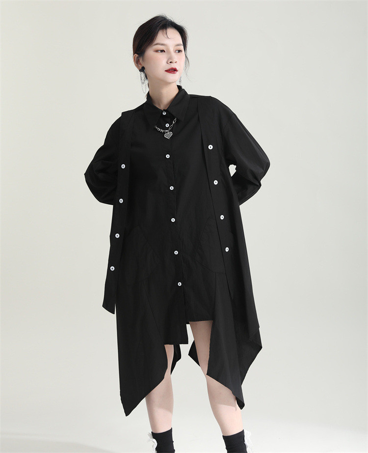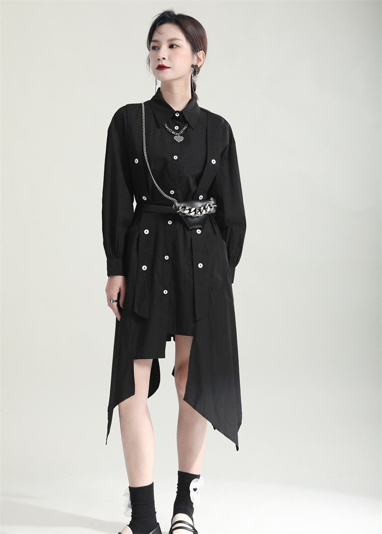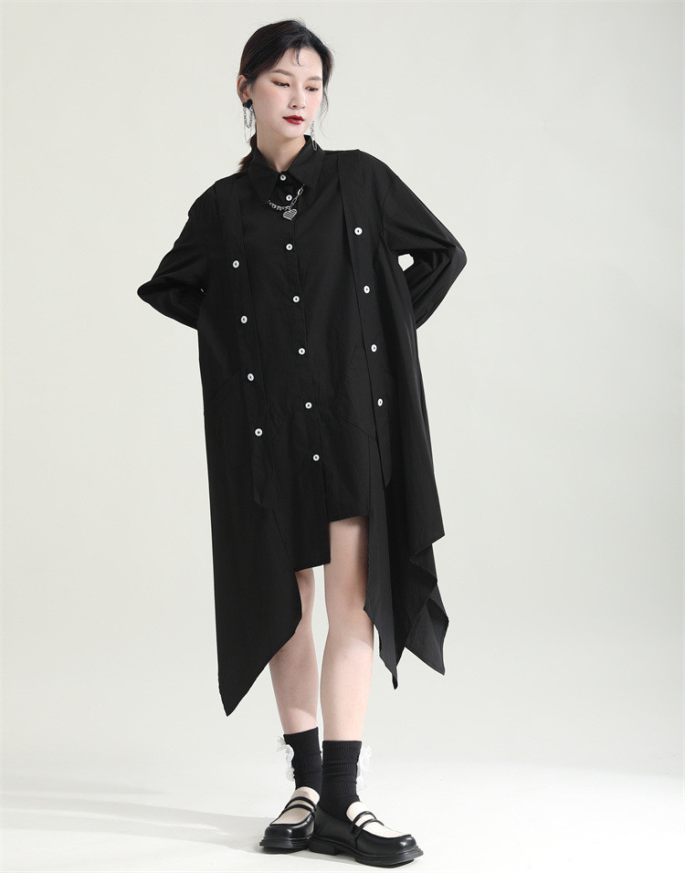洗練されたシンプルなデザインが魅力的なロングワンピースです。 不規則な裾のフレアシルエットが個性的でおしゃれな印象を演出します。 素材:ポリエステル・綿混合 カラー:ブラック 上品な長袖デザインで、一枚でスタイリッシュに決まります。