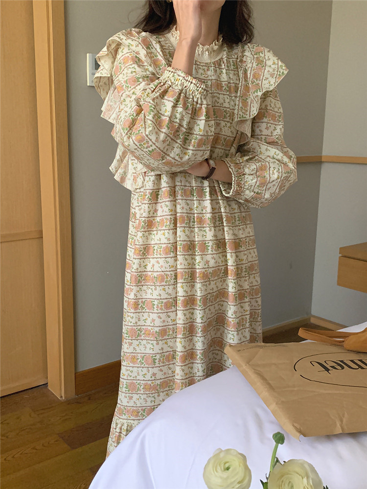 長袖デザインで立ち襟とフリル装飾が女性らしさを演出します。