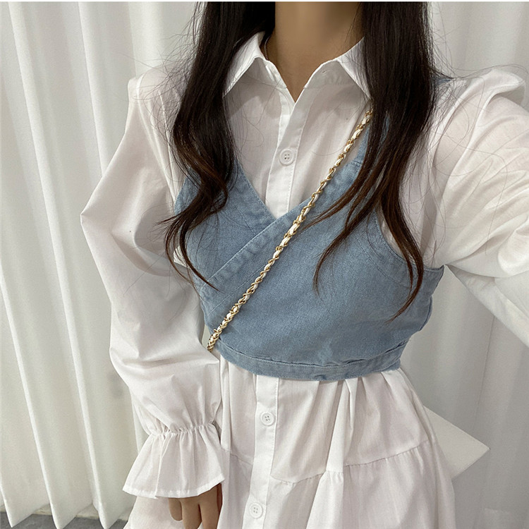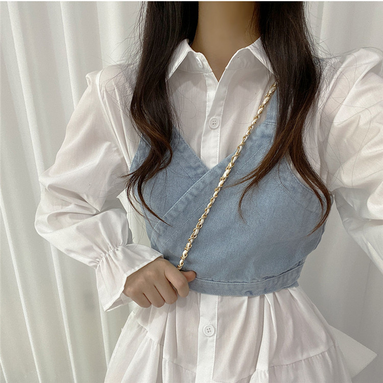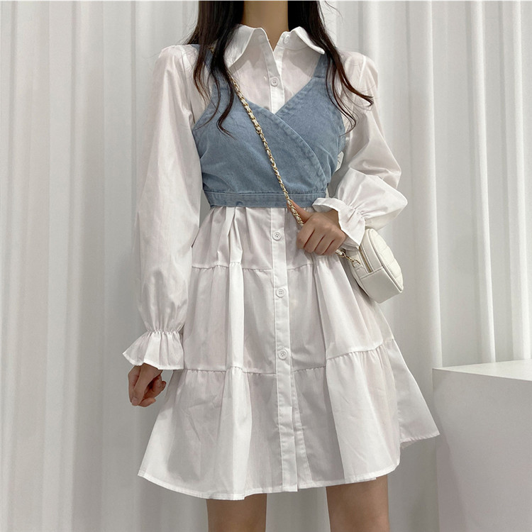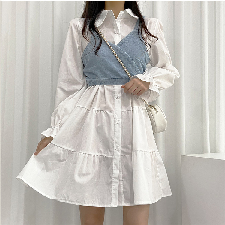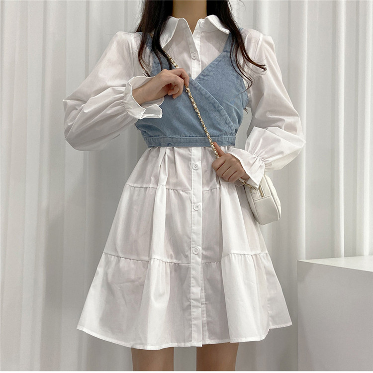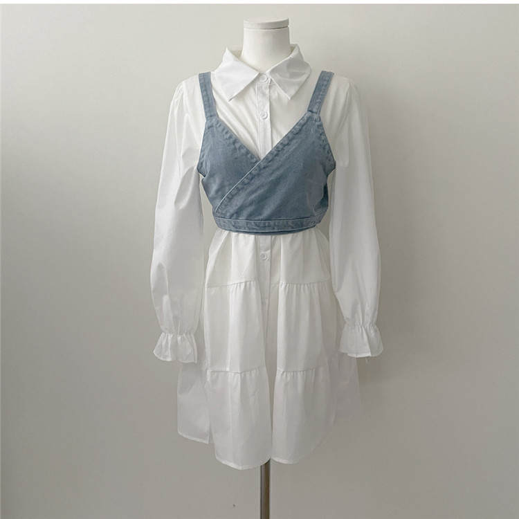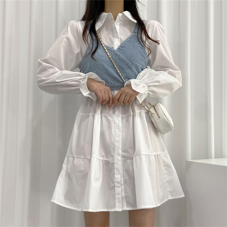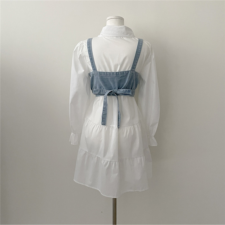 トレンドの重ね着スタイルが楽しめる白シャツワンピースとデニムビスチェの二点セット。