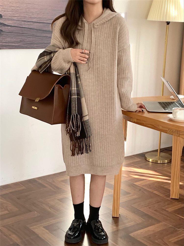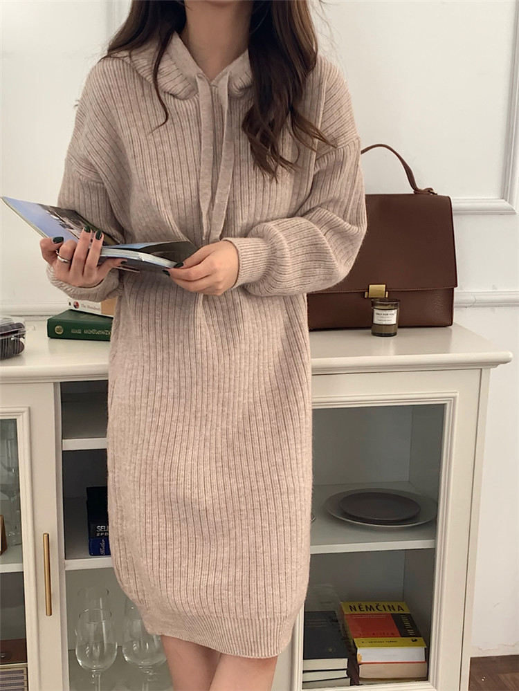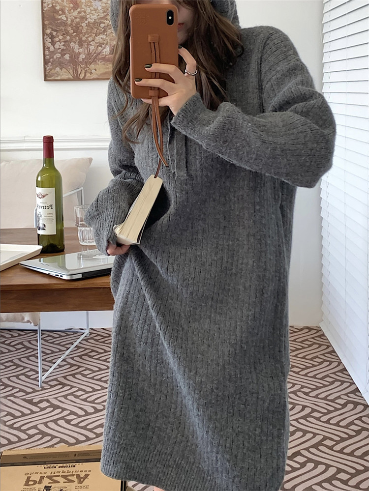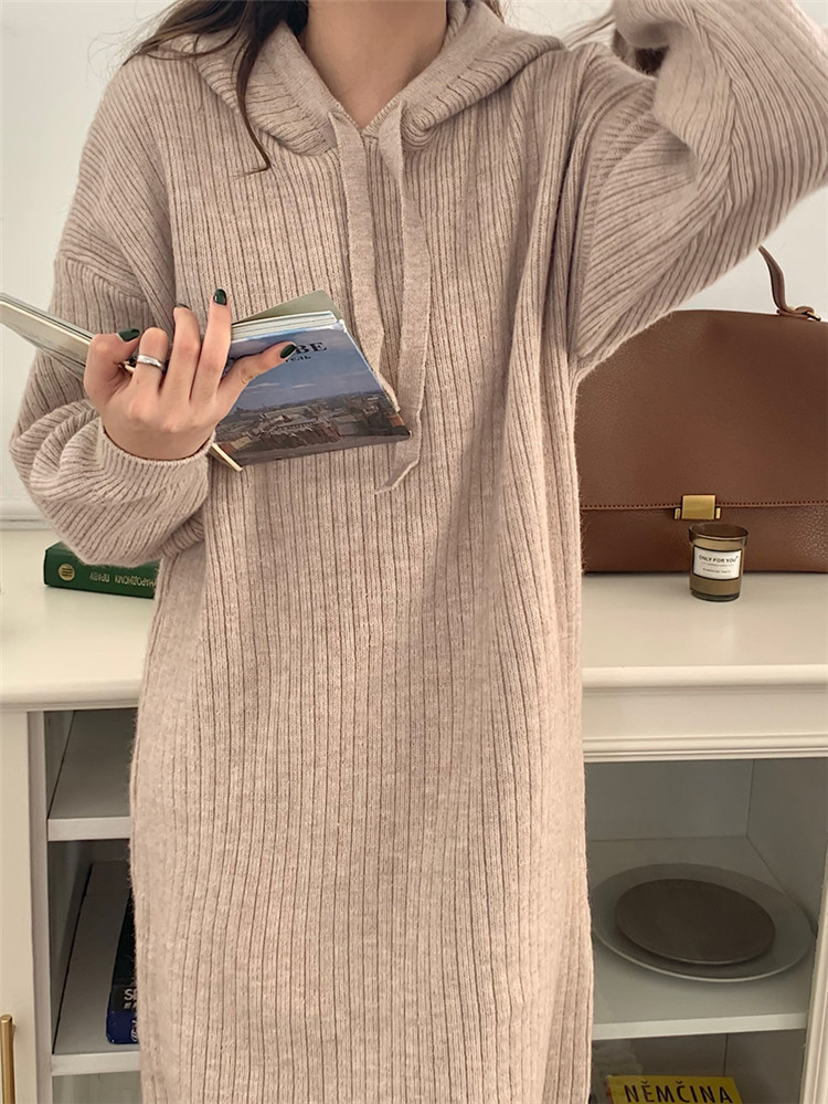 リラックス感のあるフード付きニットロングワンピース。