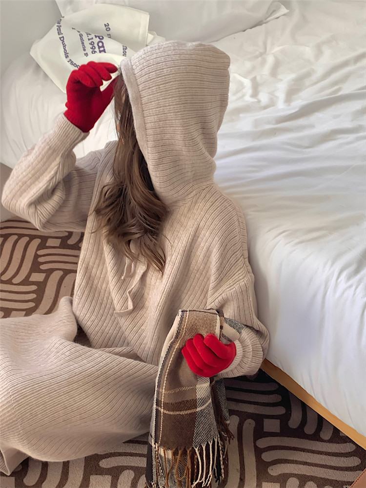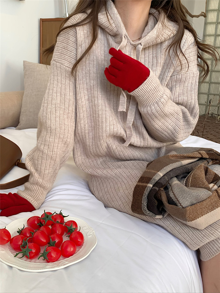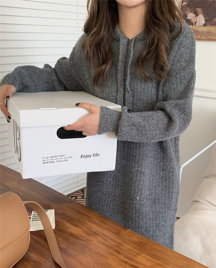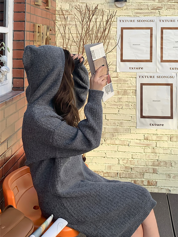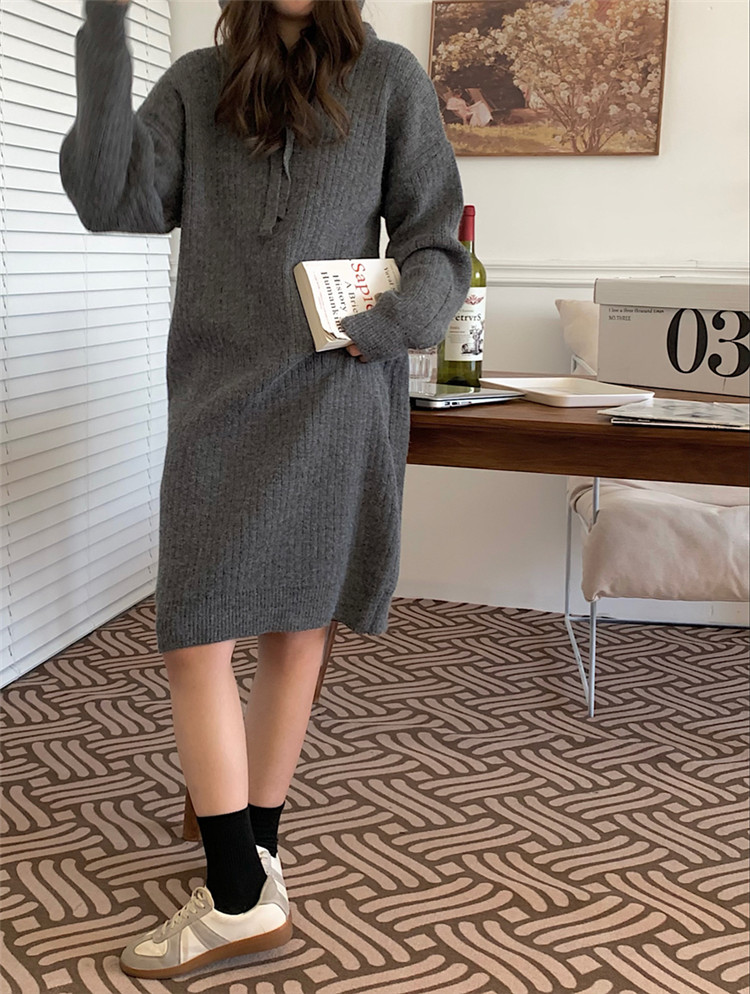 リラックス感のあるフード付きニットロングワンピース。