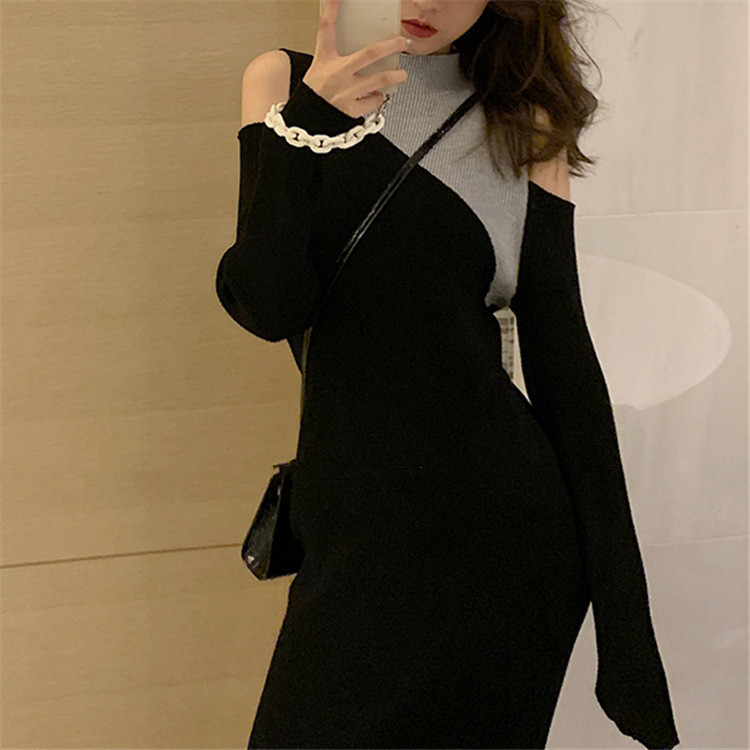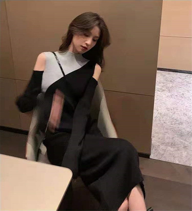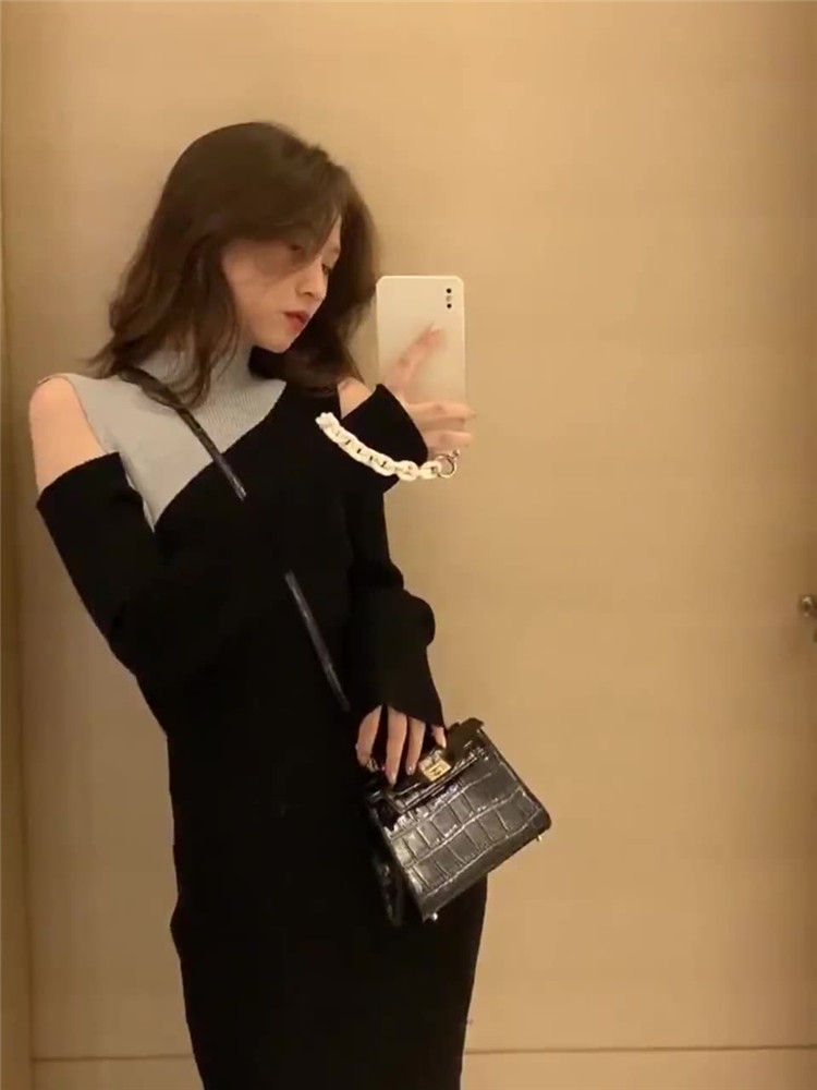 秋冬新作のタートルネック重ね着風デザインが魅力的なロングワンピース。