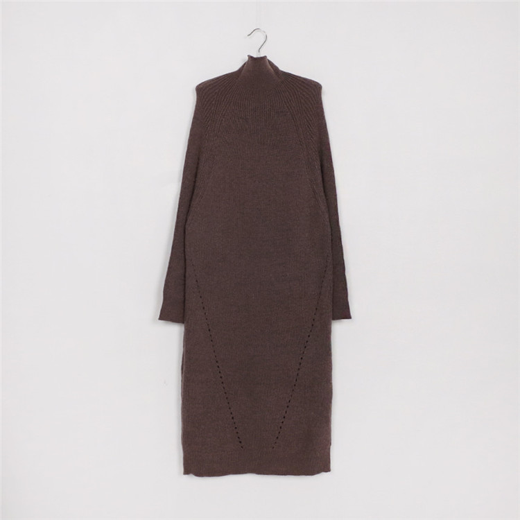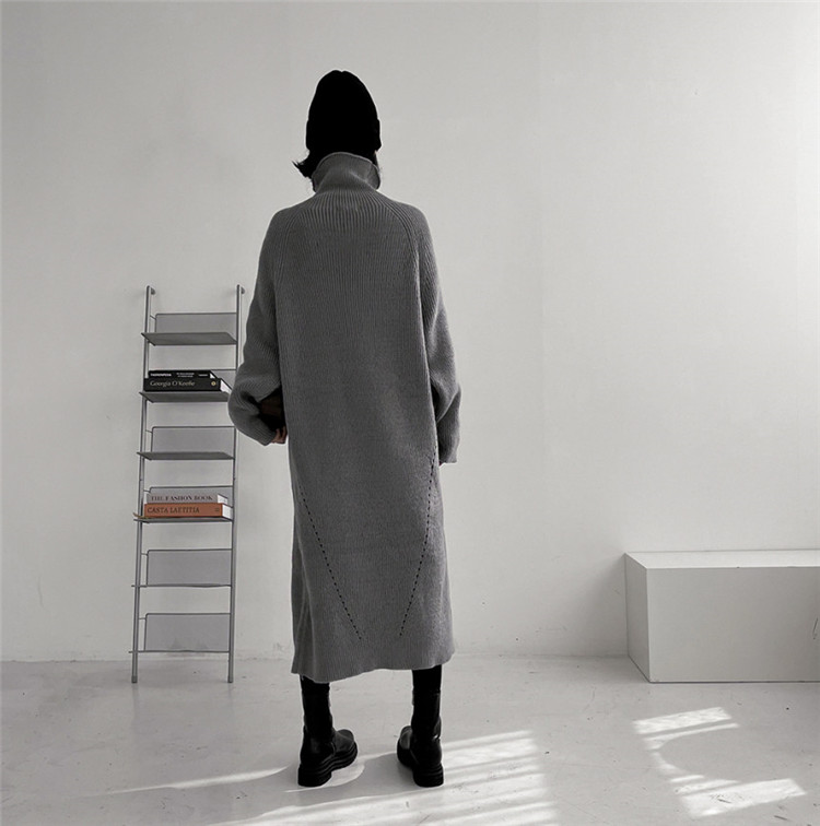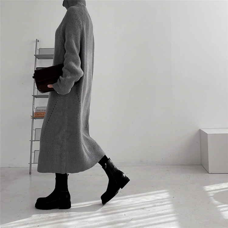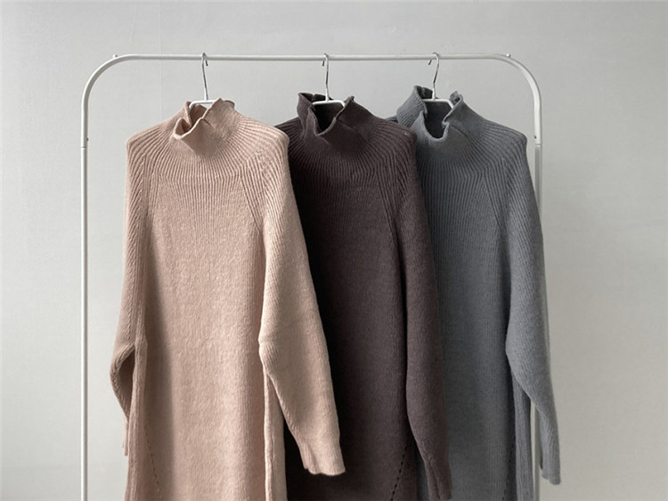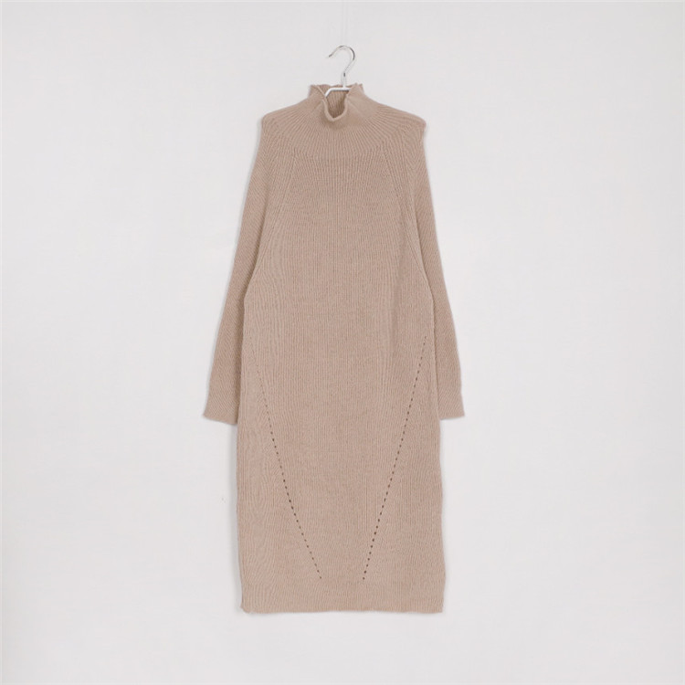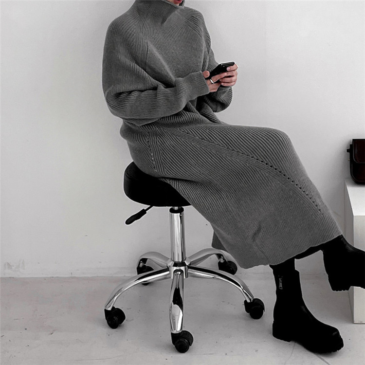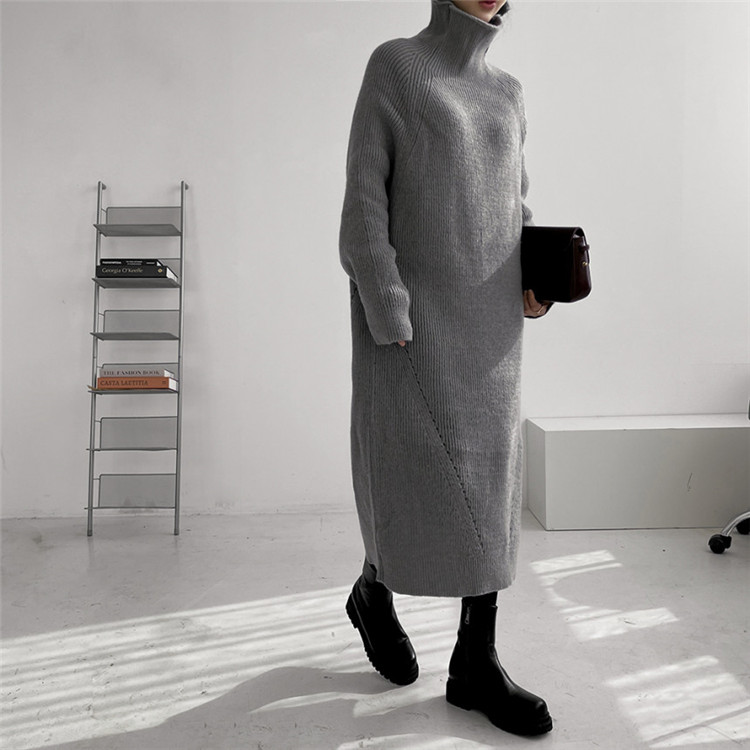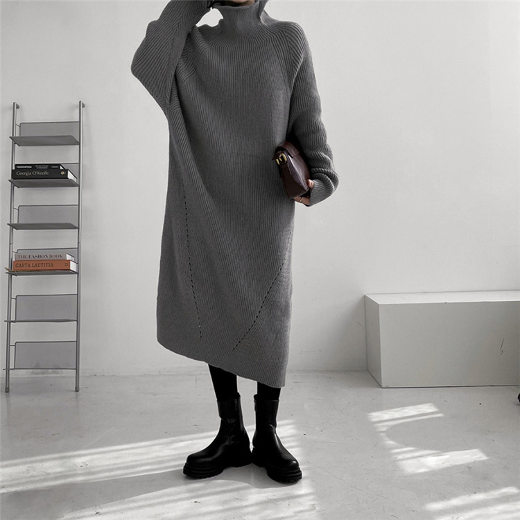 ゆったりとしたシルエットが魅力的なタートルネック長袖ニットワンピース。