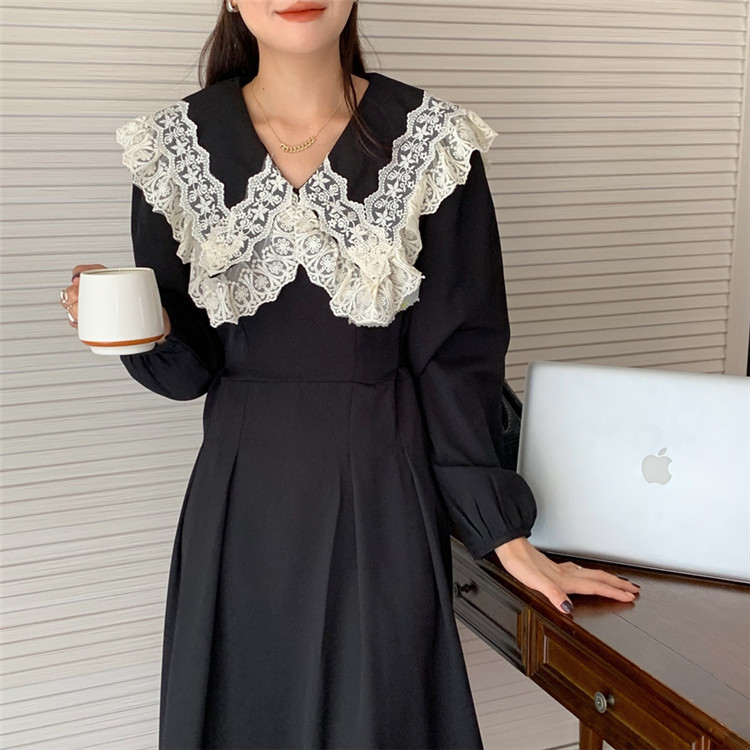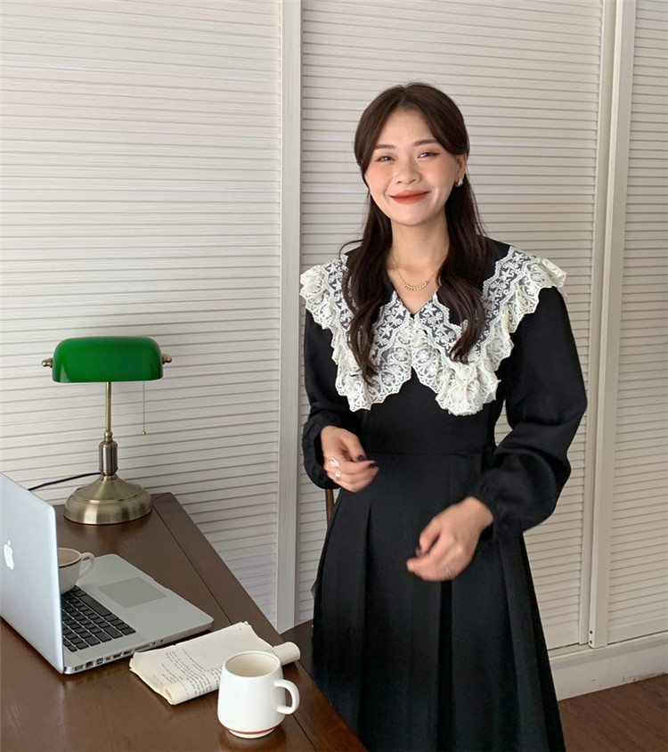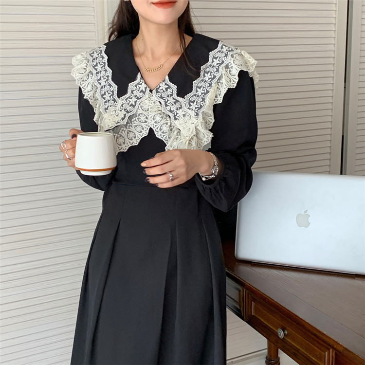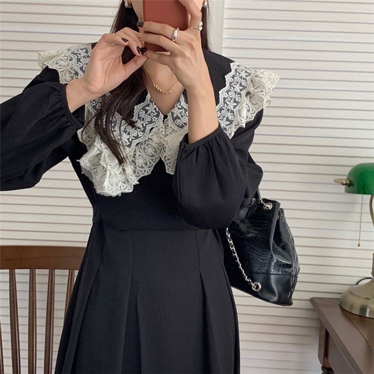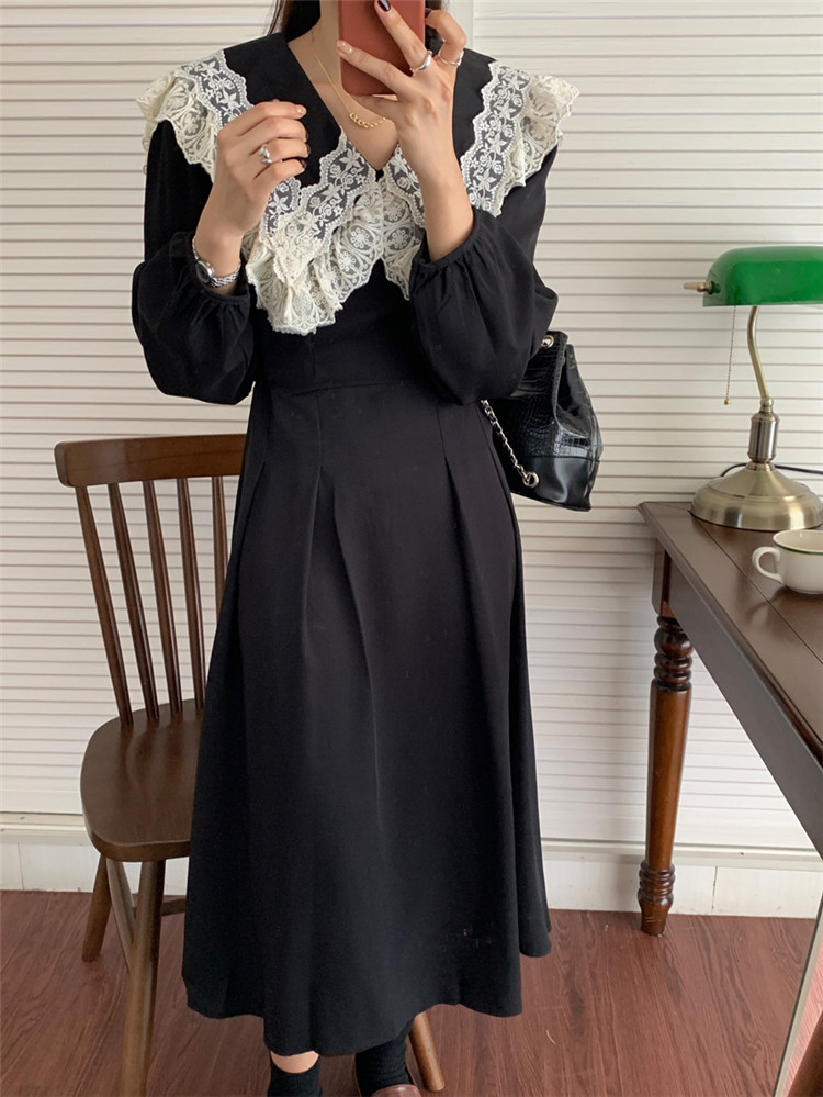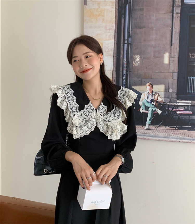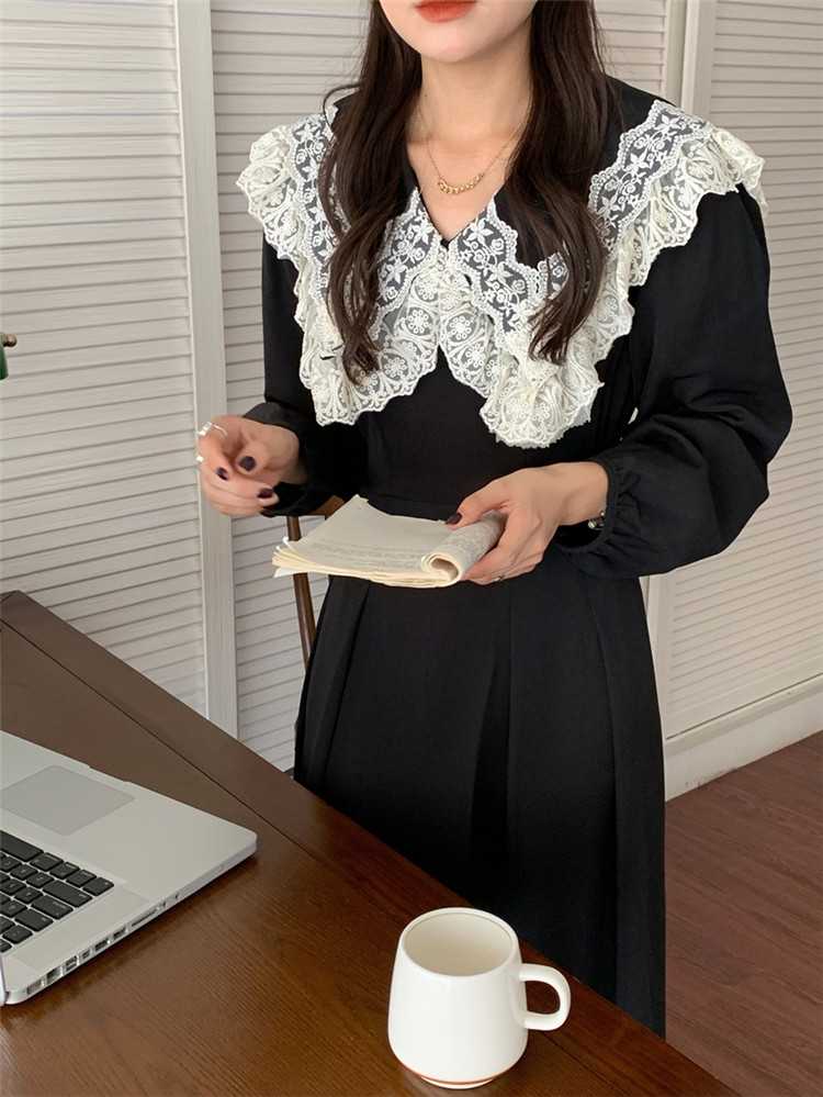 胸元の美しいフリルとレース装飾が甘い印象を演出し、エレガントなスタイルを完成させます。