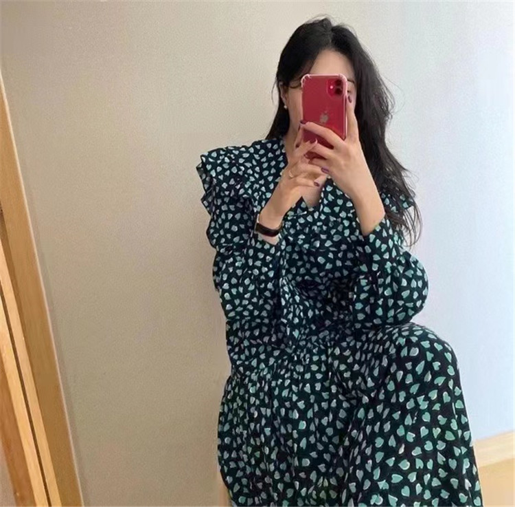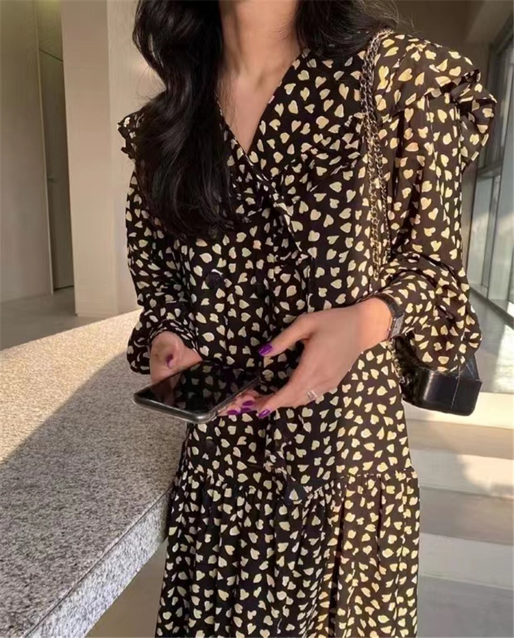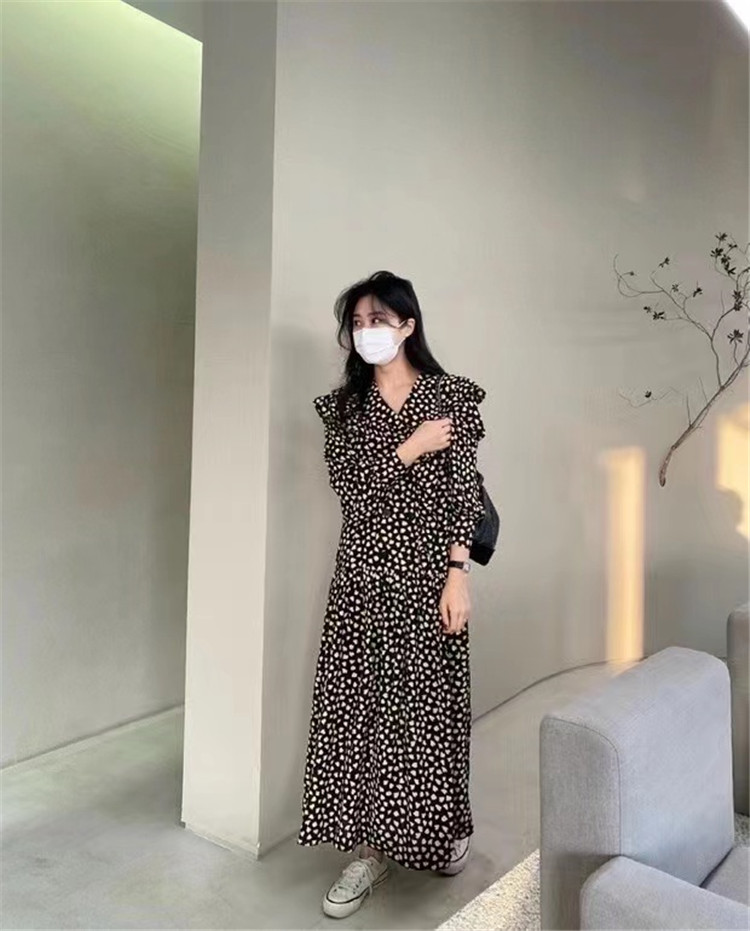 ロングワンピースならではの上品さとフリルディテールで女性らしさもプラス。
