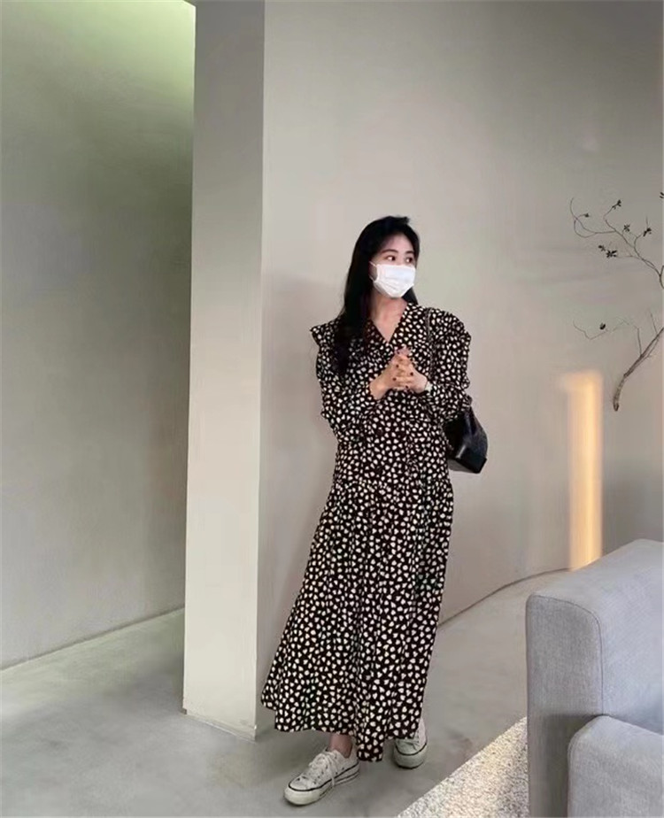 大人気のドット柄マキシワンピースが登場! ゆったりとした着心地とダブルボタンのカジュアルデザインが魅力です。 ロングワンピースならではの上品さとフリルディテールで女性らしさもプラス。 素材:綿混ポリエステル カラー:カーキ、ブルー