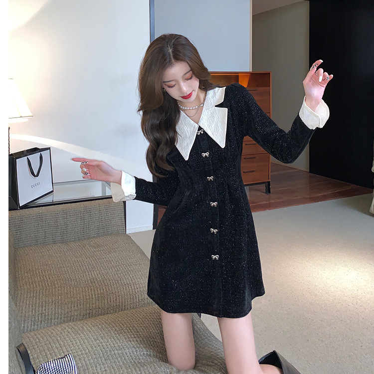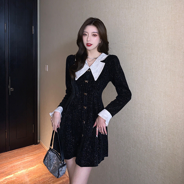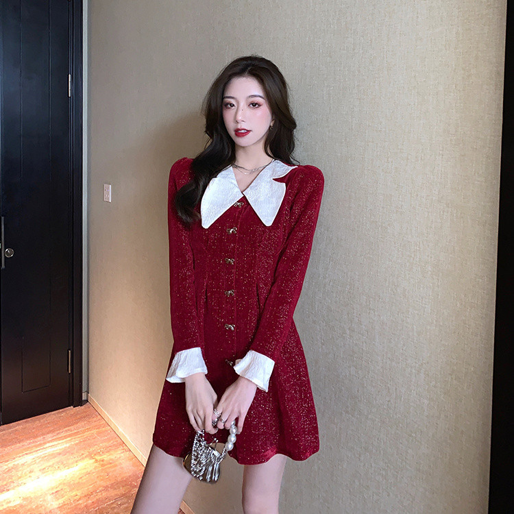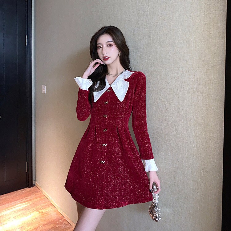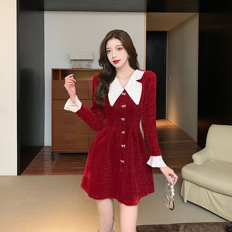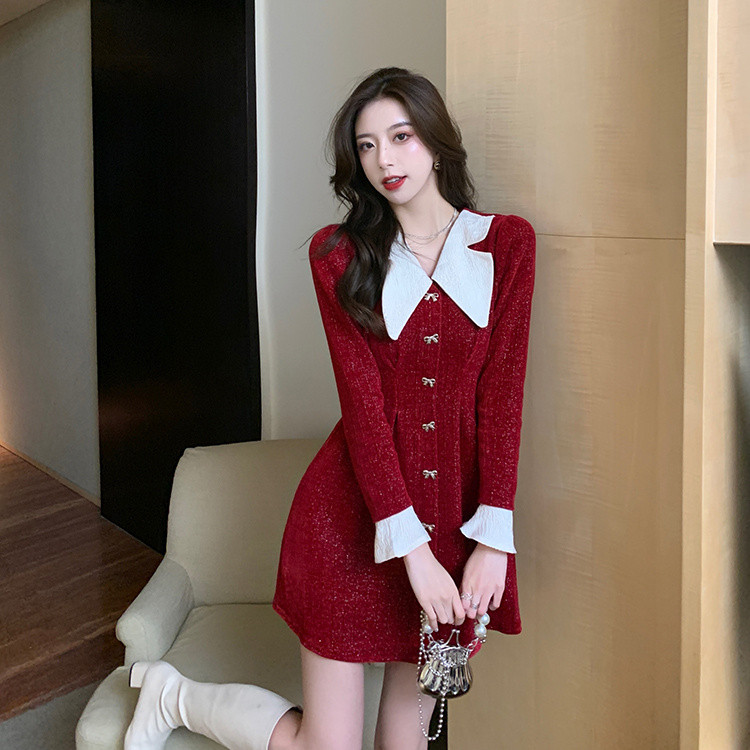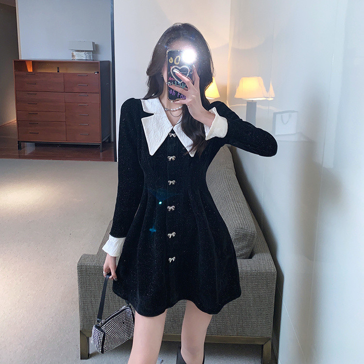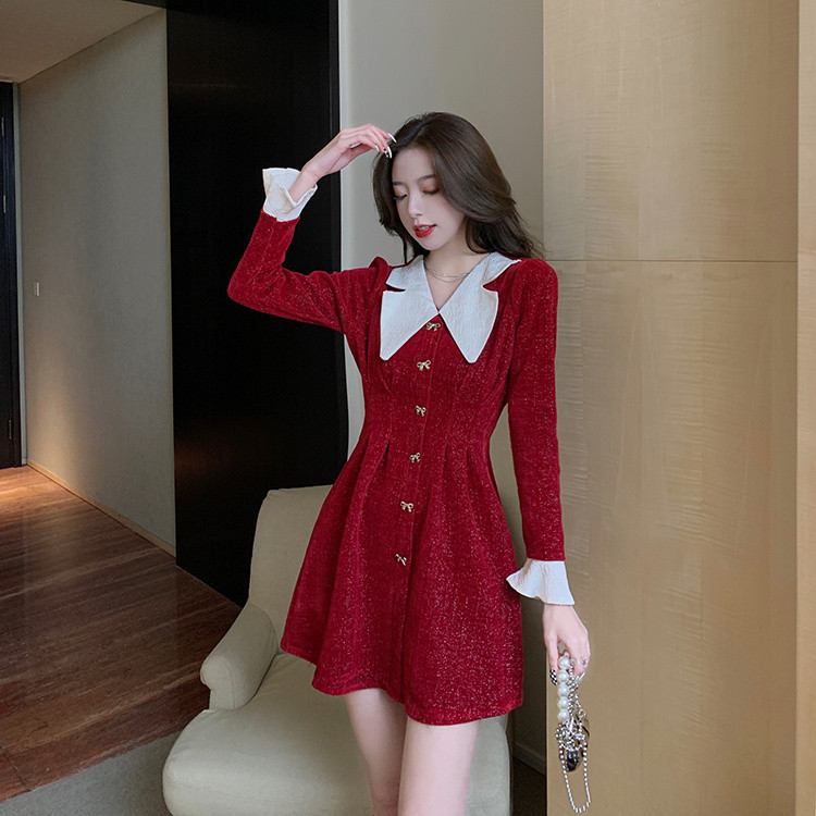 白い襟と前ボタンがクラシカルな魅力を演出し、ウエストラインを美しく見せるシルエットが特徴。