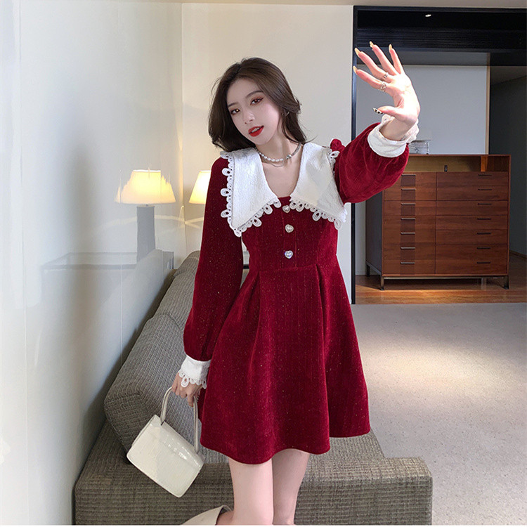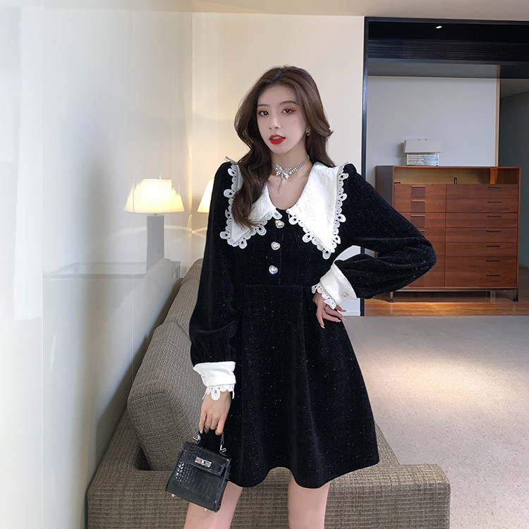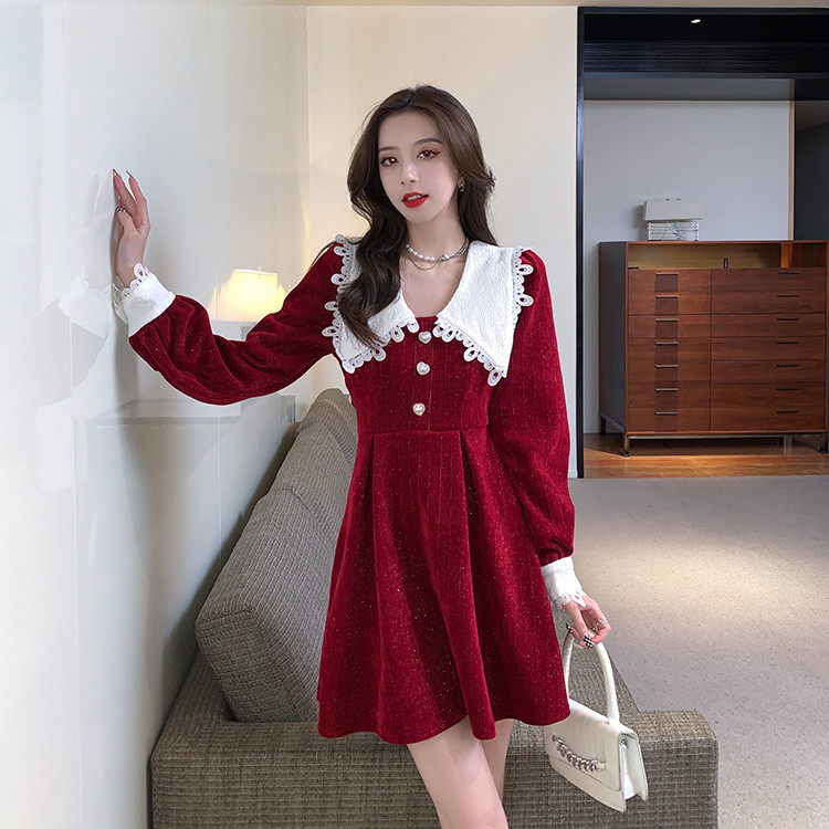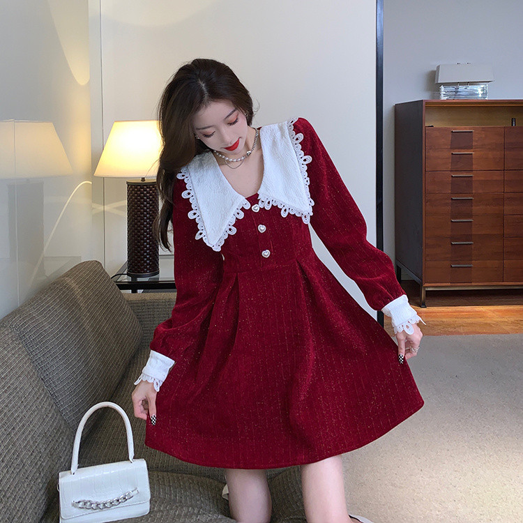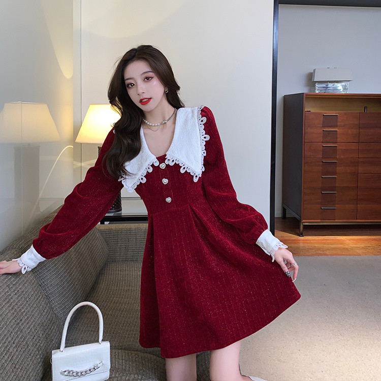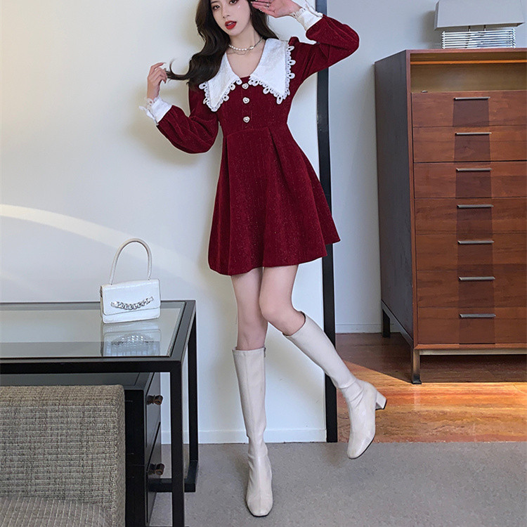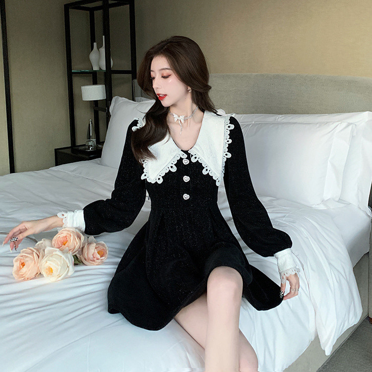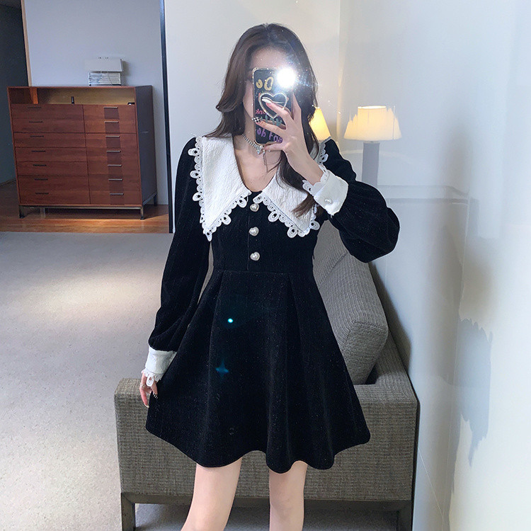 白い人形襟が印象的なフレアシルエットのロングワンピース。
