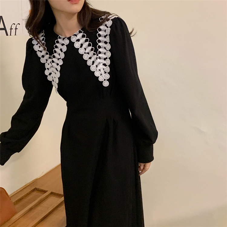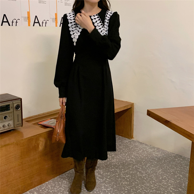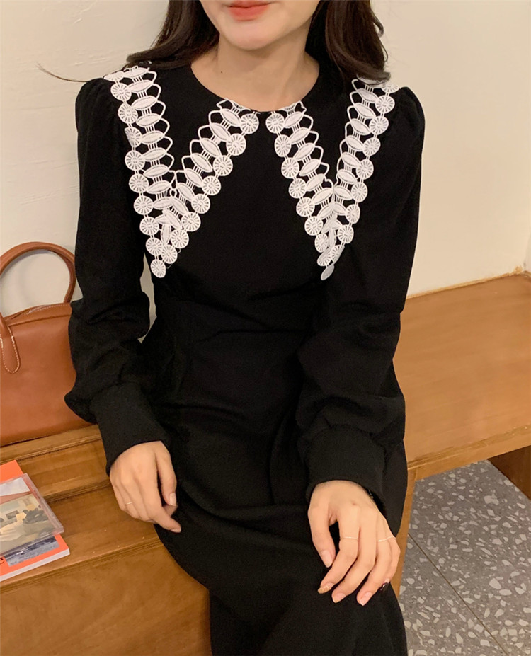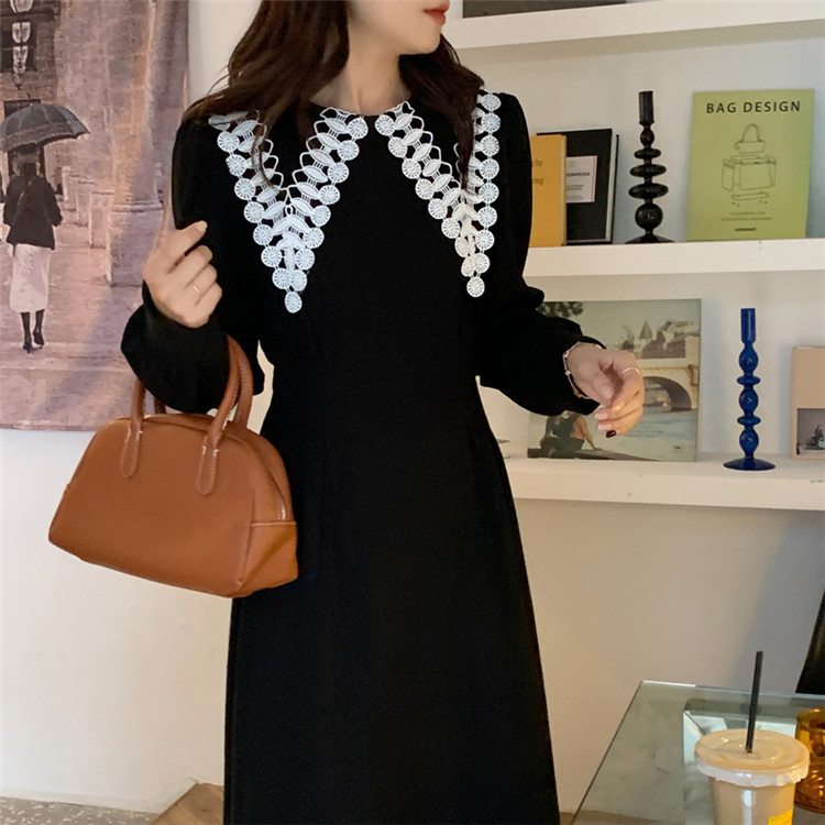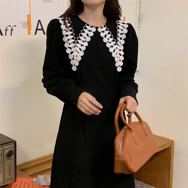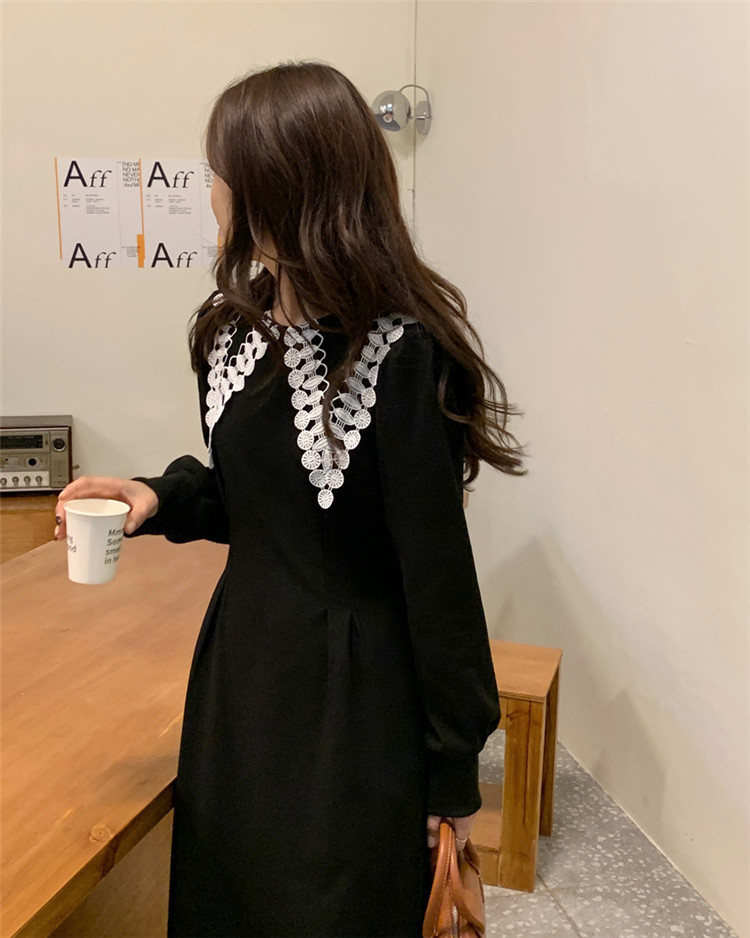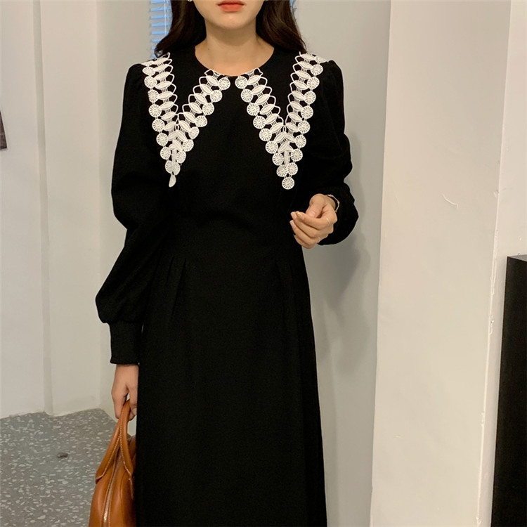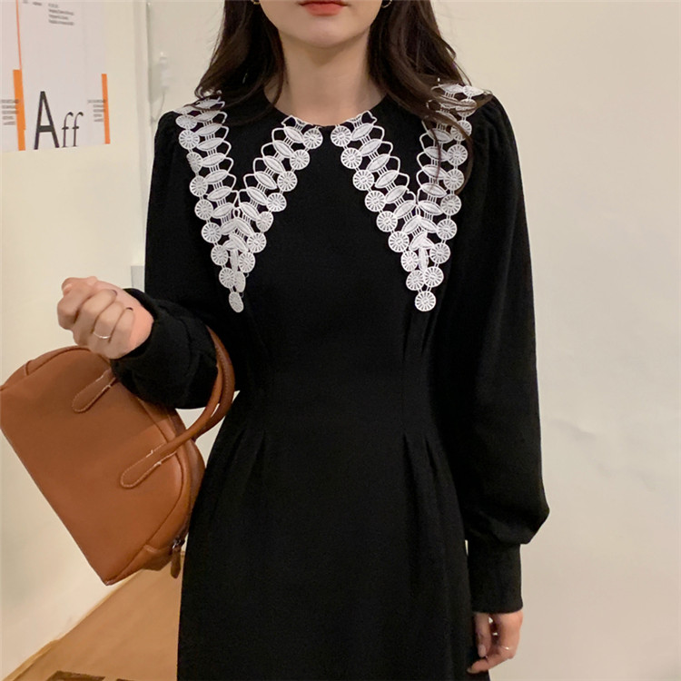 白いレース襟がアクセントの上品なフレアシルエット