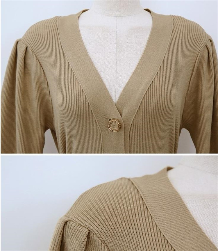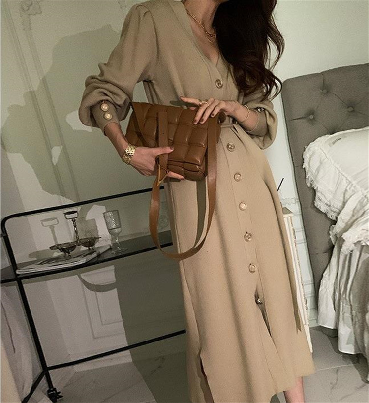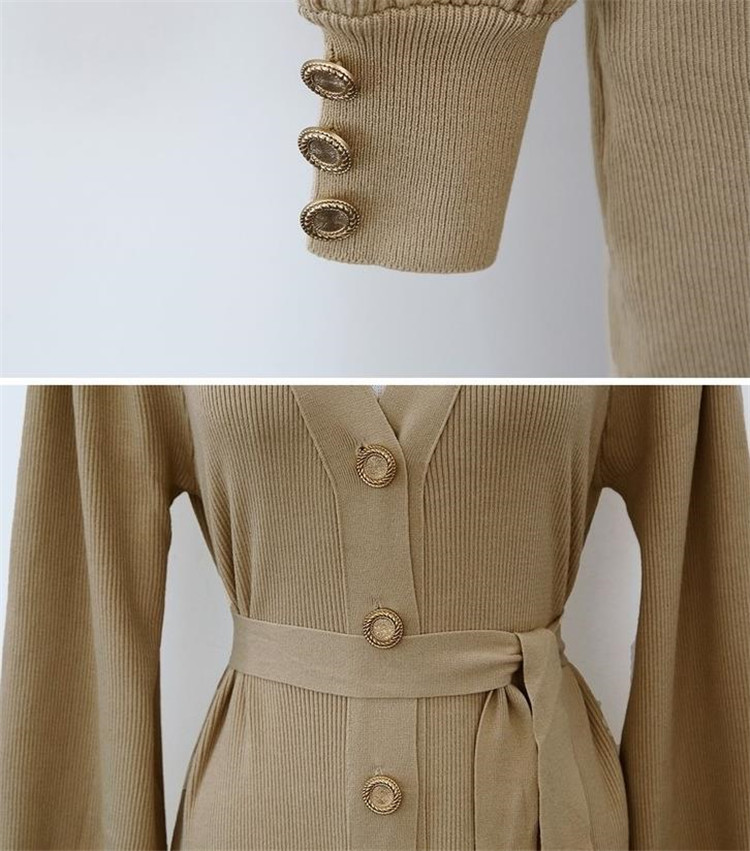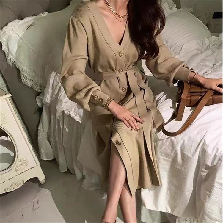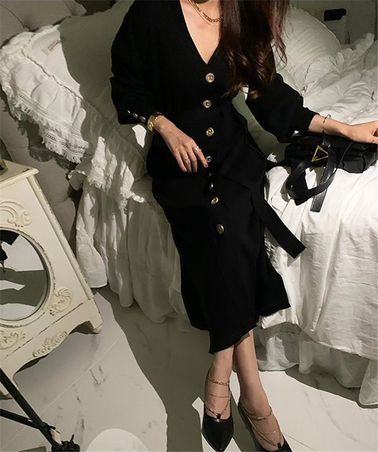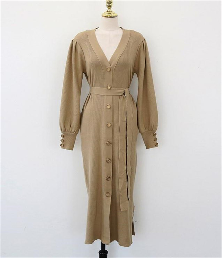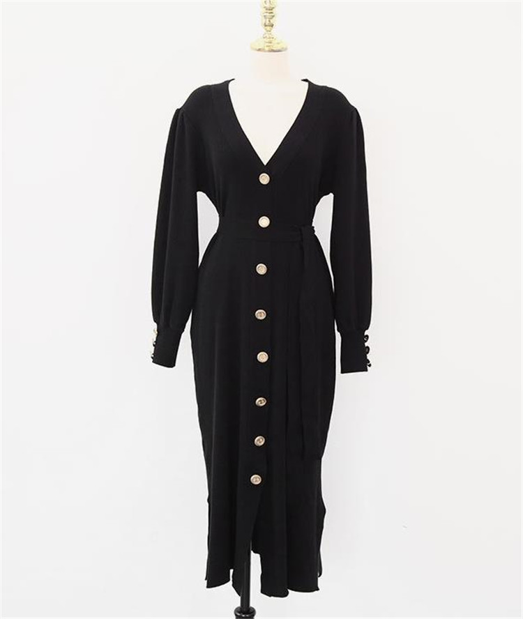 上品なブイネック デザインが魅力のニット ロングワンピースです。