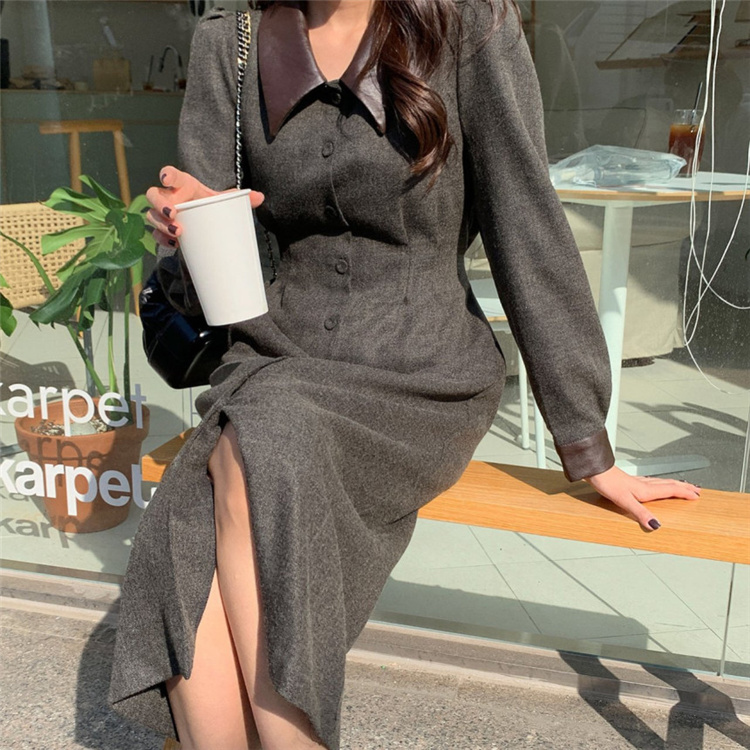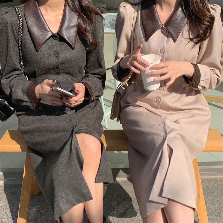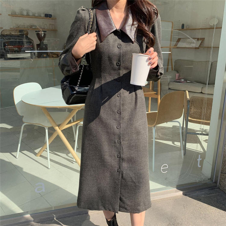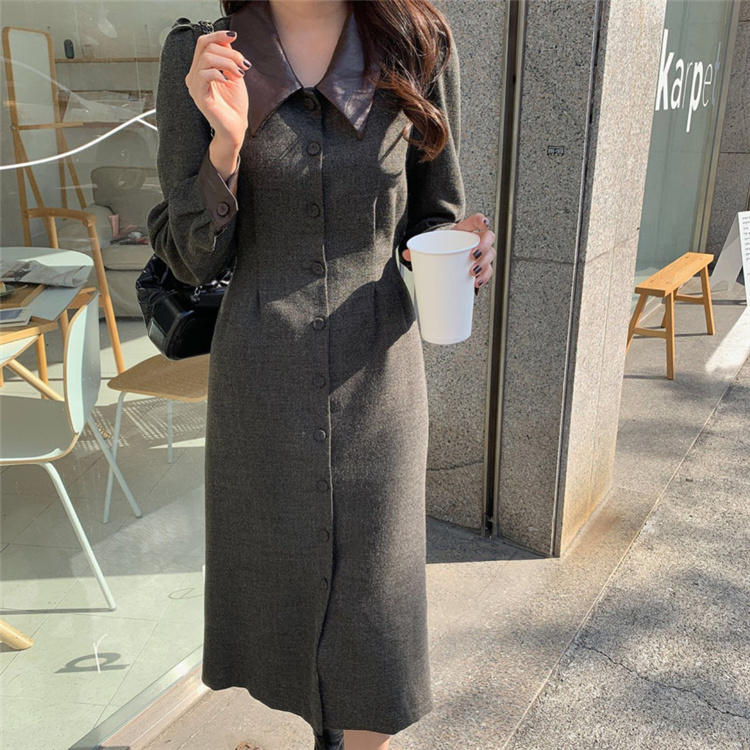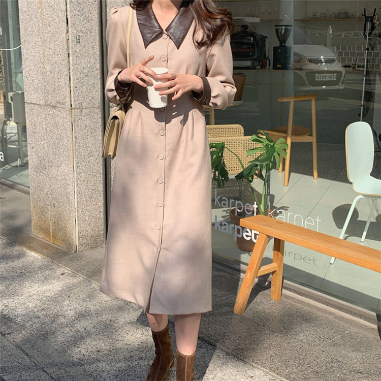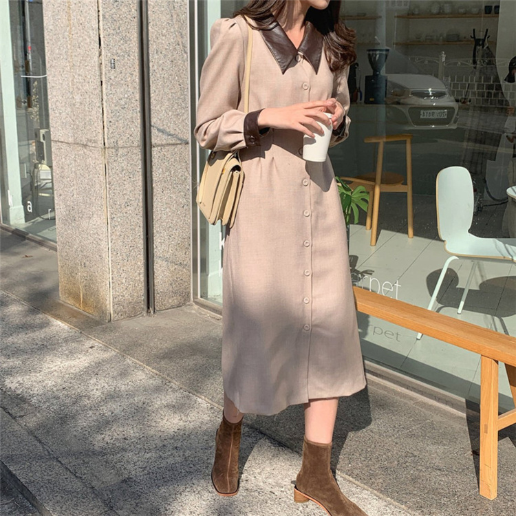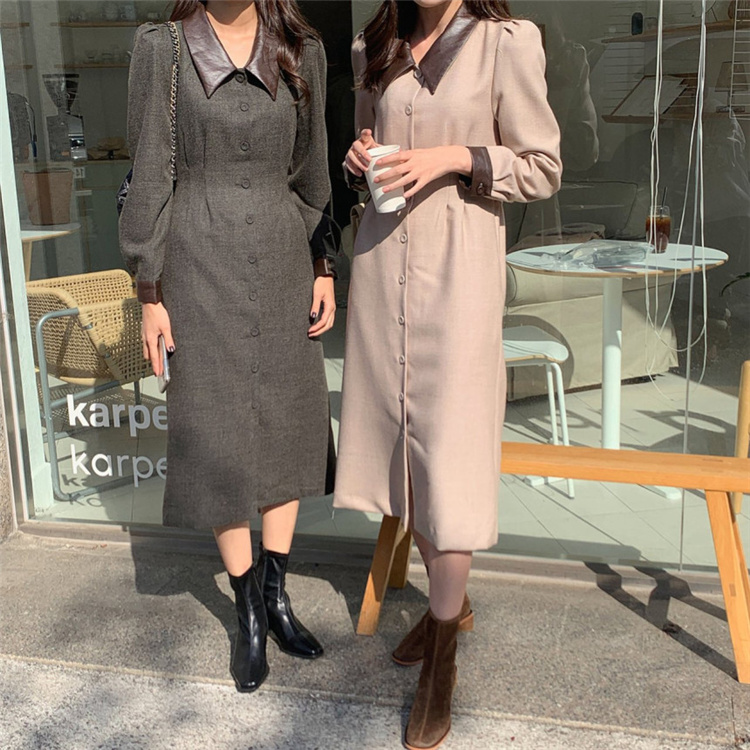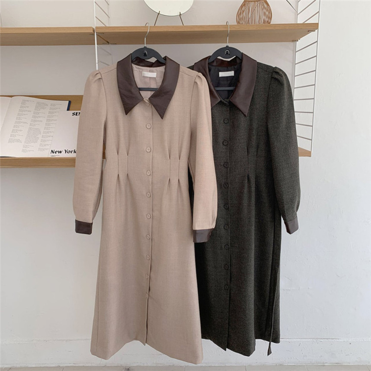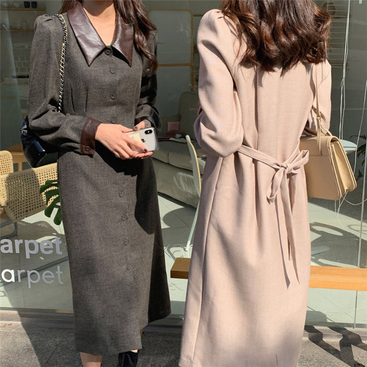 上品なフレンチスタイルのシャツワンピースです。 異素材の襟がアクセントになったロングワンピースで、ウエストベルトでスリムなシルエットを演出。 素材:ポリエステル・コットン カラー:ダークグレー・ベージュ 大人女性にぴったりの冬用シャツワンピースです。