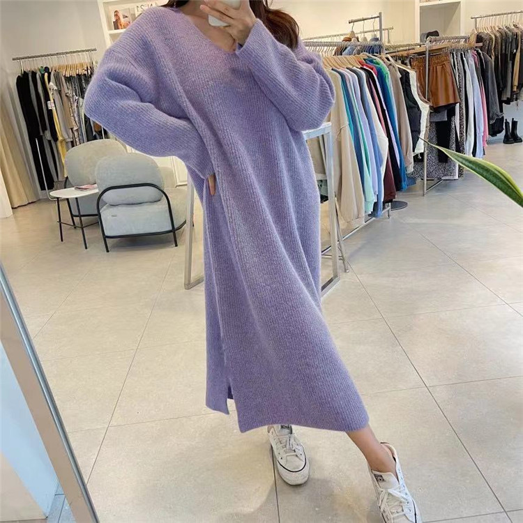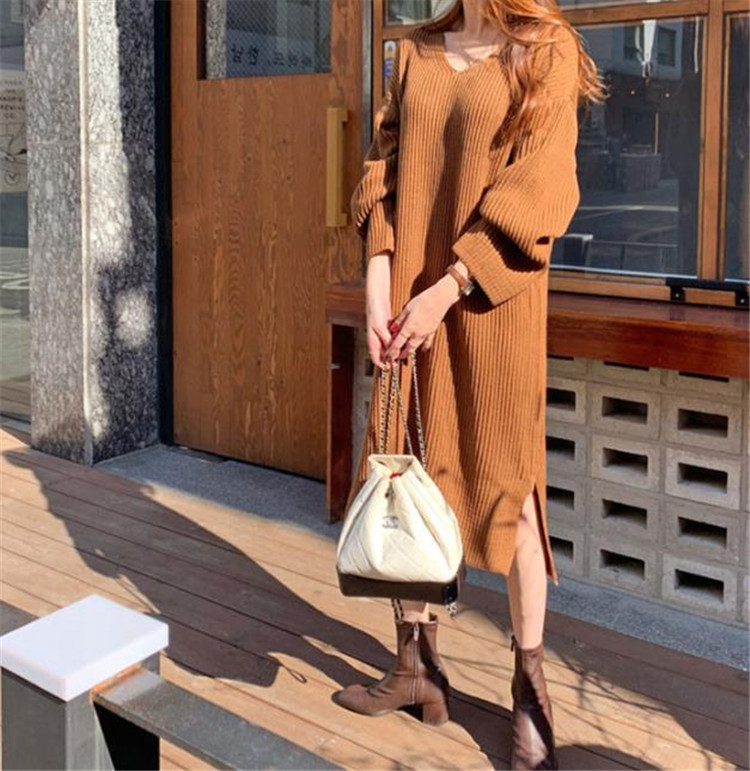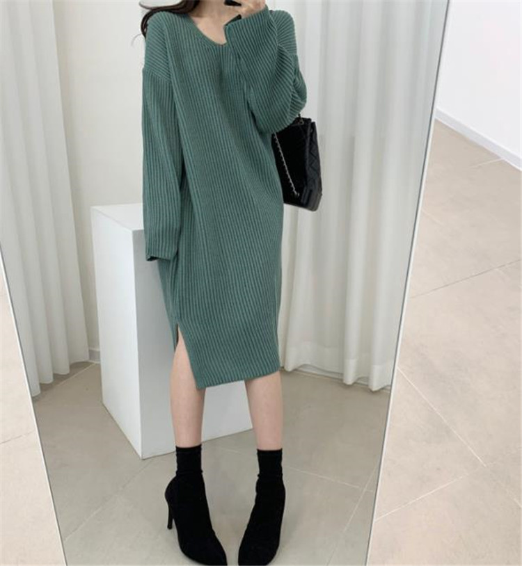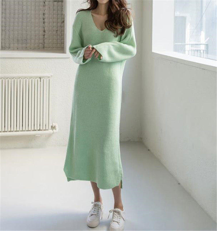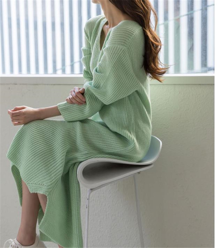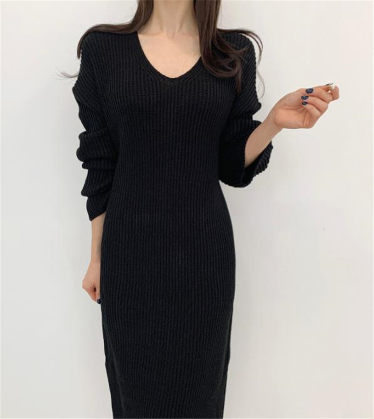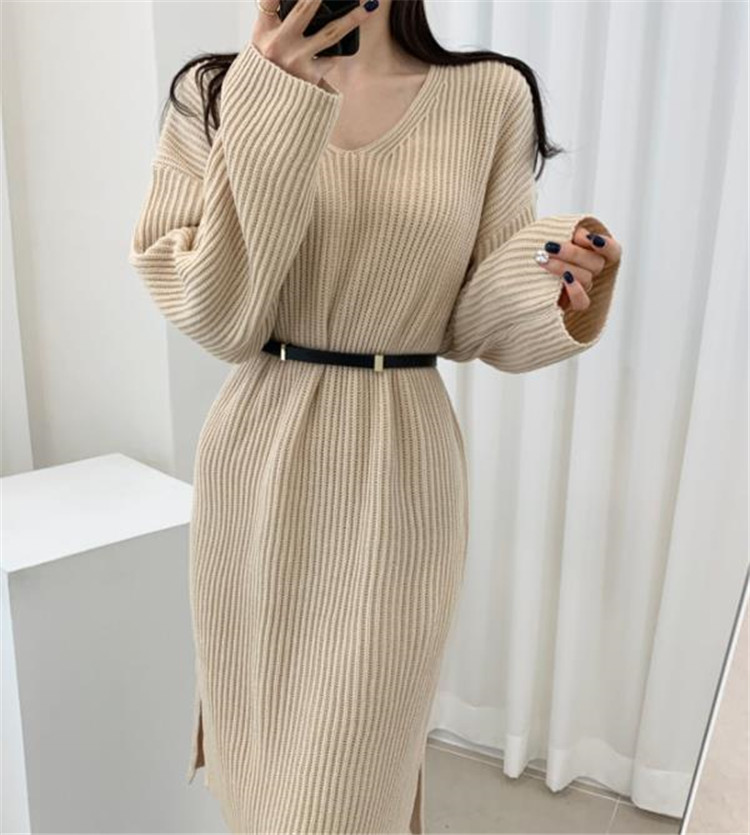 上品なブイネックデザインのニットロングワンピースです。