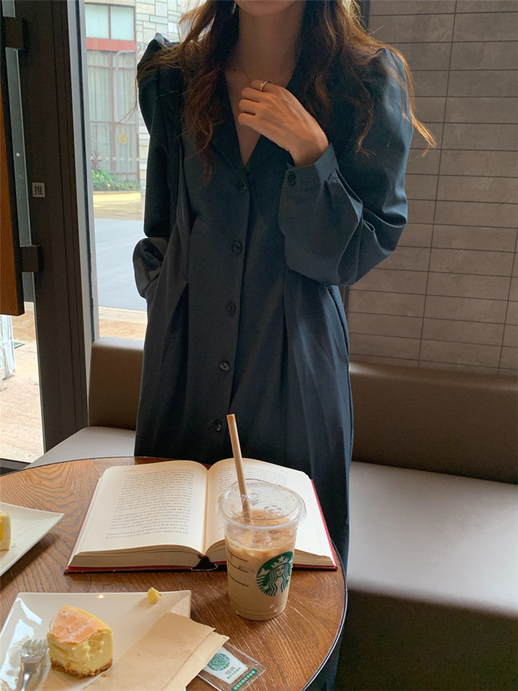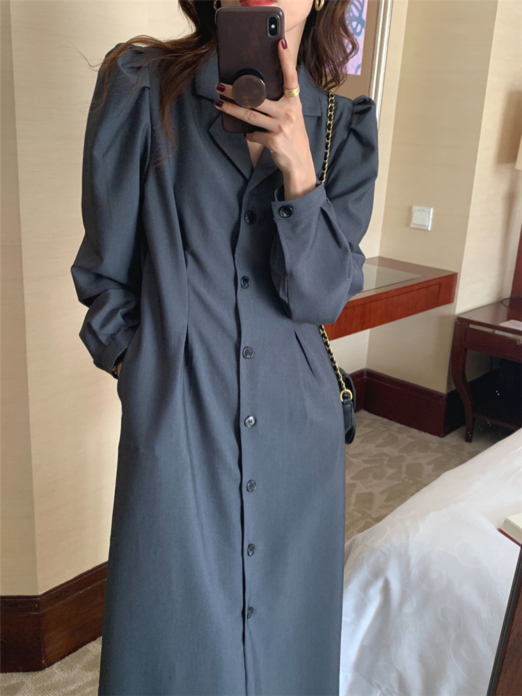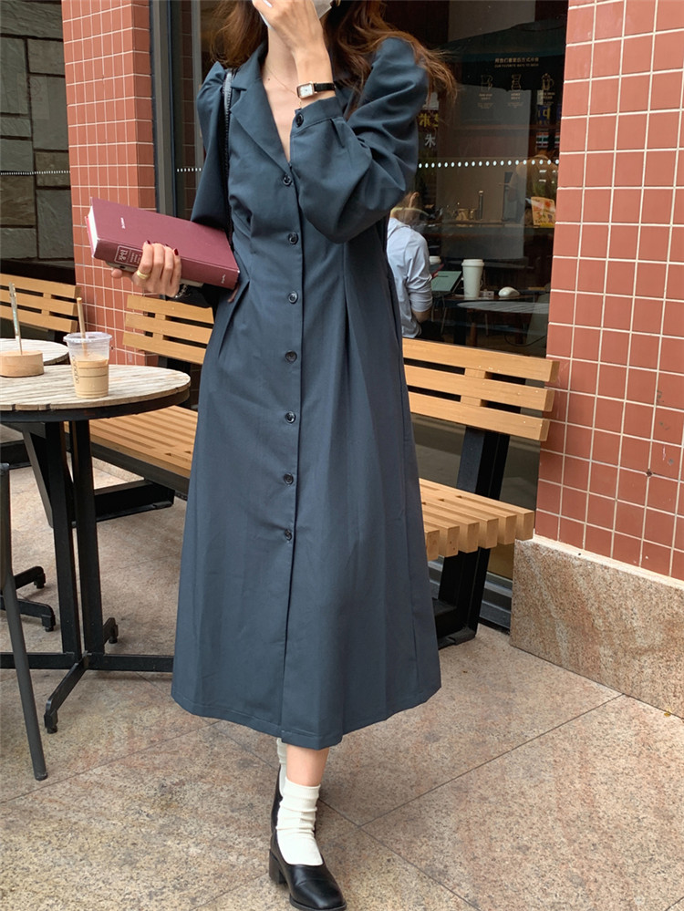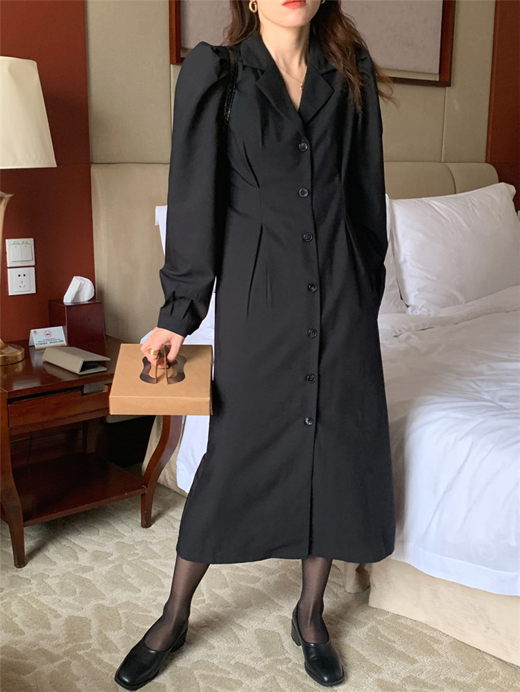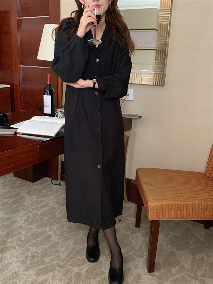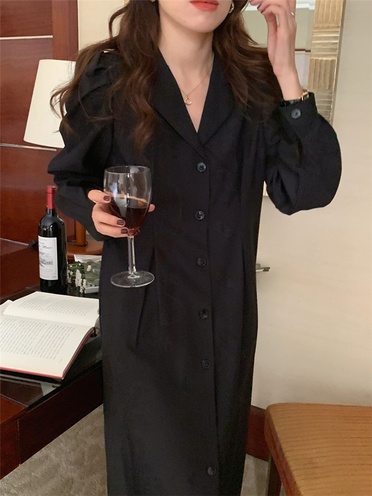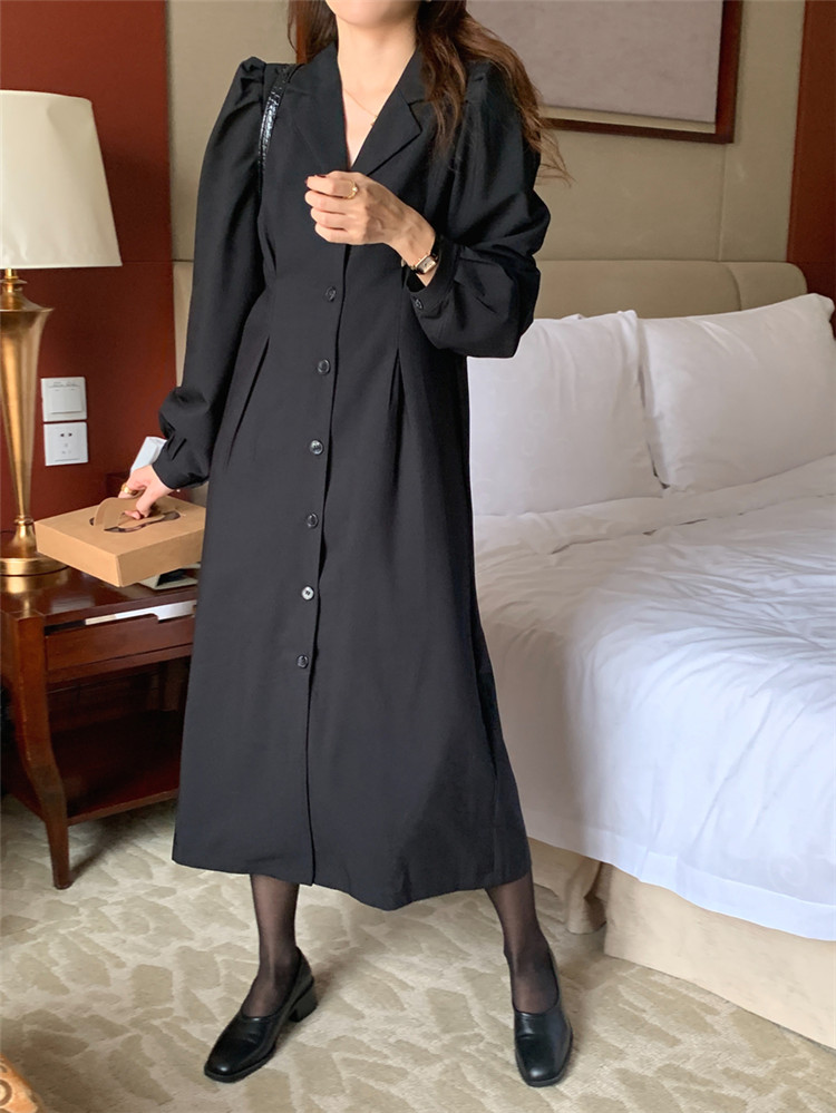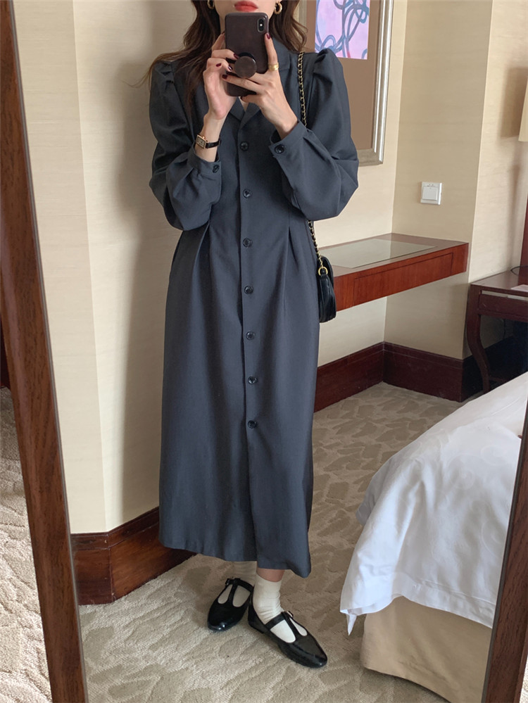 こなれた大人の魅力を演出するパフスリーブ付きシャツ風ロングワンピース。