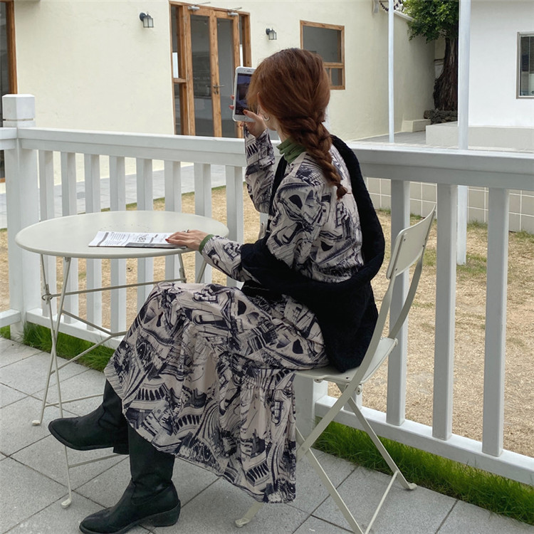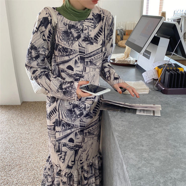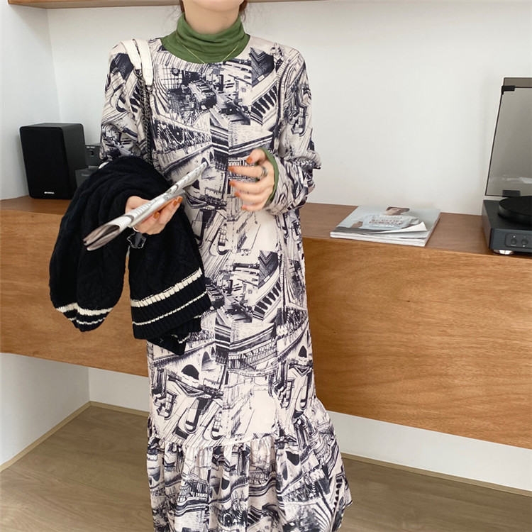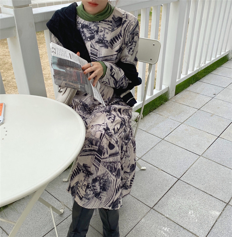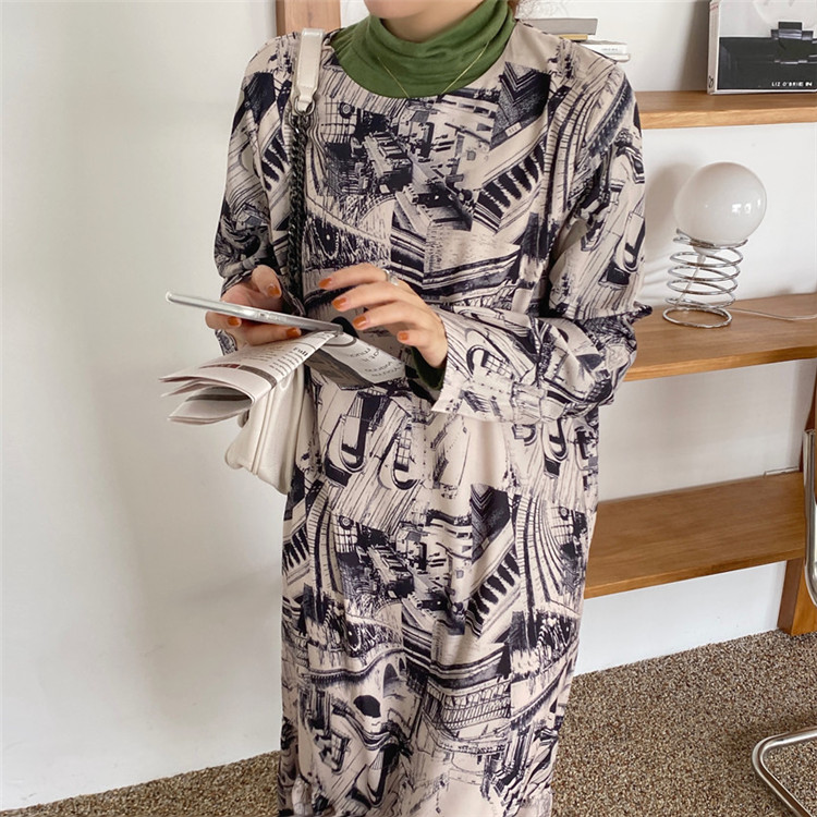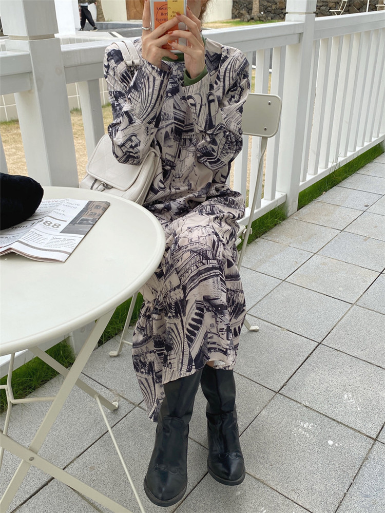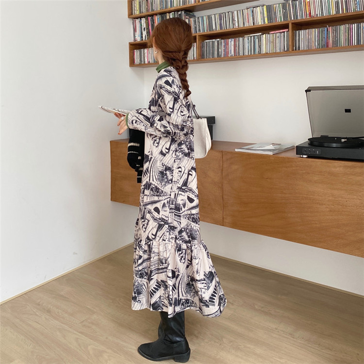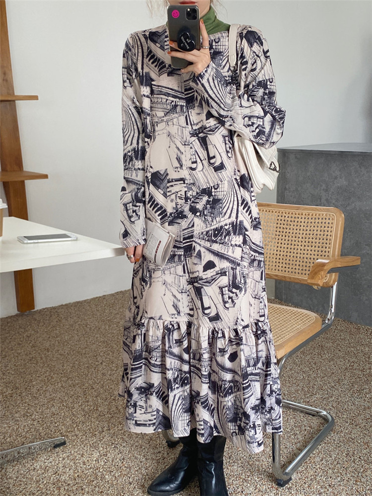 トレンド感溢れるアート風プリントが印象的な長袖ロングワンピースです。