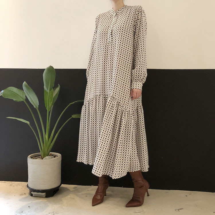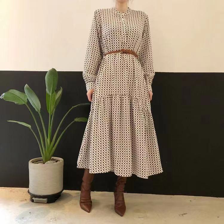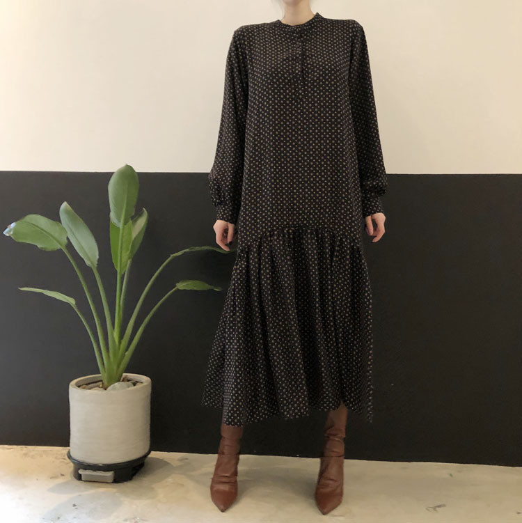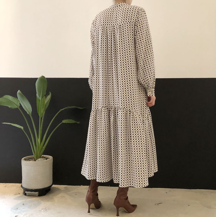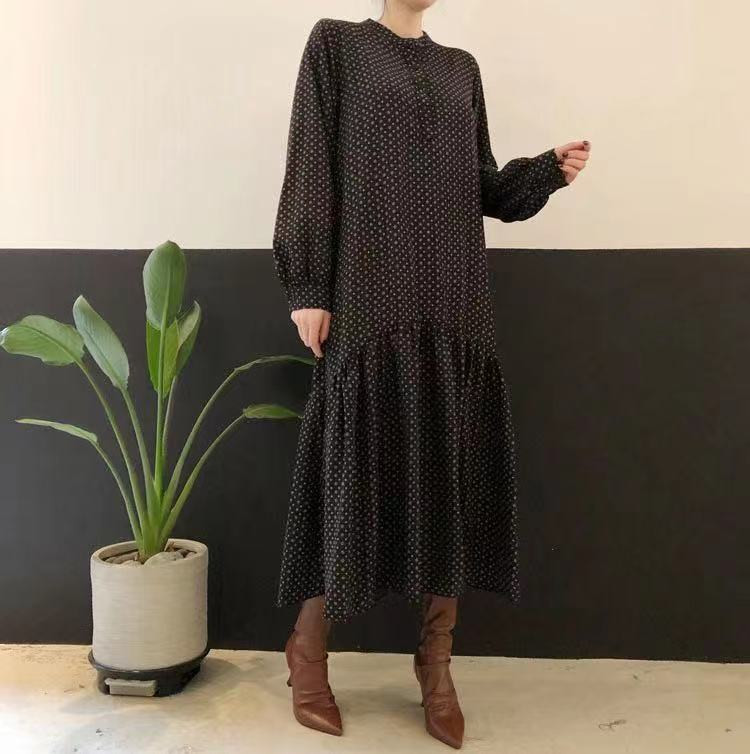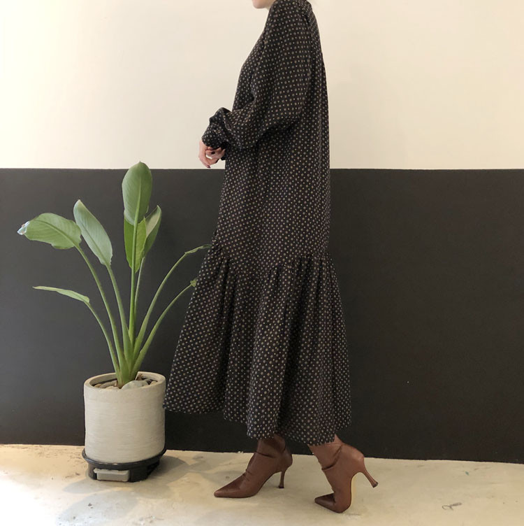 大人気のエレガントなフレアロングワンピース。 上品なドット柄でオフィスにもカジュアルにも活躍します。 ウエストベルト付きで美しいシルエットを演出。