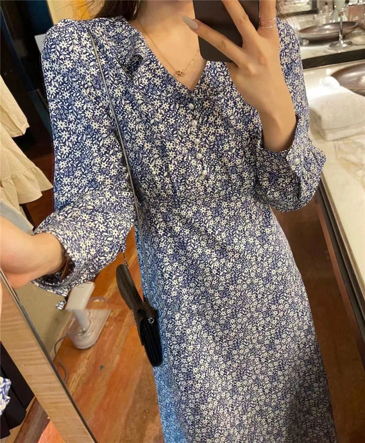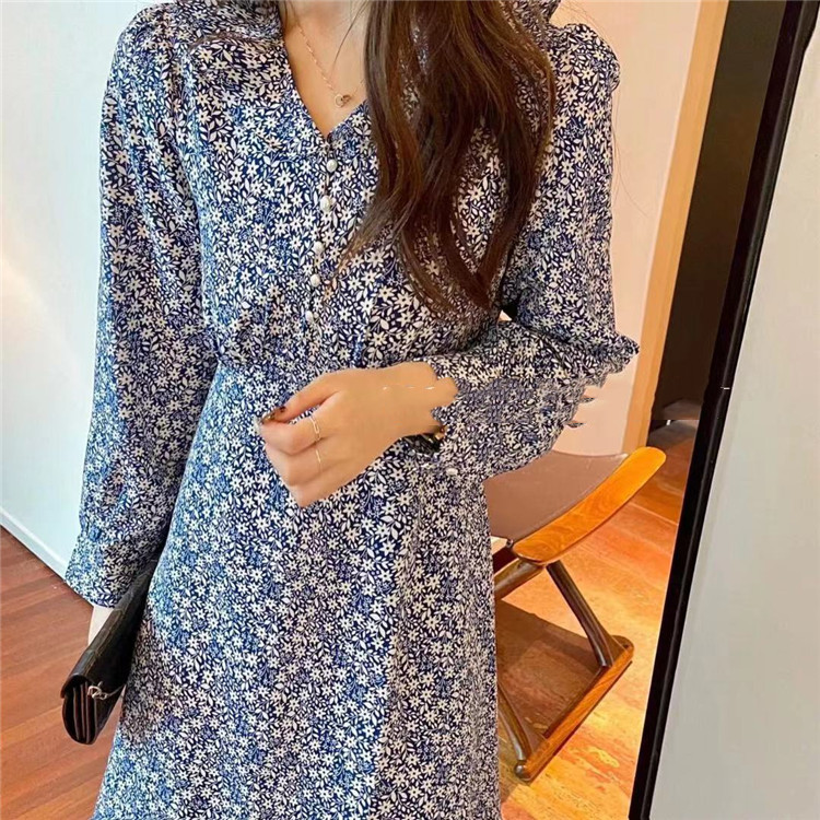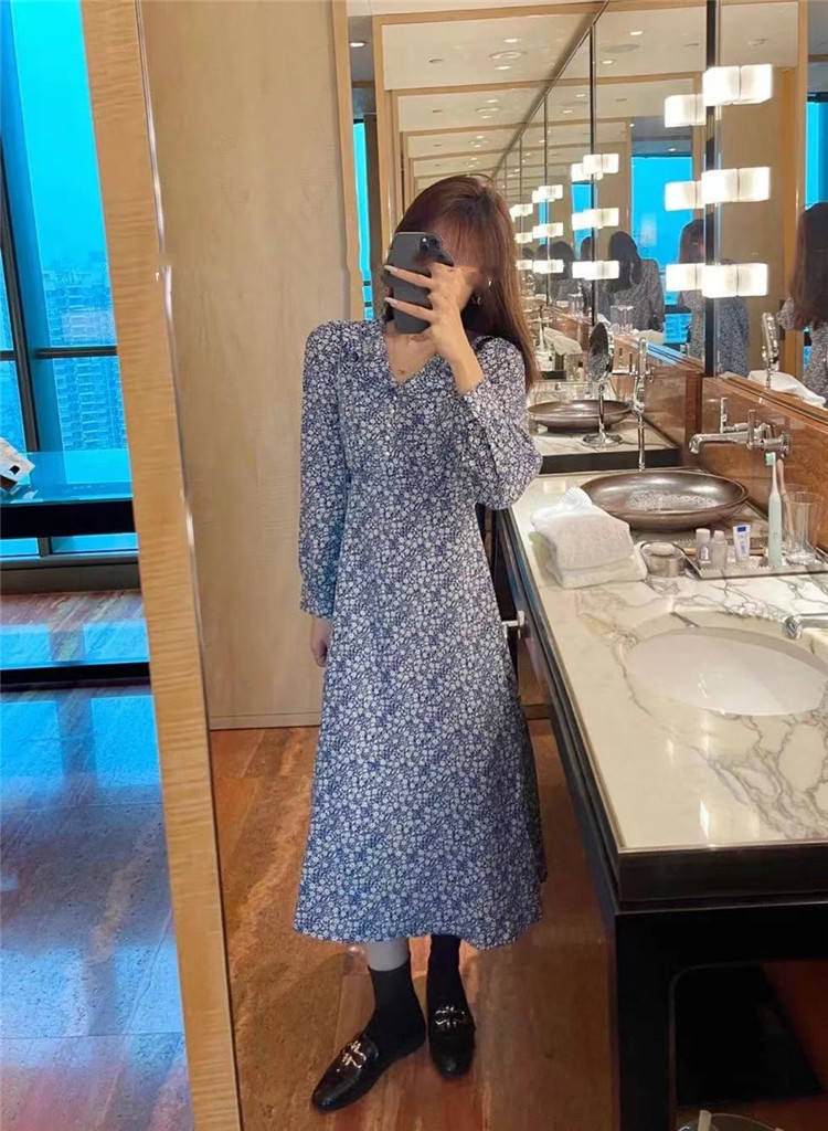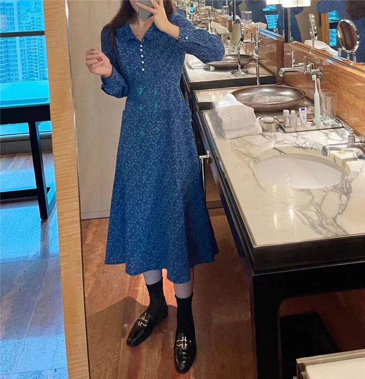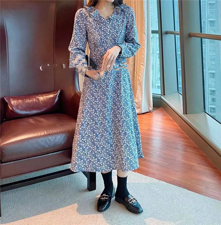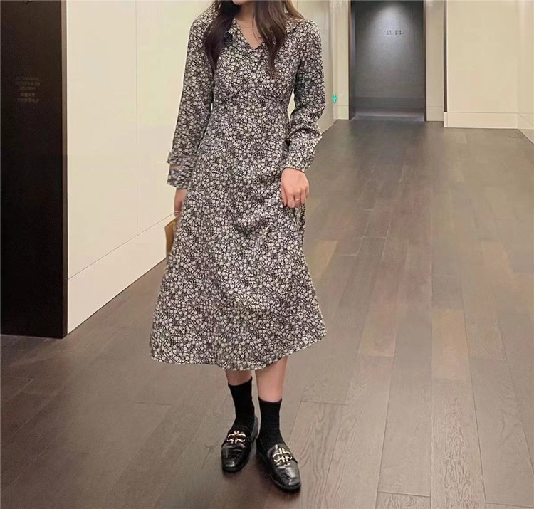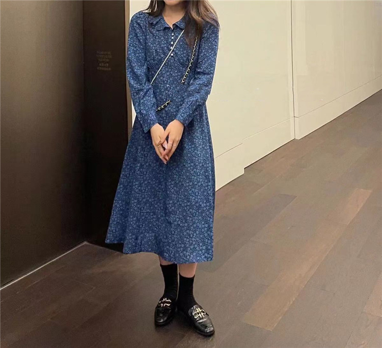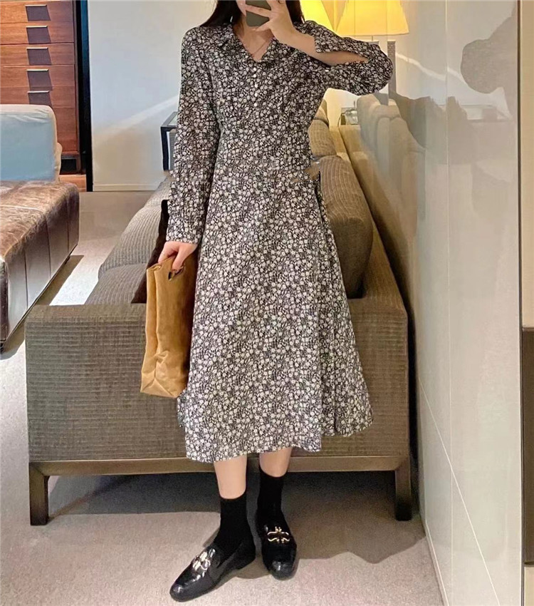 上品な小花柄プリントが魅力的なフレアロングワンピース。 長袖でカジュアルからレトロスタイルまで幅広く対応。 スリムなシルエットで体型をきれいに見せる効果抜群。 【素材】ポリエステル・コットン混紡 【カラー】黒・薄青・濃紺