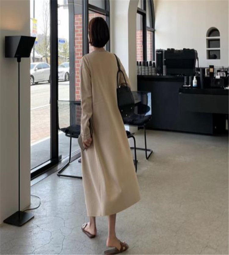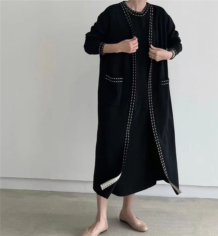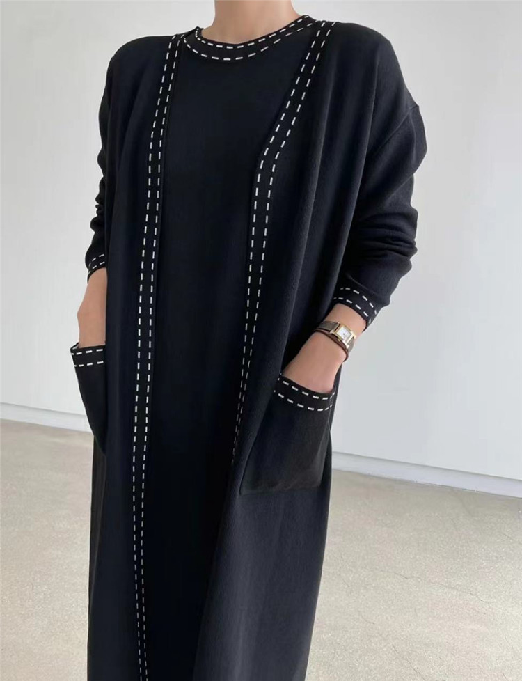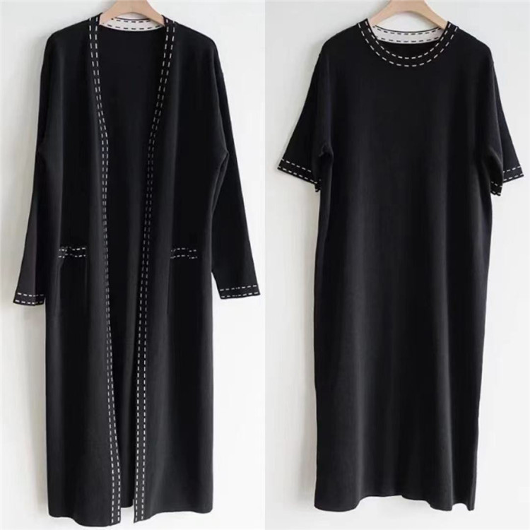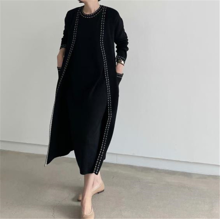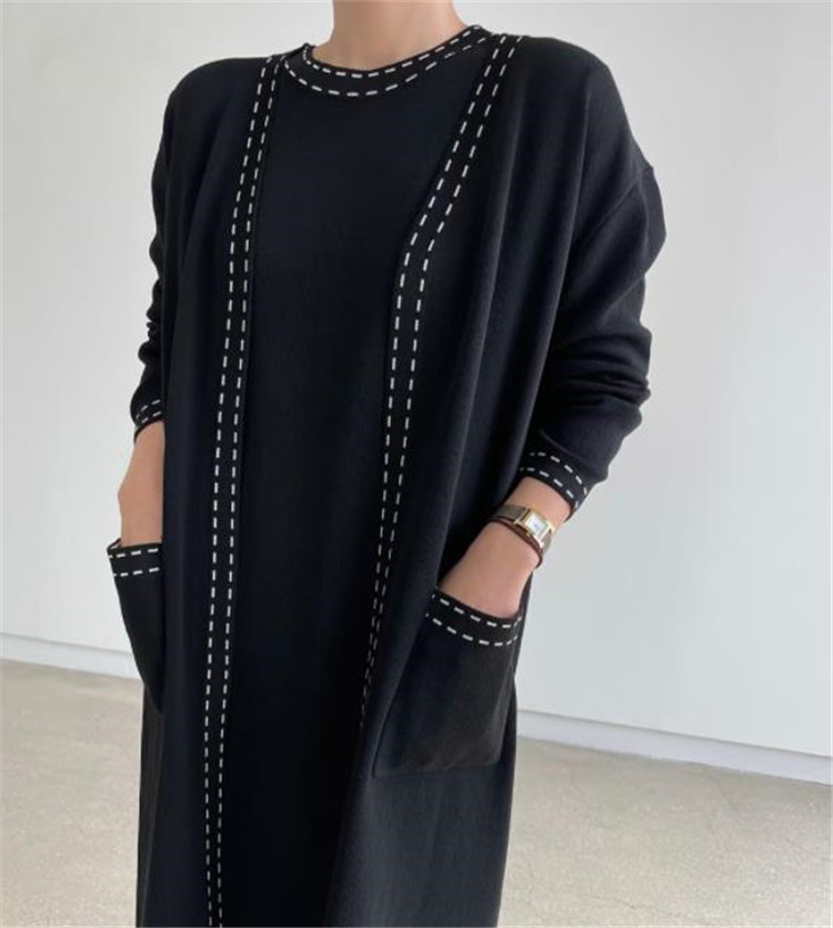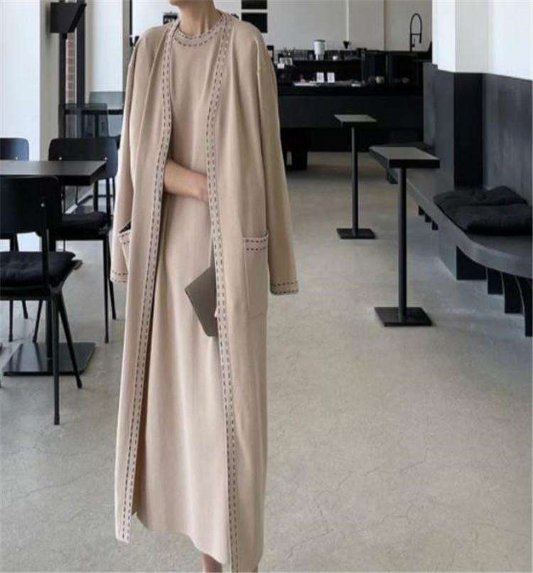 エレガントなニット素材のロングワンピースとカーディガンの2点セット。
