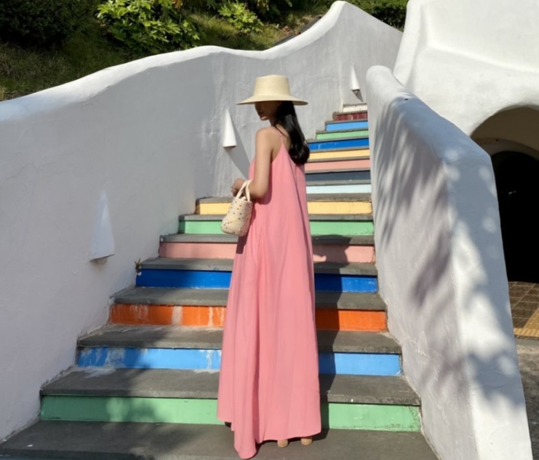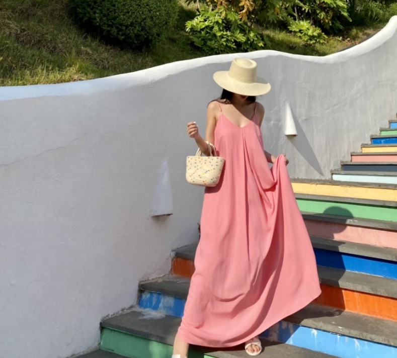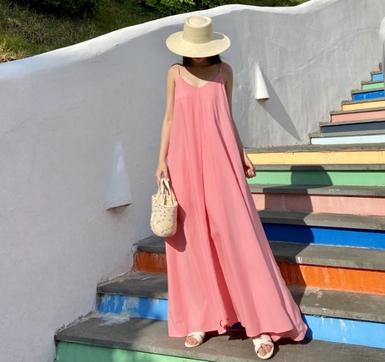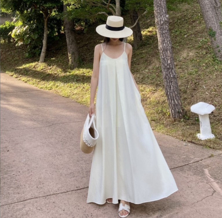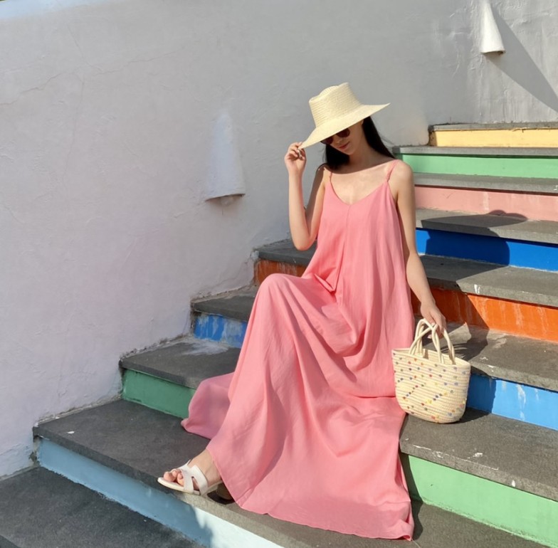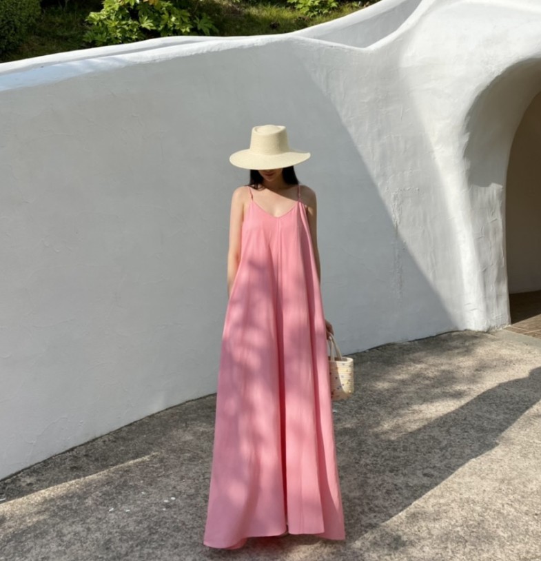 ロングワンピースならではの上品なシルエットで、リゾートシーンを素敵に演出します。