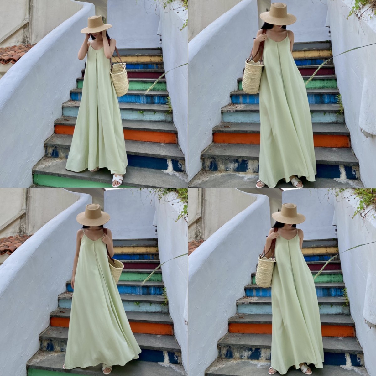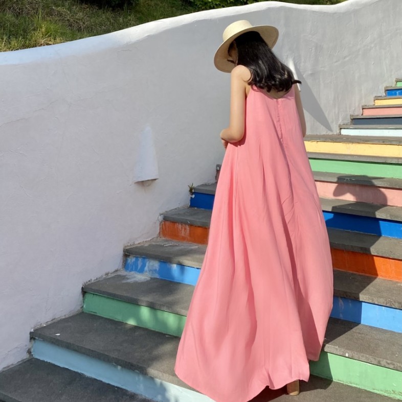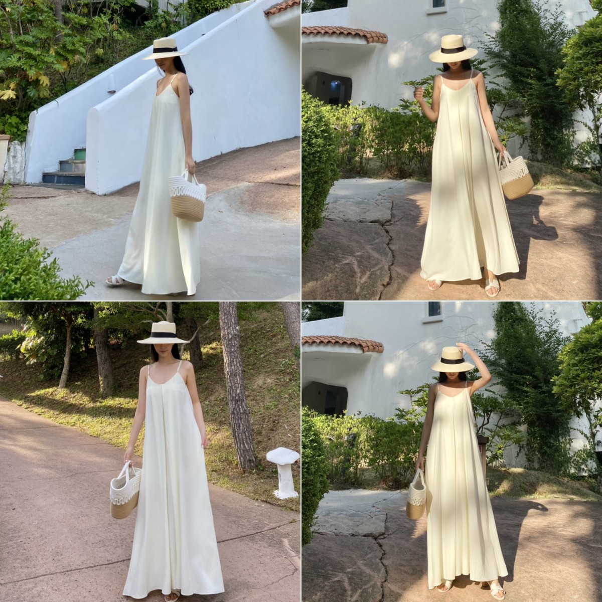 ロングワンピースならではの上品なシルエットで、リゾートシーンを素敵に演出します。