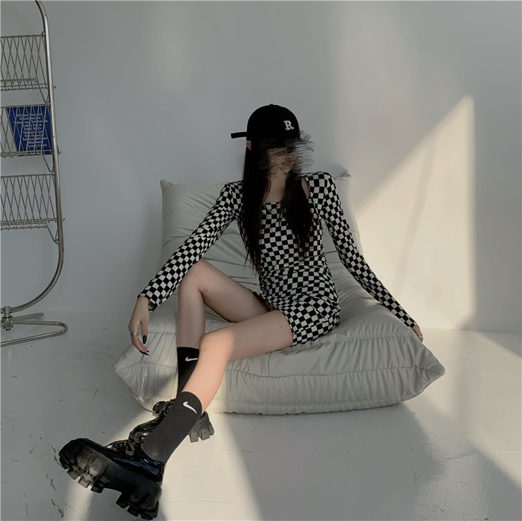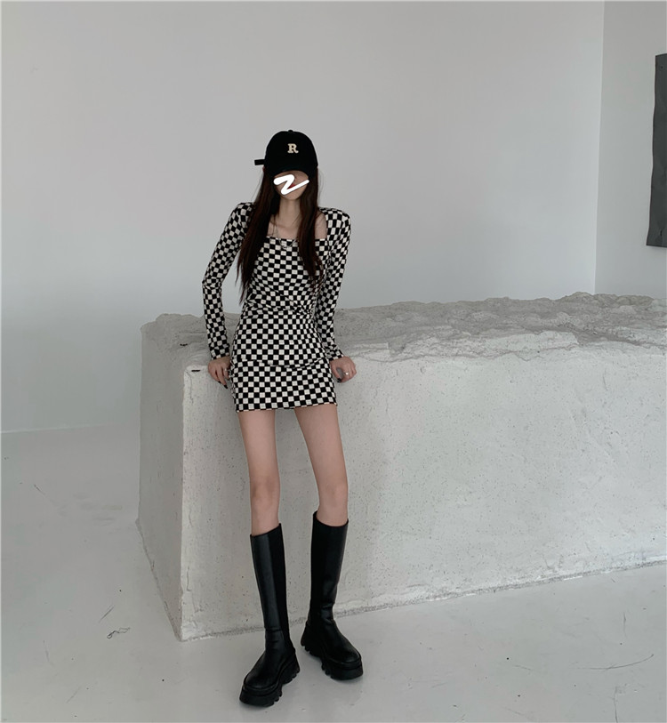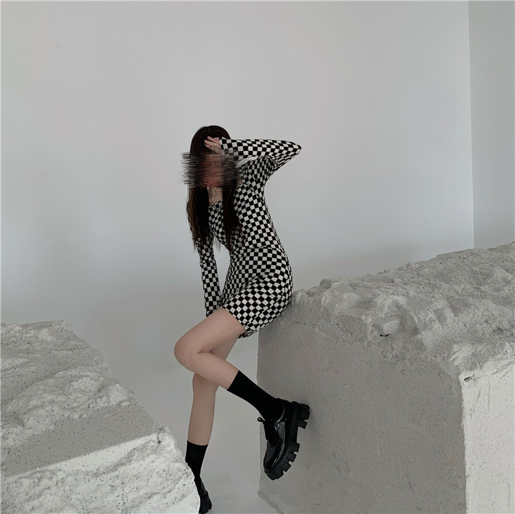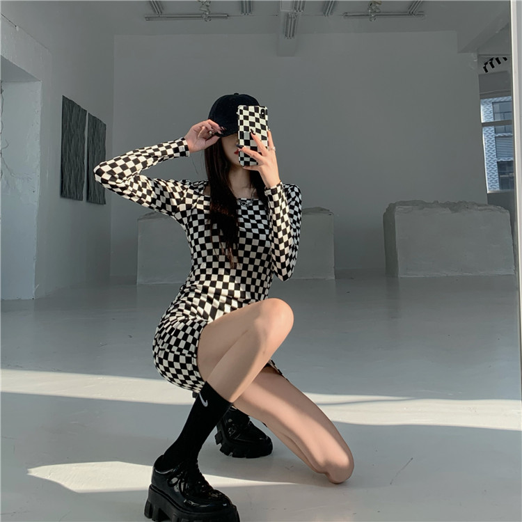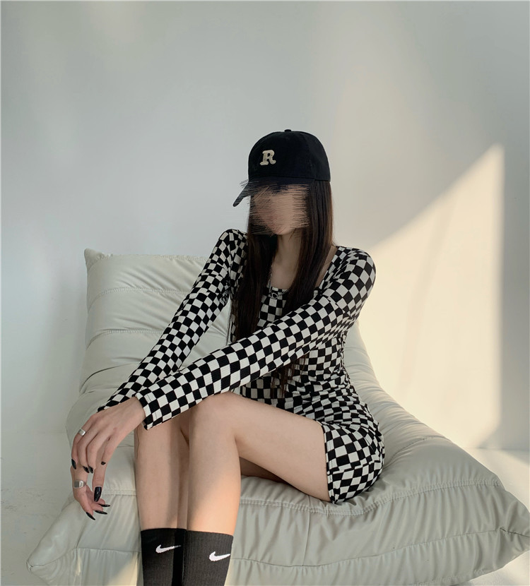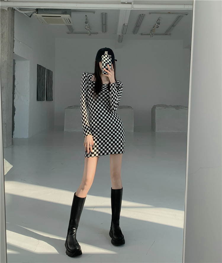 スタイリッシュな白黒チェック柄が印象的な長袖ワンピースです。