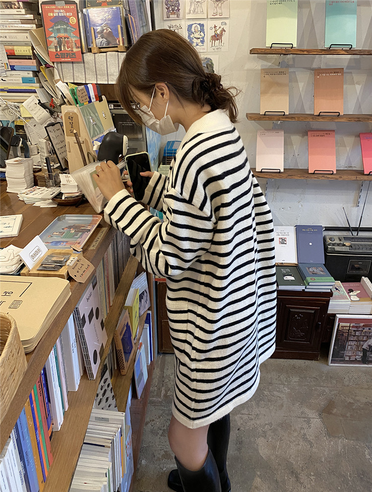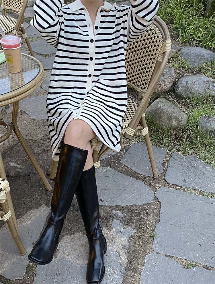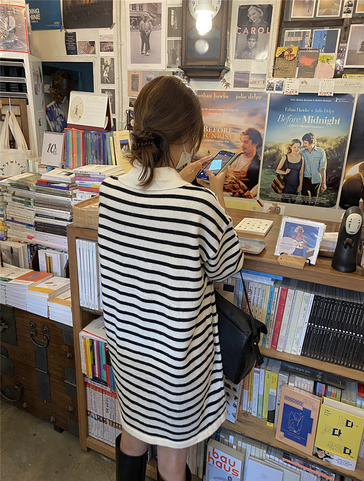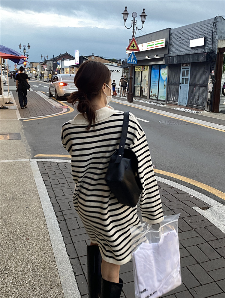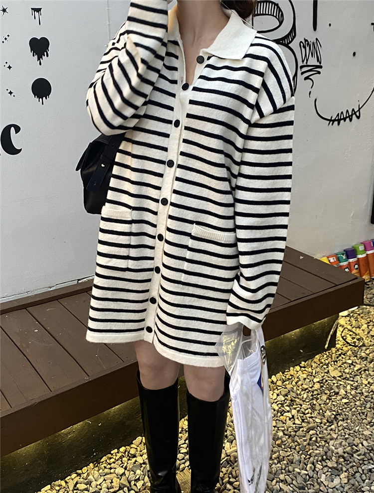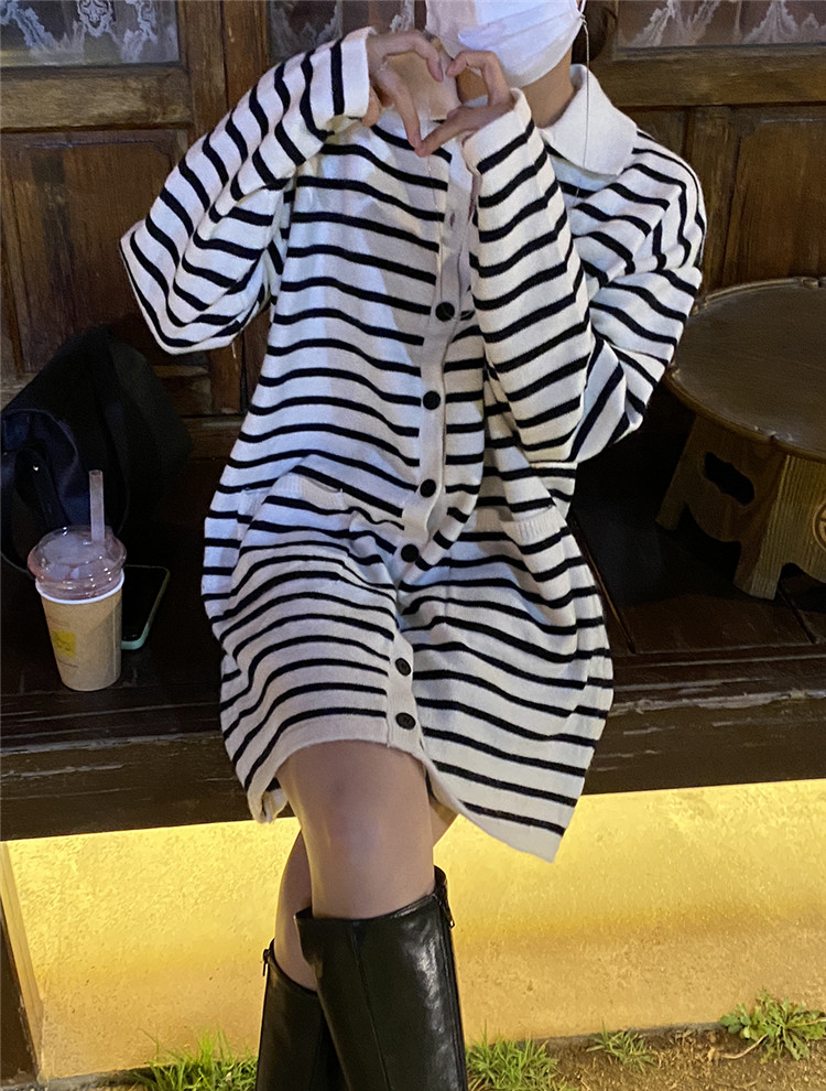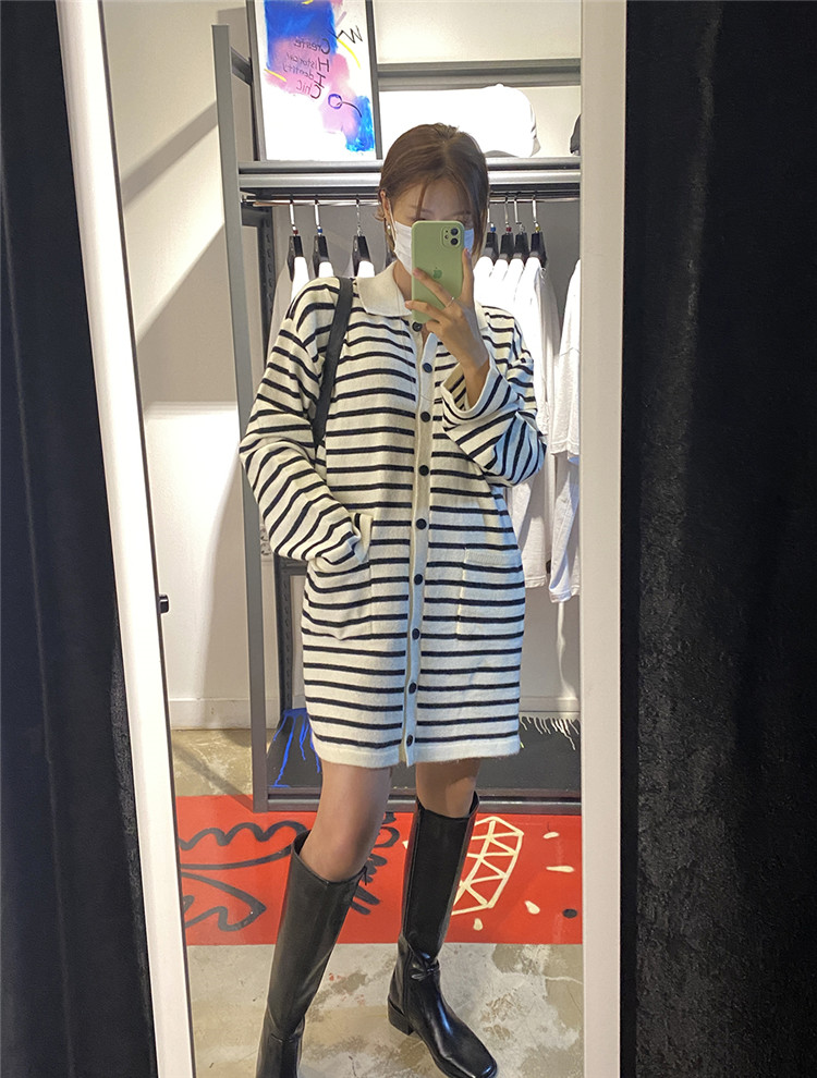 上品な襟付きデザインとボーダー柄が魅力的なニットシャツワンピース。