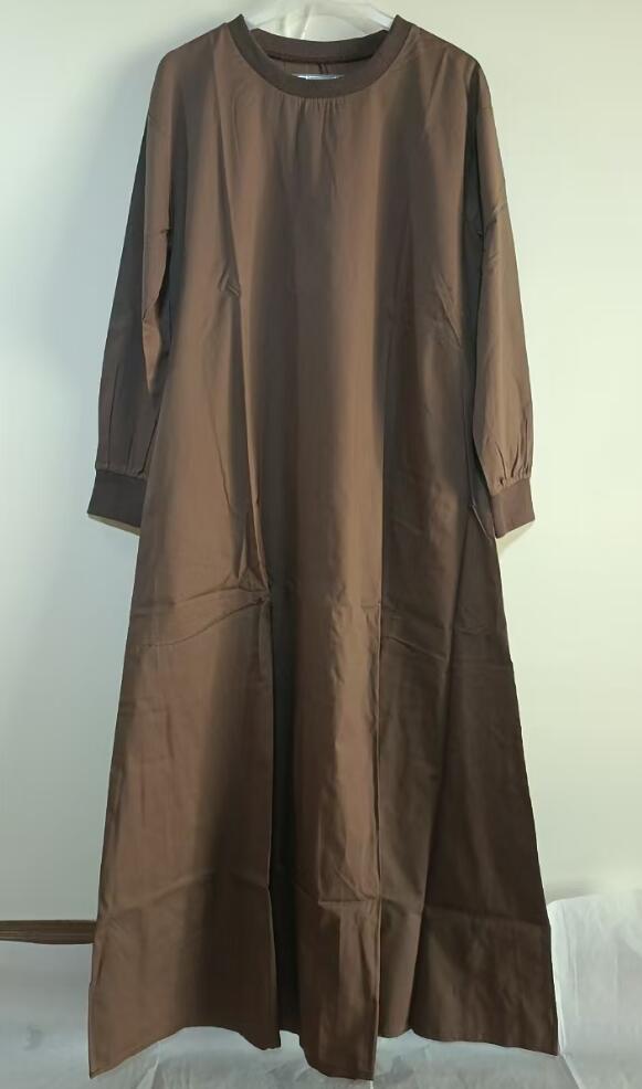 上品なブラウンカラーのフレアロングワンピースで、優雅で快適な着心地を実現します。
